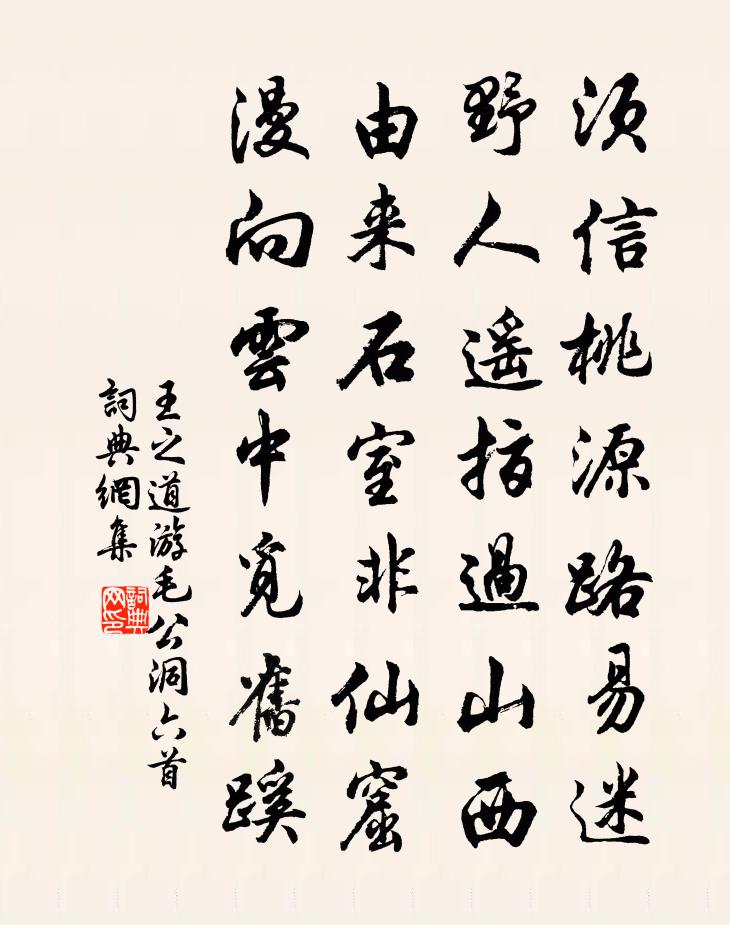 詩詞名句歷史字典書法欣賞書法字典國語詞典說文解字康熙字典古漢語字典標 題 作 者 詩 句 游毛公洞六首作者:王之道 朝代:宋代游毛公洞六首原文須信桃源路易迷,野人遙指過山西。由來石室非仙窟,漫向雲中覓舊蹊。詩詞問答問:游毛公洞六首的作者是誰?答:王之道問:游毛公洞六首寫於哪個朝代?答:宋代王之道游毛公洞六首書法欣賞游毛公洞六首書法作品詩詞推薦偈頌一百二十三首釋崇岳〔宋代〕月旦曰朔,月圓曰望。八字打開,有收有放。薩怛阿竭,二千年前。摩醯首羅,頂門正眼。覿面提持,生鐵門限。寓西馬塍宋伯仁〔宋代〕十畝荒林屋數間,門通小艇水灣灣。人行遠路多嫌僻,我得安居卻爾閒。樽酒相忘霜後菊,一詩難盡雨中山。何時滿庭芳(留別)劉褒〔宋代〕柳裊金絲,梨鋪香雪,一年春事方中。燭前一見,花艷覺羞紅。枕臂香痕未落,舟橫岸、作計匆匆。明朝去,暮天西齋秋日雜書五首方回〔宋代〕百間以買屋,萬卷以買書。書多讀不既,屋寬住有餘。彼索子錢者,日夜號庭除。勇銳割此物,煎迫姑少紓。老勿與林中書李禮部同宿囊山三首劉克莊〔宋代〕二妙相從寂寞濱,山靈怪有此嘉賓。作桑下夢才三宿,比橘中翁少一人。剪截錦機輸子巧,分張寶藏拔予貧。臨歧十日宋省齋有謂不及同登南山獨步烏聊山楊公遠〔宋代〕我輩登高嶮更遙,聞君獨步上烏聊。休嗟昨日渾無興,須信明年尚有條。節後黃花香未減,年高黑鬢雪偏饒。拂箋贈段七娘李白〔唐代〕羅襪凌波生網塵,那能得計訪情親。千杯綠酒何辭醉,一面紅妝惱 * 。題周功甫總領石溪三亭雪亭王炎〔宋代〕竹窗環佩聲瓏玲,開窗不見山眉青。玉妃翦水墮花片,龜手入袖膚粟生。紫茵錦幕燎爐熾,不知酒面寒欲冰。春蔥水調歌頭(飲蕪湖雄觀亭)魏庭玉〔宋代〕璧月掛銀漢,冷浸一江秋。天公付我清賞,仙籍桂香浮。極目江山如畫,際晚雲煙凝紫,秋色豁羈愁。領看上雄觀八月七日被命上會稽沿途所歷拙於省記為韻語魏了翁〔宋代〕風順潮平日腳收,錢塘江上遇中秋。堂堂背月爭門入,要把平安報冕旒,郴江百詠並序香山寺阮閱〔宋代〕十里城南古道場,一泓寒水翠微傍。幽人衲子時來汲,疑是山中草木香。詠竹煙張玉孃〔宋代〕數枝瀟漬碧溪寒,水氣冥冥日欲昏。青玉案前雙翡翠,紫絲帳裹萬琅玕。湘江舊事迷歸夢,陸海春陰無羽翰。晚來水閣朝霽,奉簡嚴雲安(一作雲安嚴明府)杜甫〔唐代〕東城抱春岑,江閣鄰石面。崔嵬晨雲白,朝旭射芳甸。雨檻臥花叢,風床展書卷。鉤簾宿鷺起,丸藥流鶯囀。呼婢挽蕭帥機虎溪文天祥〔宋代〕世以千金重,誰能學隱君。一門名似雨,滿座客如雲。志願生無憾,聲華死有聞。韓碑照原草,含笑有斯文。次韻胡彥明同年羇旅京師寄李子飛三章一章道黃庭堅〔宋代〕看除日月坐中銓,一歲應無官九遷。蔥韭盈盤市門食,詩書滿枕客床氈。留連節物孤朋酒,惱亂鄰翁謁子錢。誰料得片石著歲寒欄乾外二首錢時〔宋代〕梅竹交陰晚更奇,等閒片石亦相宜。此時亭上瀟瀟雨,牆外行人卻未知。歲朝轎中伊軋聲類櫓舟因感舊遊王志道〔宋代〕歲朝伊軋上藍輿,酷似當年在帝都。柔櫓數聲楊柳外,小舟逗曉過西湖。箕山許月卿〔宋代〕箕山惟一瓢,襄邑亦四壁。古今一許氏,傳家以清白。茶山與東萊,三詩映圭璧。後來二三賢,題品互紬繹。南軒雜劇·立成湯伊尹耕莘鄭光祖〔元代〕楔子(沖末扮東華仙領仙童上,雲)玉闕光輝滿太玄,瓊樓霞彩自幽然。崑崙照徹靈虛境,別是蓬壺一洞天。貧道和主司王起(一作和主司酬周侍郎)李潛〔唐代〕文學宗師心秤平,無私三用佐貞明。恩波舊是仙舟客,德宇新添月桂名。蘭署崇資金色重,蓮峰高唱玉音清。羽毛名句推薦野鴉無意緒,鳴噪自紛紛。杜甫《孤雁 / 後飛雁》 饒人不是痴漢,痴漢不會饒人。佚名《增廣賢文·上集》 獨憐幽草澗邊生,上有黃鸝深樹鳴。韋應物《滁州西澗》 鷦鷯尚存一枝,狡兔猶藏三窟羅貫中《三國演義·第六十回》 良馬難乘,然可以任重致遠;良才難令,然可以致君見尊。墨子《墨子·01章 親士》 而今燈漫掛。不是暗塵明月,那時元夜。蔣捷《女冠子·元夕》 紅粉當壚弱柳垂,金花臘酒解酴醿。賈至《春思二首》 樓外垂楊千萬縷。欲系青春,少住春還去。朱淑真《蝶戀花·送春》 城中桃李愁風雨,春在溪頭薺菜花。辛棄疾《鷓鴣天·陌上柔桑破嫩芽》 長太息以掩涕兮,哀民生之多艱。屈原《離騷》