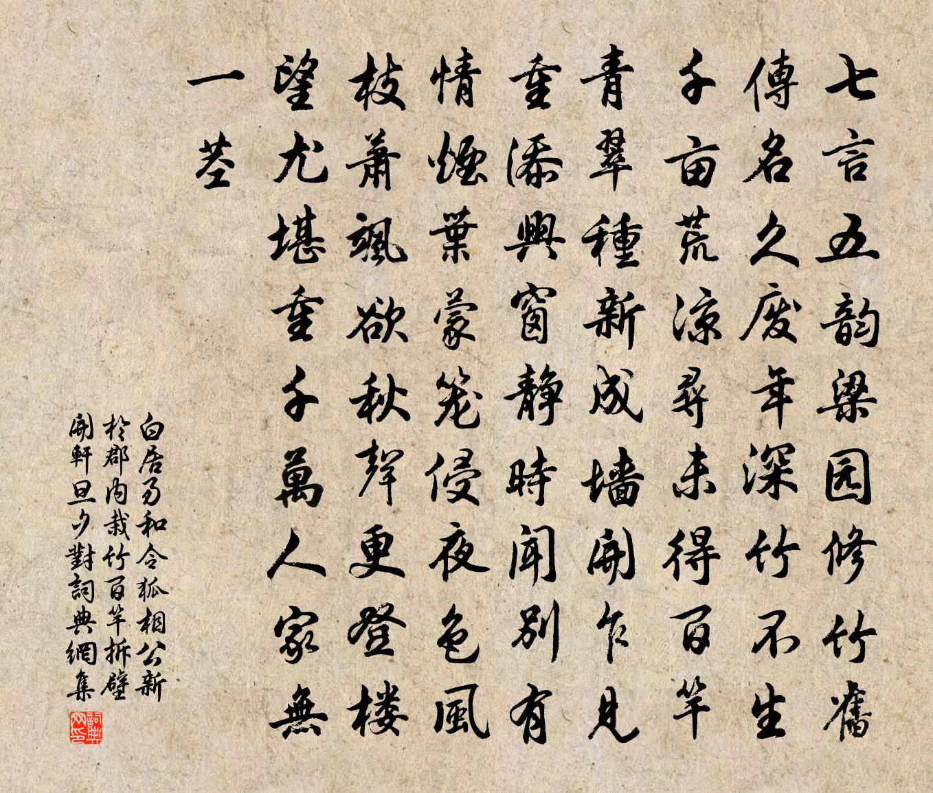 七言五韻梁園修竹舊傳名,久廢年深竹不生。千畝荒涼尋未得,百竿青翠種新成。