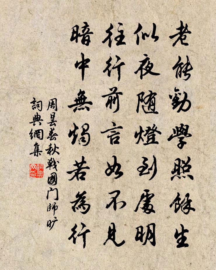 詩詞名句歷史字典書法欣賞書法字典國語詞典說文解字康熙字典古漢語字典標 題 作 者 詩 句 春秋戰國門師曠作者:周曇 朝代:唐代春秋戰國門師曠原文老能勸學照餘生,似夜隨燈到處明。往行前言如不見,暗中無燭若為行。詩詞問答問:春秋戰國門師曠的作者是誰?答:周曇問:春秋戰國門師曠寫於哪個朝代?答:唐代周曇春秋戰國門師曠書法欣賞春秋戰國門師曠書法作品注釋全唐詩:卷728-73詩詞推薦芳樹沈約〔南北朝〕發蕚九華隈。開跗寒露側。氤氳非一香。參差多異色。宿昔寒飈舉。摧殘不可識。霜雪交橫至。對之長嘆息。寒食劉克莊〔宋代〕聞道江鄉吹戰塵,叵堪鼙鼓震於鄰。荒城少有飛花處,高塚多無擘紙人。沙塞榆枯難取火,玉關柳少化為薪。遙知秋感陸游〔宋代〕聖世優容許乞身,歸來猶幸齒齊民。漁家那有懸車地,蔬食何施祝鯁人。獠婢臨溪漂衣絮,蠻童掃葉續炊薪。生涯竹浦漁歸石汝礪〔宋代〕釣罷收綸日既殘,扁舟一葉解登灣。長歌欸乃乘風去,鳴櫓咿啞趁月還。翡翠躍飛紅蓼內,鴛鴦驚起白苹間。賓士送馮學士入蜀王禹偁〔宋代〕錦川直共少年期,四十風情去未遲。蠶市夜歌欹枕處,峨嵋春雪倚樓時。休夸上直吟紅藥,多羨乘軺聽子規。莫學古戰處貫休〔唐代〕鬼氣蒼黃棘葉紅,昔時人血此時風。相憐極目無疆地,曾落將軍一陣中。酬師道雪夜見寄司馬光〔宋代〕玉樹交橫雪後天,銀河沉著斗欄乾。筆峰微結冰絲澀,燈暈初成花燼殘。太學先生氊苦薄,公車倦客履仍單。欲吟夏雨齊己〔唐代〕霮雨對蔽穹蒼,冥濛自一方。當時消酷毒,隨處有清涼。著物聲雖暴,滋農潤即長。乍紅縈急電,微白露殘陽。應郡齋水閣閒書流水文同〔宋代〕四首秦僧絕論,一篇楚客離騷。讀罷卻彈流水,先生此興尤高。題少潛兄得閒樓鑰〔宋代〕平日君多暇,如今我亦閒。人歸真得地,吏隱勝居山。煙浪一千頃,茅檐三四間。天寒倚修竹,空翠濕欹鬟。鑑湖晚歸張伯玉〔宋代〕會稽太守無事時,緩帶長作漁樵嬉。大航平榻引賓從,談笑晚從湖上歸。湖邊居望而簇簇,湖岸花木情依依。環峰熙州慢(贈述古·般涉調)張先〔宋代〕武林鄉,占第一湖山,詠畫爭巧。鷲石飛來,倚翠樓煙靄,清猿啼曉。況值禁垣師帥,惠政流入歡謠。朝暮萬景,偈頌八十五首釋妙倫〔宋代〕三張白紙,千里同風,此是古人吃不盡底涎唾。爭如瑞岩,將個季春極暄,換個孟夏漸熱。慶劉教授李劉〔宋代〕萬里秋風生桂枝,麒麟墮地有誰知。摩空早奏甘泉賦,取勢猶歌{左氵右半}水詩。好是桑蓬浮喜氣,正栽桃李助和歸工部送僧約(工部,歸登也,約,荊州人)韓愈〔唐代〕早知皆是自拘囚,不學因循到白頭。汝既出家還擾擾,何人更得死前休。歲暮閒韻四首張耒〔宋代〕歲暮柯山客,端居不出門。風煙限倨壤,閭井若荒村。江鳥占寒暑,樓笳報曉昏。風枝吹斷蔓,霜葉擁陳根。慷慨六月六日倪{奧下加山}庵坐雨陳著〔宋代〕山外黃塵不到門,南風松竹翠紛紛。暗中有虎村嗥合,夜半聞雞老睡分。帶得兒來同坐雨,飛歸家去欲排雲。收書野興陸游〔宋代〕涉澗穿林信意行,翠崖朱棧愜幽情。關關幽鳥將雛語,簌簌幽皇解籜聲。藉草一壺消永日,出門幾屐了平生。川雲對海棠懷江朝宗吳芾〔宋代〕我住湖山歲月賒,年年長醉海棠花。憶昨君來花未放,卻言花放定相過。亦欲花間同一醉,肯教垂老負陽和。東風宋可挹輓詩王炎〔宋代〕萬卷藏書富,千金市義多。斯人今止此,造物意如何。風月空投轄,煙波冷曬蓑。林間誰掛劍,清淚墮悲歌。名句推薦若待上林花似錦,出門俱是看花人。楊巨源《城東早春》 夢裡相思,故國王孫路。陳子龍《點絳唇·春日風雨有感》 共敵不如分敵,敵陽不如敵陰。佚名《三十六計·圍魏救趙》 西北望長安,可憐無數山辛棄疾《菩薩蠻·書江西造口壁》 誰憐旅愁荏苒。謾長門夜悄,錦箏彈怨。張炎《解連環·孤雁》 今我來思,雨雪霏霏。佚名《採薇》 桃李務青春,誰能貫白日。李白《長歌行》 鳳簫聲動,玉壺光轉,一夜魚龍舞。辛棄疾《青玉案·元夕》 善惡同,則功臣倦。黃石公《三略·上略》 洞房昨夜停紅燭,待曉堂前拜舅姑。朱慶餘《近試上張籍水部 / 近試上張水部 / 閨意獻張水部》