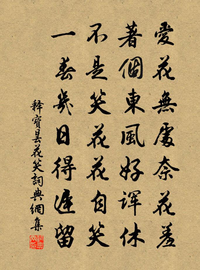 詩詞名句歷史字典書法欣賞書法字典國語詞典說文解字康熙字典古漢語字典標 題 作 者 詩 句 花笑作者:釋寶曇 朝代:宋代花笑原文愛花無處奈花羞,著個東風好諢休。不是笑花花自笑,一春幾日得遲留。詩詞問答問:花笑的作者是誰?答:釋寶曇問:花笑寫於哪個朝代?答:宋代釋寶曇花笑書法欣賞花笑書法作品詩詞推薦螢火趙蕃〔宋代〕渾忘生朽腐,直擬暮光輝。解燭書帷靜,能添列宿稀。當風方自表,帶雨忽成微。變滅無多理,榮枯會一歸。俞公岩陳摶〔宋代〕萬事若在手,百年聊稱情。他時南嶽去,記得此岩名。上巳日萬歲池上呈程詠之提刑范成大〔宋代〕濃春酒暖絳煙霏,漲水天平雪浪遲。綠岸翻鷗如北渚,紅塵躍馬似西池。麥苗剪剪嘗新面,梅子雙雙帶折枝。試比和趙大夫鹿鳴宴集陳師道〔宋代〕趙侯詩律近風騷,雅意推賢答聖朝。鴻雁著行過渭水,鳳凰覽德下虞韶。三千著籍今為盛,九萬論程不作遙。不讀南鄉子·搗衣顧貞觀〔清代〕嘹唳夜鴻驚,葉滿階除欲二更。一派西風吹不斷,秋聲,中有深閨萬里情。片石冷於冰,雨袖霜華旋欲凝。今夜戍頌證道歌證道歌釋印肅〔宋代〕不是等閒相誑惑,一失人身難再得。善根微細惡困多,地獄阿鼻無間隔。清修嶺張良臣〔宋代〕喪膽岩上人,怖死岩下人。周道自砥直,何枉不問津。人生貴適意,毋容矯吾真。淵明兀餘年,漉酒乃一巾。題趙西里詩卷二首劉克莊〔宋代〕紫芝仲白飛仙去,常恐英才不復生。人嘆斯文逢厄運,天留此老主齊盟。執鞭孰可為之御,序齒吾猶事以兄。未必鷺鷥杜牧〔唐代〕雪衣雪發青玉嘴,群捕魚兒溪影中。驚飛遠映碧山去,一樹梨花落晚風。次韻景純道中寄大成陳與義〔宋代〕聞道歌行伏李紳,古來賢守是詩人。久欽樂廣懷披霧,一見周瑜勝欽醇。海內期公黃合老,尊前容我白綸巾。佳篇奉述飛白書勢岑文本〔唐代〕六文開玉篆,八體曜銀書。飛毫列錦繡,拂素起龍魚。鳳舉崩雲絕,鸞驚游霧疏。別有臨池草,恩沾垂露餘。閨晚元稹〔唐代〕紅裙委磚階,玉爪朱橘。素臆光如砑,明瞳艷凝溢。調弦不成曲,學書徒弄筆。夜色侵洞房,春煙透簾出。新年自唱自和戴復古〔宋代〕聖朝開寶曆,淳佑四年春。生自前丁亥,今逢兩甲辰。黃粲一夢覺,青鏡二毛新。七十八歲叟,乾坤有幾人。柳梢青(次韻趙德莊)管鑒〔宋代〕神仙墮謫。天為賦與,經綸才識。蓋代聲名,宗英惟向,翰林頌白。黃堂一笑留客。算此處、淹留未得。且對清尊次韻虞退夫除夕七絕句魏了翁〔宋代〕將軍元自敬延年,明主何曾棄浩然。自分康時了無策,故山多少未芸田。偈七首釋道顏〔宋代〕一葉落,天下秋。一塵起。大地收。鳥窠吹布毛,便有人悟去。今時學者,為甚麼卻不識自己。謁金門劉仲尹〔元代〕簾半。四座綠圍紅簇。歌盡玉台連夜燭。歡緣仍恨促。休唱蓮舟新曲。煙水畫船搖綠。腸斷鴛鴦三十六。紫蒲相【中呂】陽春曲_知幾知榮知白樸〔元代〕知幾知榮知辱牢緘口,誰是誰非暗點頭。詩書叢里且淹留。閒袖手,貧煞也風流。今朝有酒今朝醉,且盡樽前有限二月初十日自荻浦絕湖三首趙蕃〔宋代〕二月風濤壯,扁舟性命輕。白頭高浪接,青眼遠山橫。客子空懷怖,漁家自樂生。須渠一杯酒,助我五言城。古龍屏風曾極〔宋代〕乘雲遊霧過江東,繪事當年笑葉公。可恨橫空千丈勢,剪裁今入小屏風。名句推薦小住京華,早又是,中秋佳節。秋瑾《滿江紅·小住京華》 淚眼倚樓頻獨語。雙燕飛來,陌上相逢否?馮延巳《鵲踏枝·幾日行云何處去》 想見廣寒宮殿,正雲梳風掠。辛棄疾《好事近·中秋席上和王路鈐》 居庸關上子規啼,飲馬流泉落日低。朱彝尊《出居庸關》 江雨霏霏江草齊,六朝如夢鳥空啼。韋莊《台城》 己欲立而立人,己欲達而達人。孔子弟子《論語·雍也篇》 唯明主為能愛其所愛,闇主則必危其所愛。荀子《荀子·君道》 遊說萬乘苦不早,著鞭跨馬涉遠道。李白《南陵別兒童入京》 客醉倚河橋,清光愁玉簫。高觀國《菩薩蠻·何須急管吹雲暝》 相逢成夜宿,隴月向人圓。杜甫《宿贊公房》