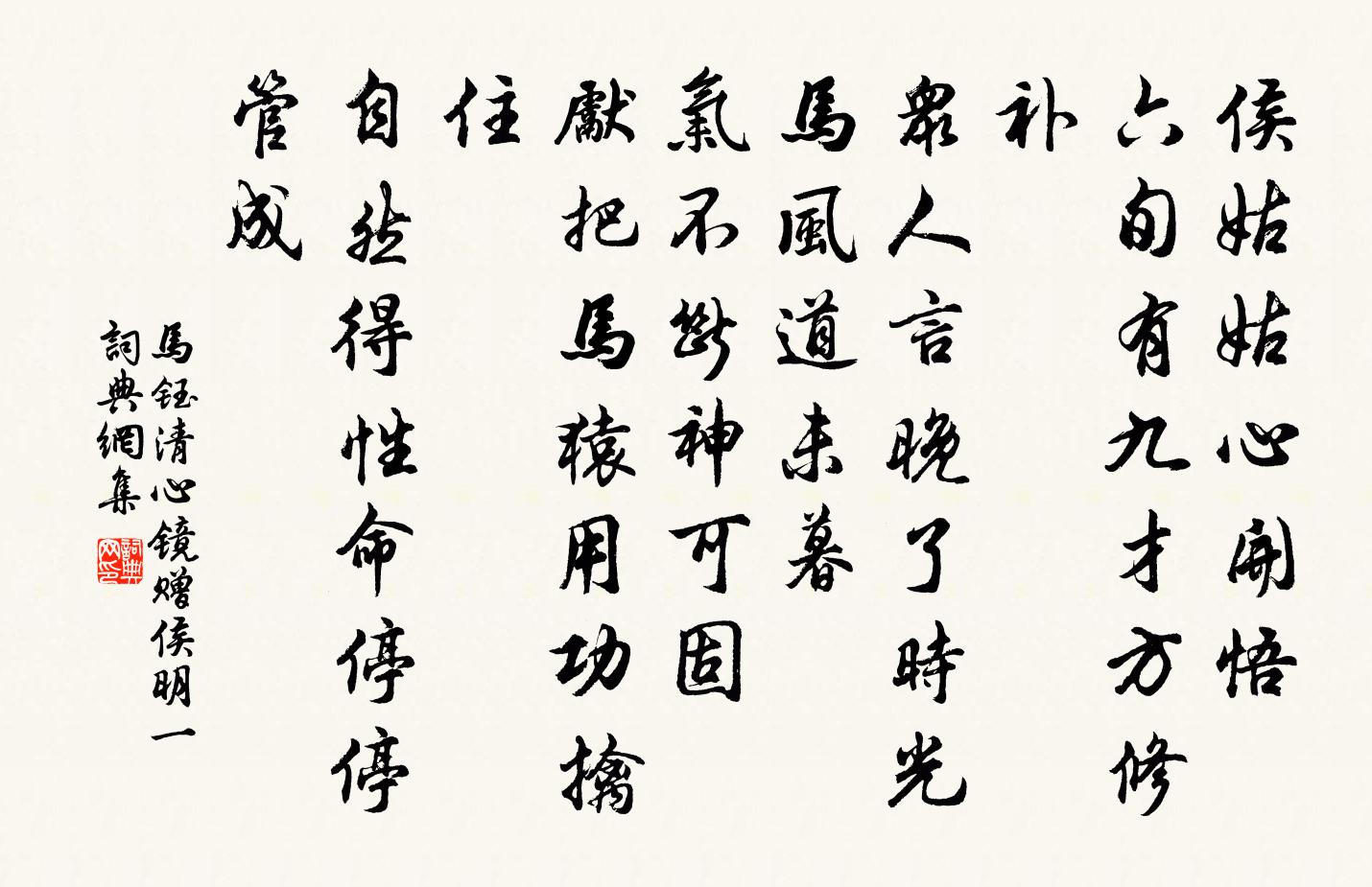詩詞名句歷史字典書法欣賞書法字典國語詞典說文解字康熙字典古漢語字典標 題 作 者 詩 句 清心鏡 贈侯明一作者:馬鈺 朝代:元代清心鏡 贈侯明一原文侯姑姑,心開悟。六旬有九,才方修補。眾人言、晚了時光,馬風道未暮。氣不斷,神可固。先把馬猿,用功擒住。自然得、性命停停,管成詩詞問答問:清心鏡 贈侯明一的作者是誰?答:馬鈺問:清心鏡 贈侯明一寫於哪個朝代?答:元代問:清心鏡 贈侯明一是什麼體裁?答:詞馬鈺清心鏡 贈侯明一書法欣賞清心鏡 贈侯明一書法作品詩詞推薦清明前呈南塘衛宗武〔宋代〕晚景淒涼事事休,與波上下任沉浮。花辰歲歲惟添花,榆火春春不改愁。幾曲畫屏新綠暗,一川流玉落紅稠。出門歸思黃滔〔唐代〕薊北風煙空漢月,湘南雲水半蠻邊。寒為旅雁暖還去,秦越離家可十年。詠史詩汨羅胡曾〔唐代〕襄王不用直臣籌,放逐南來澤國秋。自向波間葬魚腹,楚人徒倚濟川舟。奉和早登太行山中言志應制張嘉貞〔唐代〕明發扈山巔,飛龍高在天。山南平對鞏,山北遠通燕。瞻彼岡巒峻,憑茲士馬妍。九圻行若砥,萬谷輾如川。羅網有別二首陸龜蒙〔唐代〕且將絲糹乍系蘭舟,醉下煙汀減去愁。江上有樓君莫上,落花隨浪正東流。池上已看鶯舌默,雲間應即雁翰開。唯品令 清明夜,夢酒間唱田不伐映竹園啼鳥樂元好問〔金代〕西齋向曉。窗影動、人聲悄。夢中行處,數枝臨水,幽花相照。把酒長歌,猶記竹間啼鳥。風流易老。更常被、閒戲答俞清老道人寒夜三首黃庭堅〔宋代〕牧羊金華山,早通玉帝籍。至今風低草,戢戢見白石。金華風煙下,亦有君履跡。何為紅塵里,頜須欲雪白。鵲橋仙(□□立春)郭應祥〔宋代〕泥牛擊罷,銀幡卸了,又是一番春至。有人耳畔語低低,道宜入、新年吉利。堆盤紅縷,浮杯綠蟻,自有及時風味頌釋自圓〔宋代〕南北東西萬萬千,乾坤上下兩無邊。相逢相見呵呵笑,屈指抬頭月半天。頌古三十一首釋如本〔宋代〕寶壽開堂推出僧,棒頭有眼要分明。滿城人瞎誰能曉,今古清風匝地生。入若耶溪王籍〔南北朝〕艅艎何泛泛,空水共悠悠。陰霞生遠岫,陽景逐回流。蟬噪林逾靜,鳥鳴山更幽。此地動歸念,長年悲倦遊。好女兒晏幾道〔宋代〕綠遍西池,梅子青時。盡無端、盡日東風惡。更霏微細雨,惱人離恨,滿路春泥。應是行雲歸路,有閒淚、灑相思虞美人趙彥端〔宋代〕凌虛風馬來無跡。水淨山光出。松間孤鶴睡殘更。喚起緱簫飛去、與雲平。新亭聊共豐年悅。一醉中秋月。江山擬贈趙月麓之霅衛宗武〔宋代〕乍合成乍離,歲月何飄忽。重來吾愈老,喜復遂良覿。月麓號新改,簪裳亦殊昔。議論羲皇前,咳唾煙霞出。囊中同長安君鍾山望王安石〔宋代〕解裝相值得留連,一望江南萬里天。殘雪離披山韞玉,新陽杳靄草含煙。餘生不足償多病,樂事應須委少年。惟有和劉景文雪蘇軾〔宋代〕占雨又得雪,龜寧欺我哉。似知吾輩喜,故及醉中來。童子愁冰硯,佳人苦膠杯。那堪李常侍,入蔡夜銜枚。過顯濟廟前石磯竹枝詞二首楊萬里〔宋代〕大磯愁似小磯愁,篙稍寬時船即流。橕得篙頭都是血,一磯又復在前頭。宮詞王珪〔唐代〕石刻蛟螭扶繡柱,金盤龍鳳走雕楹。萬年枝上流鶯囀,屏掩春山夢不成。堂中安奉高宗壽皇今上御書碑張鎡〔宋代〕路轉修林特地殊,九光霞氣羃仙廬。蒼瑤不刻飛天篆,儘是三清玉帝書。題李賓客舊居李虞〔唐代〕逢時不得致昇平,豈是明君忘姓名。眼暗發枯緣世事,今來無淚哭先生。名句推薦神人之言微,聖人之言簡,賢人之言明,眾人之言多,小人之言妄。陳繼儒《小窗幽記·集醒篇》 絕頂茅庵里,老衲正孤吟。納蘭性德《水調歌頭·題西山秋爽圖》 孔子亦矙其亡也,而往拜之。孟子《孟子·滕文公章句下·第七節》 別後不知君遠近。觸目淒涼多少悶。歐陽修《玉樓春·別後不知君遠近》 山中相送罷,日暮掩柴扉。王維《送別 / 山中送別 / 送友》 池花春映日,窗竹夜鳴秋。李白《謝公亭·蓋謝朓范雲之所游》 將受命之日則忘其家,臨軍約束則忘其親,援枹鼓之急則忘其身。司馬遷《史記·七十列傳·司馬穰苴列傳》 細草微風岸,危檣獨夜舟。杜甫《旅夜書懷》 殘燈明滅枕頭欹,諳盡孤眠滋味。范仲淹《御街行·秋日懷舊》 閒立春塘煙淡淡,靜眠寒葦雨颼颼。鄭谷《鷺鷥》