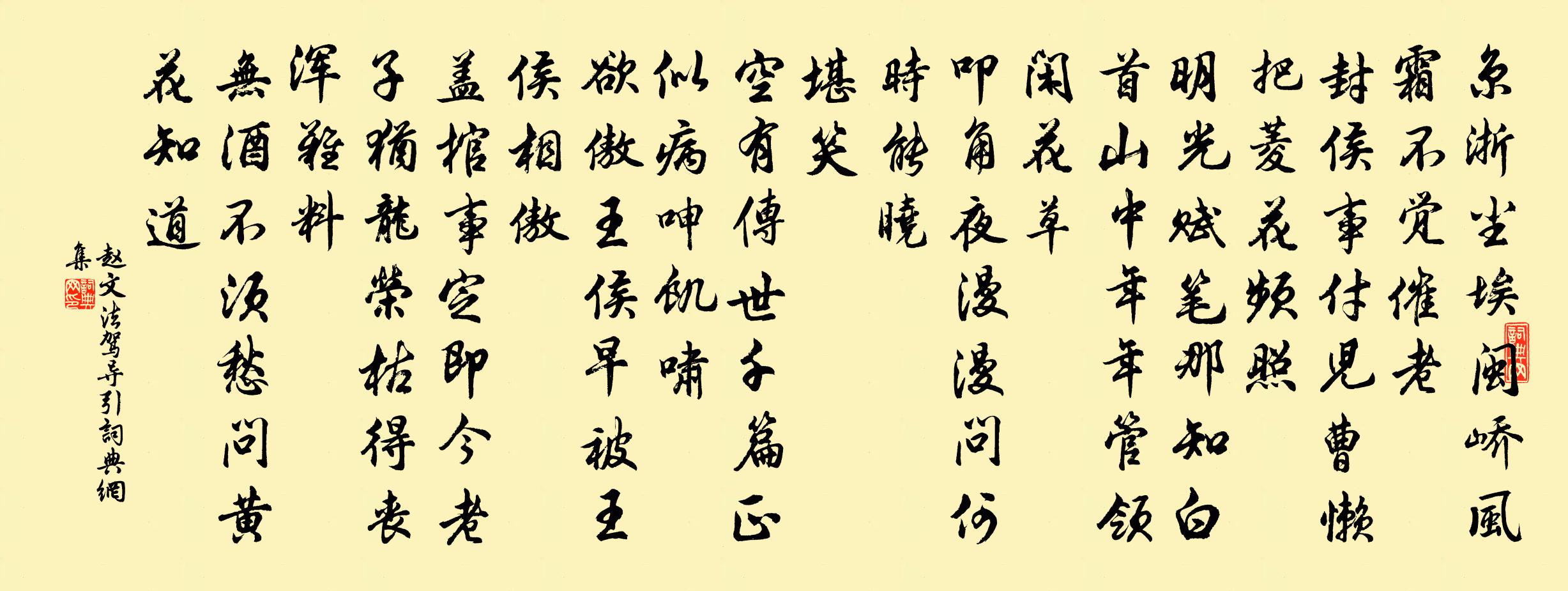 詩詞名句歷史字典書法欣賞書法字典國語詞典說文解字康熙字典古漢語字典標 題 作 者 詩 句 法駕導引作者:趙文 朝代:宋代法駕導引原文京浙塵埃,閩嶠風霜,不覺催老。封侯事付兒曹,懶把菱花頻照。明光賦筆,那知白首山中,年年管領閒花草。叩角夜漫漫,問何時能曉。堪笑。空有傳世千篇,正似病呻飢嘯。欲傲王侯,早被王侯相傲。蓋棺事定,即今老子猶龍,榮枯得喪渾難料。無酒不須愁,問黃花知道。詩詞問答問:法駕導引的作者是誰?答:趙文問:法駕導引寫於哪個朝代?答:宋代問:法駕導引是什麼體裁?答:詞趙文法駕導引書法欣賞法駕導引書法作品詩詞推薦曲江章碣〔唐代〕日照香塵逐馬蹄,風吹浪濺幾回堤。無窮羅綺填花徑,大半笙歌占麥畦。落絮卻籠他樹白,嬌鶯更學別禽啼。只緣首尾吟邵雍〔宋代〕堯夫非是愛吟詩,詩是堯夫有愧時。空受半來天下拜,卻無些子自家為。心能盡處我 * ,力不周時人亦知。只恨水調歌頭(春壽太守)佚名〔宋代〕遲日籠晴書,新火斂余寒。東君著意,留戀春色在人間。故遣蓬瀛仙侶,來布陽和德澤,造化寄毫端。麾節經行處村飲陸游〔宋代〕買來新兔不論錢,釣得鮮鱗細柳穿。野店渾頭更醇釅,一杯放手已醺然。偶作寄王秘書齊己〔唐代〕七絲湘水秋深夜,五字河橋日暮時。借問秘書郎此意,靜彈高詠有誰知。留題石經院三首蘇轍〔宋代〕盤曲山前路,流年向此消。興亡須一吊,范叟臥山腰。寧茵事諺佚名〔唐代〕鵓鳩樹上鳴,意在麻子地。懷伊川郊居李德裕〔唐代〕衰疾常懷土,郊園欲掩扉。雖知明目地,不及有身歸。鞏樹秋陰遍,伊原霽色微。此生看白首,良願已應違。晉蒲葵扇孫元晏〔唐代〕拋舍東山歲月遙,幾施經略挫雄豪。若非名德喧寰宇,爭得蒲葵價數高。銅雀硯楊萬里〔宋代〕摸索陶泓不忍研,阿瞞故物尚依然。浪傳銅雀檐間瓦,恐是金鳧海底磚。夏雲峰(歇指調)柳永〔宋代〕宴堂深。軒楹雨,輕壓暑氣低沈。花洞彩舟泛斝,坐繞清潯。楚颱風快,湘簟冷、永日披襟。坐久覺、疏弦脆管,清平調·其一李白〔唐代〕雲想衣裳花想容,春風拂檻露華濃。 若非群玉山頭見,會向瑤台月下逢。松江俞桂〔宋代〕香飄菡萏短篷中,水色山光一樣同。行止又非人所料,今年兩度上垂虹。初夏客懷釋行海〔宋代〕塞雁南來已北歸,鄉心空逐暮雲飛。楝花落盡寒猶在,月下金波點客衣。頌古三十六首釋惟一〔宋代〕發機外機,遣句中句。明眼衲僧,不知落處。和林處士梅詩八首劉學箕〔宋代〕芳菲猶未露香妍,已是梅開溪上園。香靜細參花外意,眼明應笑霧中昏。自憐拙思污吟筆,誰賦新詩人夢魂。風味南鄉子李之儀〔宋代〕睡起繞回塘。不見銜泥燕子忙。前日花梢都綠遍,西牆。猶有輕風遞暗香。步懶恰尋床。臥看遊絲到地長。自恨無送澶州錄曹宋參軍陳師道〔宋代〕宦遊男子事,訪別故人情。能吏於今少,春風及此行。英雄余戰伐,犴獄寄廉平。未肯輕衰疾,人來闕寄聲。落花落(以下詩集不載)王勃〔唐代〕落花落,落花紛紛漠。綠葉青跗映丹萼,與君裴回上金閣。影拂妝階玳瑁筵,香飄舞館茱萸幕。落花飛,撩亂入中揚司理章公輓詩虞儔〔宋代〕宦遊曾記舊桐川,泮水淒涼愧鄭虔。怪得儒流有師法,知從鄉老得心傳。未酬龍伯連鰲手,遽作維揚跨鶴仙。太息名句推薦萬里橋西一草堂,百花潭水即滄浪。杜甫《狂夫》 殘柳宮前空露葉,夕陽川上浩煙波。劉滄《經煬帝行宮》 時不可失,喪不可久左丘明《國語·晉語·里克殺奚齊而秦立惠公》 何處秋風至?蕭蕭送雁群。劉禹錫《秋風引》 到頭來,依舊是風塵骯髒違心愿。曹雪芹《紅樓夢·第五回》 嗟余聽鼓應官去,走馬蘭台類轉蓬。李商隱《無題·昨夜星辰昨夜風》 立非常之事,必俟非常之人。令狐德棻《周書·列傳·卷十四》 曾苦傷春不忍聽,鳳城何處有花枝李商隱《流鶯》 泉眼無聲惜細流,樹陰照水愛晴柔楊萬里《小池》 布帛尋常,庸人不釋。韓非及後人《韓非子·五蠹》