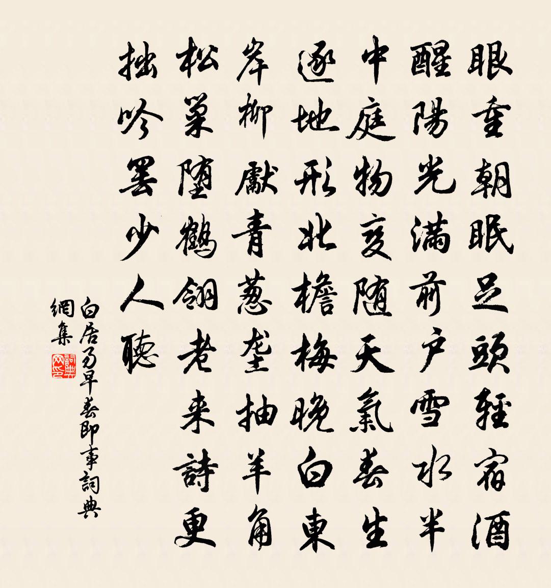 眼重朝眠足,頭輕宿酒醒。陽光滿前戶,雪水半中庭。