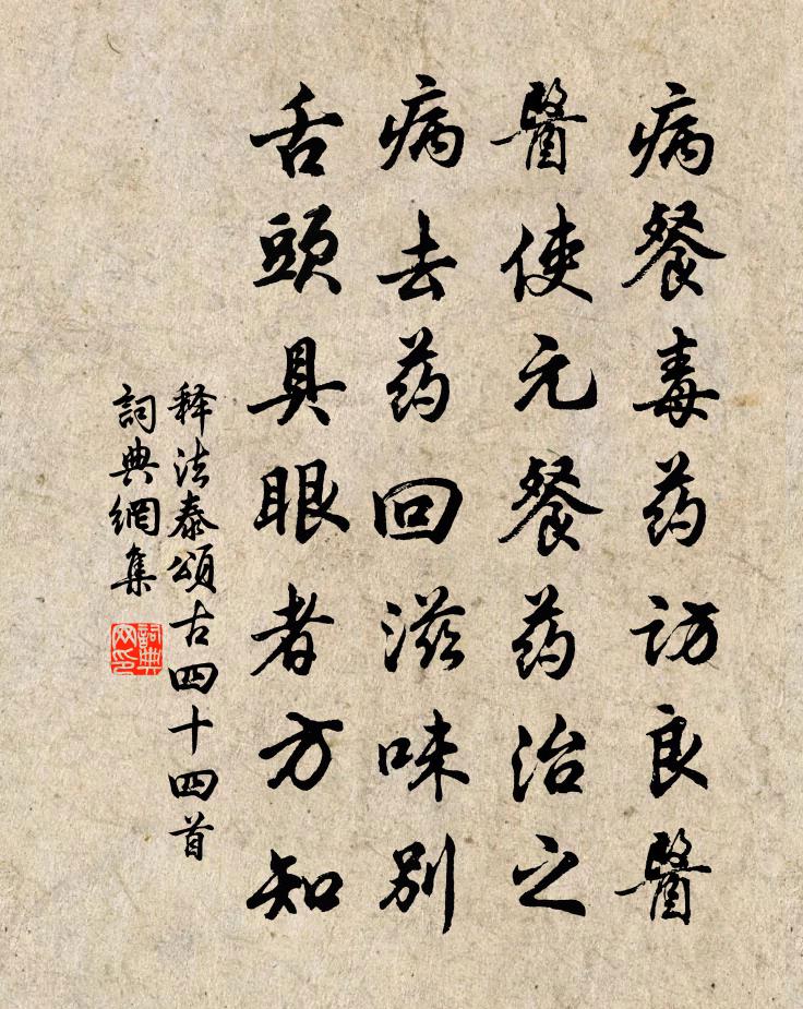 詩詞名句歷史字典書法欣賞書法字典國語詞典說文解字康熙字典古漢語字典標 題 作 者 詩 句 頌古四十四首作者:釋法泰 朝代:宋代頌古四十四首原文病餐毒藥訪良醫,醫使元餐藥治之。病去藥回滋味別,舌頭具眼者方知。詩詞問答問:頌古四十四首的作者是誰?答:釋法泰問:頌古四十四首寫於哪個朝代?答:宋代釋法泰頌古四十四首書法欣賞頌古四十四首書法作品詩詞推薦代胡倉過聖德惠民詩一首王阮〔宋代〕平楚皆膏壤,成湯忽旱年。人知聖慮切,恩遣使臣宣。乙犯饑荒後,長沙富庶全。紀年四十載,斗米二三錢。縣縣八月三日夜作白居易〔唐代〕露白月微明,天涼景物清。草頭珠顆冷,樓角玉鉤生。氣爽衣裳健,風疏砧杵鳴。夜衾香有思,秋簟冷無情。夢短飲良翁宮教新第二首劉克莊〔宋代〕負郭依山遠市廛,高宜台榭下宜田。徑當外膏從盤谷,似向丹青見輞川。別墅暮年□□□,□□□□□南遷。與君謝東粹包宏父三首癸卯夏戴復古〔宋代〕君家名父子,為晦翁嫡傳。嘗見黃勉齋,極口稱其賢。師友相琢磨,南軒惜無年。翁之為汝翁,文字相周旋。溟渤詩王粲〔魏晉〕聯翻飛鸞鳥。獨游無所因。毛羽照野草。哀鳴入青雲。我尚假羽翼。飛覩爾形身。願及春陽會。交頸遘殷勤。偈頌十七首釋智愚〔宋代〕金碑刮膜,自病難醫。利劍揮空,逃蹤莫及。何以橫拈塵尾,抑挫來機。殺活雖殊,對揚有淮,什麽人得此三味。偈頌一百一十七首釋紹曇〔宋代〕楊岐栗棘蓬,趙州殿里底。一句當機裂萬差,盡大地人扶不起。送李群玉赴舉杜牧〔唐代〕故人別來面如雪,一榻拂雲秋影中。玉白花紅三百首,五陵誰唱與春風?贈別何道士張耒〔宋代〕疏散多違久自知,形骸況復病先衰。全身倖免誅三獻,避世何勞賦五噫。聞說永嘉饒水石,便思輕帆向天涯。卻嗟秦樓月陳三聘〔宋代〕春膏集。新雷忽起龍蛇蟄。龍蛇蟄。柳塘風快,水流聲急。傷心有淚憑誰浥。尊前容易青衫濕。青衫濕。渡頭人去頌古四十五首釋慧遠〔宋代〕父嚴子逆事猶乖,宣德樓前問李差。斷頭剖腹從輕斷,直待還魂合處埋。登胡氏樓陶夢桂〔宋代〕草際露華白,天邊雲浪開。好風何處起,和月入簾來。田舍即事十首劉克莊〔宋代〕蹴踘鞵尖塵不涴,臂鷹袖窄樣新裁。社中年少相容否,也待鮮衣染鬢來。和蔣無退懷湖山吳芾〔宋代〕多謝君恩許引年,容親白石與清泉。不來山下尋詩社,既向湖中棹酒船。意適更穿花塢去,興闌還傍竹林眠。那聞句釋惠崇〔宋代〕松風傳夕磬,谿霧擁春燈。句韓縝〔宋代〕唐蒙論巴蜀,通道至卭僰。列郡徼西南,夷居半岩壁。偶書范成大〔宋代〕捏目華中影現身,有為皆妄懶方真。已甘搰搰勤為圃,休向滔滔苦問津。書至五千空拄腹,錢非十萬不通神。君看題宋玉亭戎昱〔唐代〕宋玉亭前悲暮秋,陽台路上雨初收。應緣此處人多別,松竹蕭蕭也帶愁。甲午淮幕和蕭應父贈鄭允蹈韻李曾伯〔宋代〕休從太上問靈均,華發駸駸及此辰。萬里斗槎難遠問,一時星弁玷同寅。縱逢裨灶言何益,自斷虞翻相己也。且喜初冬山居即事十首吳芾〔宋代〕自笑謀生拙,空驚歲月除。年衰惟藉藥,發少不禁梳。盡日扃蓬戶,無人過草廬。晚來閒策杖,緩步當柴車。名句推薦醉里秋波,夢中朝雨,都是醒時煩惱。時彥《青門飲·寄寵人》 精誠所加,金石為開。范曄《後漢書·列傳·光武十王列傳》 鐵馬雲雕久絕塵,柳營高壓漢營春。溫庭筠《過五丈原 / 經五丈原》 有孫母未去,出入無完裙。杜甫《石壕吏》 河西幕中多故人,故人別來三五春。岑參《涼州館中與諸判官夜集》 浮天水送無窮樹,帶雨雲埋一半山。辛棄疾《鷓鴣天·送人》 桃花仙人種桃樹,又摘桃花換酒錢。唐寅《桃花庵歌》 巧而好度,必節;勇而好同,必勝;知而好謙,必賢。荀子《荀子·仲尼》 師也者,教之以事而喻諸德者也戴聖《禮記·文王世子》 對酒捲簾邀明月,風露透窗紗。蘇軾《少年游·潤州作》