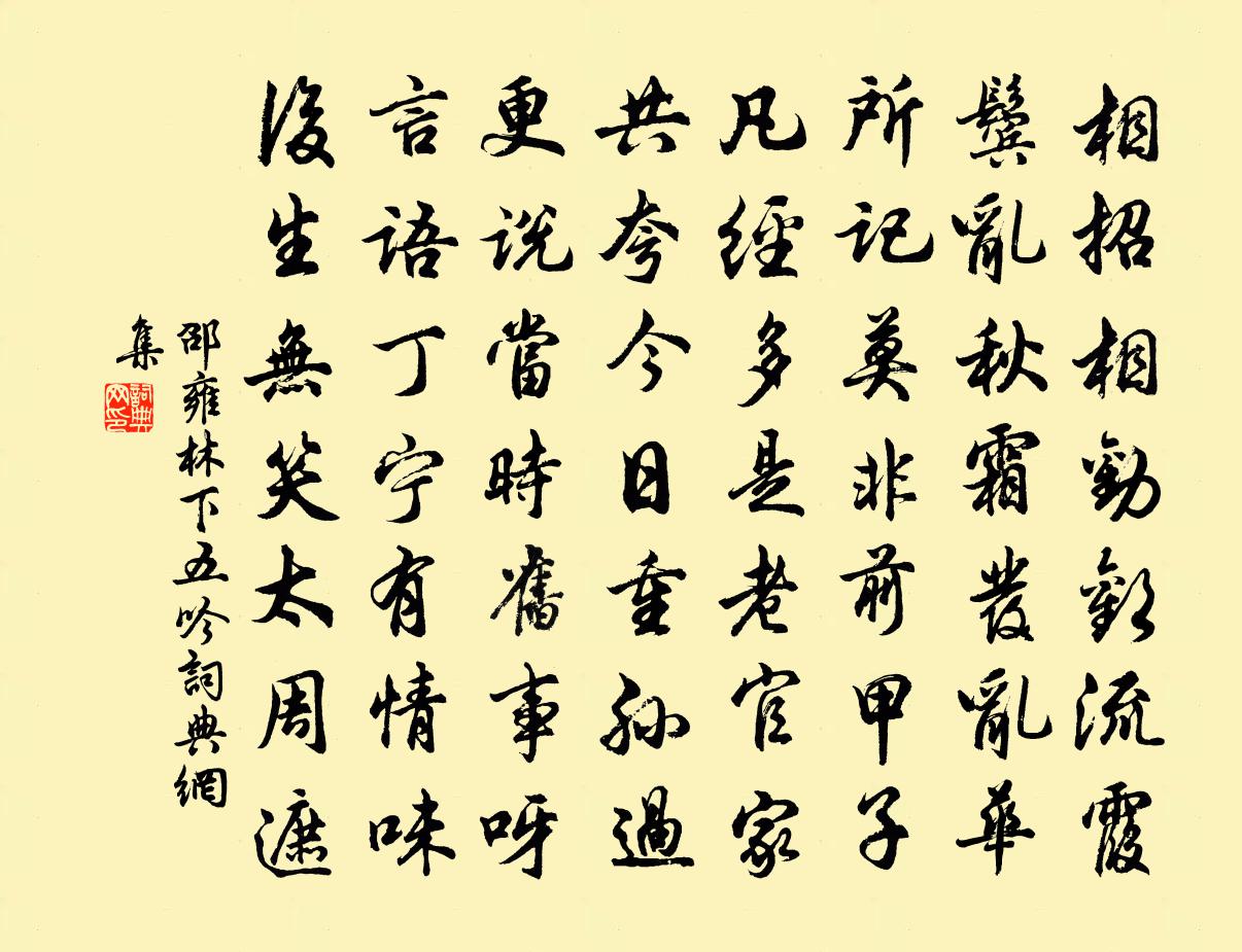 詩詞名句歷史字典書法欣賞書法字典國語詞典說文解字康熙字典古漢語字典標 題 作 者 詩 句 林下五吟作者:邵雍 朝代:宋代林下五吟原文相招相勸歡流霞,鬢亂秋霜發亂華。所記莫非前甲子,凡經多是老官家。共夸今日重孫過,更說當時舊事呀。言語丁寧有情味,後生無笑太周遮。詩詞問答問:林下五吟的作者是誰?答:邵雍問:林下五吟寫於哪個朝代?答:宋代邵雍林下五吟書法欣賞林下五吟書法作品詩詞推薦布袋和尚贊三首釋智朋〔宋代〕托布囊,握烏藤。街頭市尾,不是閒行。山齋姚勉〔宋代〕茅齋住翠林,一逕總清陰。澗近水聲入,窗虛山色侵。讀書依竹靜,送客出花深。此地無塵俗,令人長道心。第一百七十七文天祥〔宋代〕男兒生世間,居然成濩落。鸞鳳有鎩翮,虹霓就撐握。已亥雜詩 90龔自珍〔清代〕過百由旬煙水長,釋迦老子怨津梁。聲聞閉眼三千劫,悔慕人天 * 王。復和定國惠竹皮枕謔句晁補之〔宋代〕老來山水興彌深,不在長安俠少林。它日只為林下計,不將錦被作呻吟。寄象岑上人釋行海〔宋代〕宴坐凌霄峰頂寺,時時音信得相聞。十年寥落長為客,四海交遊少似君。楊柳重青相送處,鷺鷥潔白自成群。寒思題甄氏訪山亭二首陳觀〔宋代〕雨後西山翡翠堆,結亭直欲近岩隈。從今記取溪頭路,一日須來一百回。雜詠五言八首劉克莊〔宋代〕有劍彈歡鋏,無金築隗台。孝王雖貴介,猶解客鄒枚。桂隱紀詠詠老軒張鎡〔宋代〕因看上下經,便無煩惱事,慈儉不為先,躬行五個字。次韻吉老寄君庸黃庭堅〔宋代〕何郎生事四立壁,心地高明百不憂。白眼醉來思阮籍,碧雲吟罷對湯休。諸公著力書交上,尺璧深藏價未酬。空使劉邦直送早梅水仙花四首黃庭堅〔宋代〕錢塘昔聞水仙廟,荊州今見水仙花。暗香靜色撩詩句,宜在林逋處士家。楊柳枝方岳〔宋代〕小橋風定綠煙垂,幾送行人此別離。蹀躞玉驄嘶草去,啼鶯寂螢雨千絲。西江月向滈〔宋代〕別後千思萬想,眼前一日三秋。小街欄檻記追游。料得新妝依舊。自笑非常蒂殢,為他無限閒愁。莫將離恨寄鄜州理笙卓英英〔唐代〕頻倚銀屏理鳳笙,調中幽意起春情。因思往事成惆悵,不得緱山和一聲。戲效屏山書齋十詠劉克莊〔宋代〕工師將考室,何止大為杗。搘案雖微用,由來寸有長。酬淨因長老樓上翫月見懷有疑君魂夢在清都之王安石〔宋代〕道人心與世無求,隱几蕭然在此樓。坐對高梧傾曉月,看翻清露洗新秋。登臨更欲邀元亮,披寫還能擬惠休。顧我偶成曹彥約〔宋代〕若問如是是此心,能思能索又能尋。汝心底用他人說,只是尋常用底心。己未元日劉克莊〔宋代〕久向優場脫戲衫,亦無布袋杖頭擔。化彌勒身千百億,問絳人年七十三。諸老蕭疏留後殿,高僧滅度少同參。未應頌古五十三首釋文禮〔宋代〕強將不識鼓唇牙,胡語如何亂得華。若使老蕭皮有血,定應趕逐過流沙。和同行潘生悒悒悠悠二首之二賀鑄〔宋代〕悠悠復悠悠,淚寄東風流。所思悵何許,西北齊雲樓。名句推薦其出不出,間不容髮。班固《漢書·傳·賈鄒枚路傳》 窮則獨善其身,達則兼善天下。孟子《孟子·盡心章句上·第九節》 傷心重見,依約眉山,黛痕低壓姜夔《慶宮春·雙槳蓴波》 夜闌風靜欲歸時,惟有一江明月碧琉璃。蘇軾《虞美人·有美堂贈述古》 山遠近,路橫斜,青旗沽酒有人家。辛棄疾《鷓鴣天·陌上柔桑破嫩芽》 桃花三十六陂,鮫宮睡起,嬌雷乍轉。吳文英《瑞龍吟·德清清明競渡》 故人宿茅宇,夕鳥栖楊園。李白《之廣陵宿常二南郭幽居》 楊柳回塘,鴛鴦別浦。綠萍漲斷蓮舟路。賀鑄《芳心苦·楊柳回塘》 嘆流年、又成虛度。陸游《謝池春·壯歲從戎》 得閉口時須閉口,得放手時須放手。馮夢龍《醒世恆言·卷六》