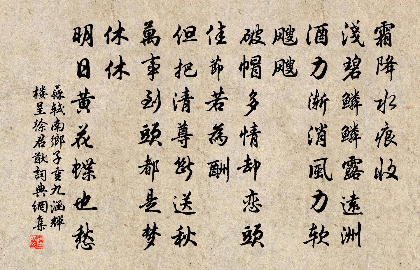 詞的上片寫樓中遠眺情景 。首句“霜降水痕收,淺碧鱗鱗露遠洲 ”,描繪大江兩岸晴秋景象。江上水淺,是深秋霜降季節現象,以“水痕收”表之 。“淺碧”承上句江水,“ 鱗鱗 ”是水泛微波,似魚鱗狀;“露遠洲”,水位下降,露出江心沙洲,“遠”字型現的是登樓遙望所見。兩句是此時此地即目之景,勾勒出天高氣清、明麗雄闊的秋景。