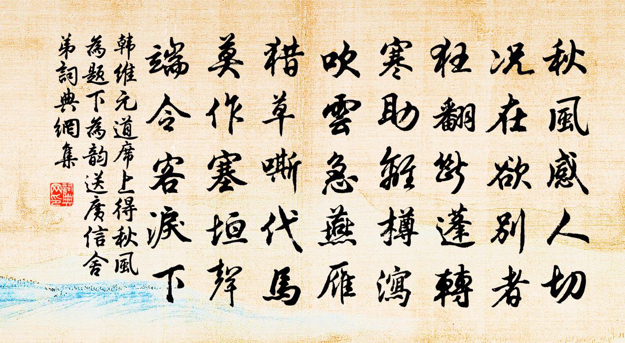 詩詞名句歷史字典書法欣賞書法字典國語詞典說文解字康熙字典古漢語字典標 題 作 者 詩 句 元道席上得秋風為題下為韻送廣信舍弟作者:韓維 朝代:宋代原文秋風感人切,況在欲別者。狂翻斷蓬轉,寒助離樽瀉。吹雲急燕雁,獵草嘶代馬。莫作塞垣聲,端令客淚下。詩詞問答問:《元道席上得秋風為題下為韻送廣信舍弟》的作者是誰?答:韓維問:該詩寫於哪個朝代?答:宋代書法欣賞元道席上得秋風為題下為韻送廣信舍弟書法作品詩詞推薦魏博羅令公附卷有回羅隱〔唐代〕寒門雖得在諸宗,棲北巢南恨不同。馬上固慚消髀肉,幄中由羨愈頭風。蹉跎歲月心仍切,迢遞江山夢未通。深荷用厚後弟強甫韻劉克莊〔宋代〕辭大叢林卓小庵,豈知捷徑在終南。狂歌不曉花十八,餓死休貪芧四三。漢有子云尤苦思,晉惟逸少不清談。君看春日許月卿六〔宋代〕夜雨晝晴花世界,晚風朝露柳精神。花花柳柳春何限,安樂窩中第一人。官居二首陳造〔宋代〕官居不惜日,宰縣動三年。忍事腸欲爛,為防頭救燃。不應一飽計,長客群人憐。挽仰堪供笑,人間海易田。天申節望闕口號喻良能〔宋代〕日永涼生殿閣風,需雲宴衎慶流虹。明良葉德千齡遇,臣妾傾心萬國同。葵影緩隨羲馭轉,榴花高映御袍紅。西逾九鎖山十詠王易簡〔宋代〕嵐陰四圍合,澗水數折流。試手翻碧海,卷雨來青虬。靜躁為人役,蓄泄同神謀。長歌亭上詩,飛仙不可留。倚欄秋夕書懷呈戎州郎中劉兼〔唐代〕素律初回枕簟涼,松風飄泊入華堂。譚雞寂默紗窗靜,夢蝶蕭條玉漏長。歸去水雲多阻隔,別來情緒足悲傷。霜砧和武公望從人覓酒二首廖行之〔宋代〕春愁滿眼久驅除,懶問生涯念及孥。但得論文留客醉,不妨問字到山居。寒收凍面應浮蟻,暖入芳腴可泛酥。便欲長安春日書事魏野〔宋代〕長安春色自依依,大命移應地不知。蔓草已迷雙鳳闕,千花猶照九龍池。豈無東合開今日,尚有南山似舊時。一月九日同出真珠園再用前韻林光宗〔宋代〕來自清源葛已覃,君王問獵我猶堪。百年耆舊如重見,九日登臨得綜談。才子不知汾水上,仙人長在大江南。明珠竹溪為旌城汪伯溱賦程介〔宋代〕先生溪上種修竹,呼吸溪光餐竹綠。自應不同此君醫,冰雪之胸元不俗。我欲相從竹溪中,已辦青蓑黃篾篷。臥聽水調歌頭翁溪園〔宋代〕丹鶴結青士,玄鹿侍蒼官。壽仙堂下,應伴鳧舃戲萊斑。麟記當年繡紱,燕剪今朝彩勝,淑氣逐椒盤。孕毓陽和粹次黃宰早春韻洪咨夔〔宋代〕勝裹春來早,遲君秉燭游。暖如三月暮,香老百花頭。心事付桑落,風光摧栗留。人生行樂耳,任命不須求。漁村晚照薛嵎〔宋代〕舊遊憶得瀟湘路,今喜煙波似舊時。澤畔怕逢漁父問,桃源已被世人知。數家草市添新戶,一樹寒鴉傍古祠。蘭杜燭影搖紅(立春日雪,和秋崖韻)劉辰翁〔宋代〕春日江郊,素娥吹下銀幡舞。東風點點亂茶煙,留到明朝否。掩袖凝寒不語。漫粘酥、枝枝縷縷。斷腸何似,飛絮偈釋谷泉〔宋代〕今朝甚好雪,紛紛如秋月。文殊不出頭。普賢呈醜拙。中秋無月感而作歌鄧深〔宋代〕天時相催日如流,今夕何夕雲中秋。不見佳月默有感,試走退筆書其由。去年此時汝川客,一病 * 真險厄。貪生和李提學存耕鉛山酌廉韻王奕〔宋代〕先生在荷峰,此日賦泉石。及今又重午,領客酌蓮碧。教雨落九垓,隨地成廉澤。師友系天倫,豈必同過客。孔孟【雙調】折桂令_詠西域吉誠鍾嗣成〔元代〕詠西域吉誠甫是梨園一點文星,西土儲英,中夏揚名。胸次天誠,口角河傾,席上風生。吞學海波瀾萬頃,戰詞壇金山寺王安石〔宋代〕招提憑高岡,四面斷行旅。勝地猶在險,浮梁裊相拄。大江當我前,颭灩翠綃舞。通流與廚會,甘美勝牛乳。扣欄名句推薦雖死之日,猶生之年陳壽《三國志·吳書·吳主五子傳》 三思而行,再思可矣。佚名《增廣賢文·上集》 布帛尋常,庸人不釋。韓非及後人《韓非子·五蠹》 留連光景惜朱顏,黃昏獨倚闌。李煜《阮郎歸·呈鄭王十二弟》 千古風流八詠樓,江山留與後人愁。李清照《題八詠樓》 登鸞車,侍軒轅,遨遊青天中,其樂不可言。李白《飛龍引二首·其一》 好問則裕,自用則小。佚名《尚書正義·卷八·仲虺之誥》 濤瀾洶湧,風雲開闔。蘇轍《黃州快哉亭記》 綠遍山原白滿川,子規聲里雨如煙。翁卷《鄉村四月》 正入萬山圈子裡,一山放過一山攔楊萬里《過松源晨炊漆公店》