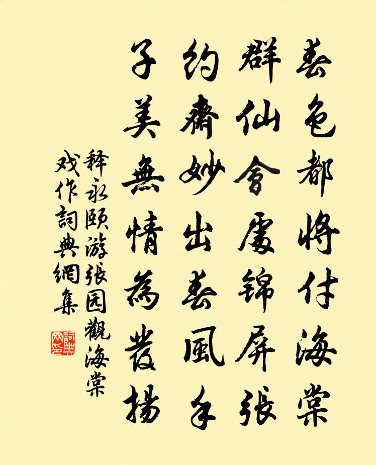 詩詞名句歷史字典書法欣賞書法字典國語詞典說文解字康熙字典古漢語字典標 題 作 者 詩 句 游張園觀海棠戲作作者:釋永頤 朝代:宋代游張園觀海棠戲作原文春色都將付海棠,群仙會處錦屏張。約齋妙出春風手,子美無情為發揚。詩詞問答問:游張園觀海棠戲作的作者是誰?答:釋永頤問:游張園觀海棠戲作寫於哪個朝代?答:宋代釋永頤游張園觀海棠戲作書法欣賞游張園觀海棠戲作書法作品詩詞推薦和謝參政卜宅曹勛〔宋代〕數篇隃寄梵王宮,玉立高寒並兩峰。亹亹詩章煩護惜,時時情話憶過從。雪殘蒼嶺野雲暗,花著疏梅春意濃。它日夜坐呈外舅王柏〔宋代〕略無家具可經營,有子頑冥秘錮深。歲月自催忙裡客,功名不著靜中心。詩非得意貧難遣,酒已忘情恨莫禁。坐對華陰有山行釋文珦〔宋代〕華陰梯有山,上梯與天齊梯。仰望梯莫及,雲煙朝隮。人跡罕到,群仙所棲。餐食沆瀣,乘駕虹霓。下視萬國,大周公帽李石〔宋代〕山頭載帽周公雨,岩下生衣傅說霖。莫道蠻州無此樣,可憐老我十分心。宮詞王仲修〔宋代〕前殿風傳萬歲聲,九重歌管樂昇平。欲知慶事叢元日,瑞氣先從帝鼐生。送李倍巡官歸永樂舊居薛能〔唐代〕羨君歸去五峰前,往往星河實見仙。麥壟夏枯成廢地,棗枝秋赤近高天。山泉飲犢流多變,村酒經蠶味可憐。曾約賀聖朝丘處機〔元代〕斷雲歸岫,長空凝翠,寶鑑初圓。大光明宏照,亘流沙外,直過西天。人間是處,夢魂沈醉,歌舞華筵。道家門、胡笳十八拍十八首王安石〔宋代〕此身飲罷無歸處,心懷百憂傷千慮。天翻地覆誰得知,魏公垂淚嫁文姬。天涯憔悴身,託命於新人。念我出腹子,春翁洮〔唐代〕漠漠煙花處處通,遊人南北思無窮。林間鳥奏笙簧月,野外花含錦繡風。鸑抱雲霞朝鳳闕,魚翻波浪化龍宮。此時李憲仲哀詞蘇軾〔宋代〕大夢行當覺,百年特未滿。遑哀已逝人,長眠寄孤館。念我同年生,意長日月短。鹽車困騏驥,烈火廢圭瓚。後生送吳石赴舉魏野〔宋代〕吳生重赴舉,輕別得傷心。貧友欲沽酒,豪家不典琴。溪僧來會送,國士到爭尋。預想登科後,無因訪竹林。岩泉陳岩〔宋代〕月光泉脈瀉虛明,澄碧無瑕注一泓。大字石間標聖水,只緣徹底是真清。小飲趙園陸游〔宋代〕少年結騎厭追歡,漸老方知一笑難。邂逅偶能成千醉,登臨未覺怕春寒。高林橫靄丹青幅,亂蝶爭花錦繡團。滿眼靈峰寺洞徐璣〔宋代〕洞在寺之右,昔存羅漢從。石峰排似筍,山勢裂因龍。自有泉甘美,無愁路疊重。聖燈雲照夜,宿客間曾逢。題終南翠微寺空上人房孟浩然〔唐代〕一作題終南翠微寺翠微終南里,雨後宜返照。閉關久沈冥,杖策一登眺。遂造幽人室,始知靜者妙。儒道雖異門,鷓鴣天·贈馭說高秀英王惲〔元代〕短短羅袿淡淡妝,拂開紅袖便當場。掩翻歌扇珠成串,吹落談霏玉有香。由漢魏,到隋唐,誰教若輩管興亡。百年乙巳邵武建寧夜坐書呈諸公陳普〔宋代〕盱豫悔成緣悔遲,往蹇來反又何疑。雞鳴一念清如水,正是籧篨可俯時。夜誦陳起〔宋代〕父子跏趺絕似僧,青燈一盞夜三更。讀殘戴記兒將倦,山栗旋煨仍擘橙。池亭夜遊趙善漣〔宋代〕踏月清詩骨,露華夜已深。樹搖知鳥宿,波靜覺魚沉。報國慚無術,思親空有心。躊躇誰與語,唧唧亂蛩吟。步登夏口古城作劉長卿〔唐代〕平蕪連古堞,遠客此沾衣。高樹朝光上,空城秋氣歸。微明漢水極,搖落楚人稀。但見荒郊外,寒鴉暮暮飛。名句推薦高樓目盡欲黃昏,梧桐葉上蕭蕭雨。晏殊《踏莎行·碧海無波》 一寸相思千萬緒。人間沒個安排處。李冠《蝶戀花·春暮》 長安回望繡成堆,山頂千門次第開。杜牧《過華清宮絕句三首》 吾日三省吾身:為人謀而不忠乎?與朋友交而不信乎?傳不習乎?孔子弟子《論語·學而篇》 巧笑倩兮,美目盼兮。佚名《碩人》 生而知之者上也,學而知之者次也;困而學之又其次也。困而不學,民斯為下矣。孔子弟子《論語·季氏篇》 不種閒花,池亭畔、幾竿修竹。陸容《滿江紅·詠竹》 村北村南,穀雨才耕遍。范成大《蝶戀花·春漲一篙添水面》 溪上桃花無數,花上有黃鸝。黃庭堅《水調歌頭·遊覽》 存亡在虛實,不在於眾寡。韓非及後人《韓非子·安危》
