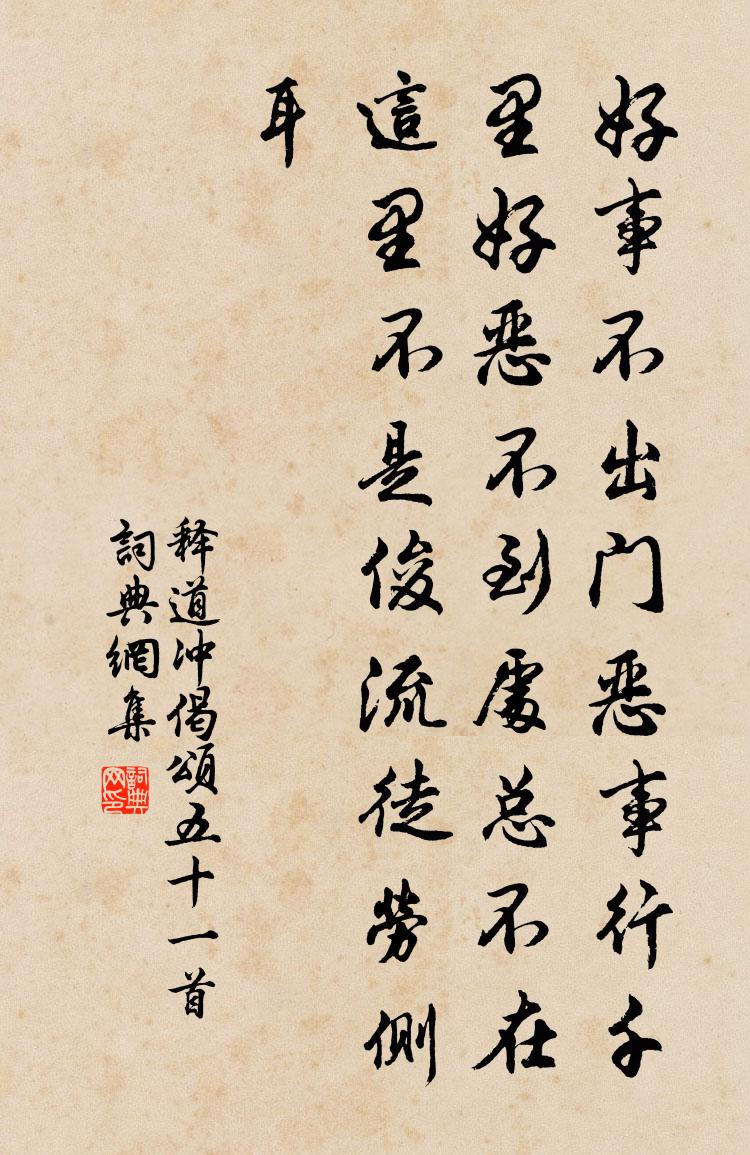 詩詞名句歷史字典書法欣賞書法字典國語詞典說文解字康熙字典古漢語字典標 題 作 者 詩 句 偈頌五十一首作者:釋道沖 朝代:宋代偈頌五十一首原文好事不出門,惡事行千里。好惡不到處,總不在這裡。不是俊流,徒勞側耳。詩詞問答問:偈頌五十一首的作者是誰?答:釋道沖問:偈頌五十一首寫於哪個朝代?答:宋代釋道沖偈頌五十一首書法欣賞偈頌五十一首書法作品詩詞推薦雨雪皇甫冉〔唐代〕風沙悲久戍,雨雪更勞師。絕漠無人境,將軍苦戰時。山川迷向背,氛霧失旌旗。徒念天涯隔,中人芳草期。題秋山圖王炎〔宋代〕我本山中人,築室依澗岡。世故驅我來,緇塵滿衣裳。見此山中景,我思更深長。老樹何離離,瘦石何蒼蒼。借問偈頌一百四十一首釋師範〔宋代〕靈山話月,曹溪指月。遞代相傳,證龜成鱉。定叟弟頻寄黃櫱仰山新芽嘗口占小詩適災患亡張栻〔宋代〕集雲峰頂風霜飽,黃蘗洲前水石清。不入貢包供玉食,只應山澤擅高名。過桐江三絕胡仲弓〔宋代〕解纜移舟淛水濱,晚潮初落岩痕新。酒酣臥唱江南曲,月在篷窗冷照人。雪釋寶曇〔宋代〕日卻山川凍出雲,疏疏先自竹邊聞。玉龍不動身千億,薝葡無香瘦十分。彷佛夜堂餘火力,淒涼茅屋有人群。已知喜遇劉二十八偶書兩韻聯句裴度〔唐代〕病來佳興少,老去舊遊稀。笑語縱橫作,杯觴絡繹飛。 ——裴度清談如水玉,逸韻貫珠璣。高位送安同知赴闕五首魏了翁〔宋代〕京邑殿留司留相,東山無以我公歸。德人用舍關天運,世上巫感妄見機。九日殷堯藩〔唐代〕萬里飄零十二秋,不堪今倚夕陽樓。壯懷空擲班超筆,久客誰憐季子裘。瘴雨蠻煙朝暮景,平蕪野草古今愁。酣歌避暑二首徐凝〔唐代〕一株金染密,數畝碧鮮疏。避暑臨溪坐,何妨直釣魚。斑多筒簟冷,發少角冠清。避暑長林下,寒蟬又有聲。醉蓬萊程珌〔宋代〕望皇都清曉,瑞日祥煙,洞開閶闔。一朵紅雲,映重瞳日月。萬歲山高,九霞杯暖,正想宸游洽。絕塞庭琛,重闈客中夜寒戲作長謠陸游〔宋代〕孤翁痴鈍如寒蠅,霜夕不瞑愁嚴凝。寢衣觸體起芒粟,鼻息噓潤成冰凌。冬冬默數嚴譙鼓,耿耿獨看幽窗燈。支床丙子夏偶書楊簡〔宋代〕行年七十有六,隨世名言則然。應酬袞袞萬狀,變化離均坤乾。人情曲折參錯,動靜多寡後先。孰有孰虛孰實,無曉過花橋入宣州界四首楊萬里〔宋代〕不是青山是畫圖,南山瘦削北敷腴。兩山名姓君知麽,一字玄暉一聖俞。送梁伯暘歸括蒼三首劉宰〔宋代〕怒風駕海潮,錢塘天下莊。岷山浚源委,東下極奔放。中橫吳淞江,煙波渺四望。歸歟太史筆,偃蹇九霄上。玉樓春馬子嚴〔宋代〕南枝又覺芳心動。慰我相思情味重。隴頭何處寄將書,香發有時疑是夢。誰家橫笛成三弄。吹到幽香和夢送。覺來平旦釋文珦〔宋代〕平旦氣偏清,境界復深窔。初日上東溟,高峰最先照。會意髮長吟,何似蘇門嘯。不必諧宮商,自是山中調。贈王將軍無可〔唐代〕勛高絕少年,分衛玉階前。雄勇明王重,溫恭執友賢。功書唐史滿,名到虜庭偏。劍彩浮龍影,衣香襲御煙。搜書踏莎行盧炳〔宋代〕雅淡容儀,溫柔情性。偏伊賦得多風韻。明眸剪水玉為肌,鳳鞋弓小金蓮襯。相見雖頻,歡娛無定。蠻箋寫了憑誰送王師厚晁公溯〔宋代〕季父高名映里閭,復欣千里識名駒。當令東海評清譽,他日還如二大夫。名句推薦綠池落盡紅蕖卻,荷葉猶開最小錢。楊萬里《秋涼晚步》 將壇醇酒冰漿細,元夜邀賓燈火新。趙時春《元宵飲陶總戎家二首》 和羞走,倚門回首,卻把青梅嗅。李清照《點絳唇·蹴罷鞦韆》 他鄉逢七夕,旅館益羈愁。孟浩然《他鄉七夕》 飲馬渡秋水,水寒風似刀。王昌齡《塞下曲四首》 掩柴扉,謝他梅竹伴我冷書齋。沈自晉《玉芙蓉·雨窗小詠》 橋北橋南千百樹,綠煙金穗映清流。朱栴《官橋柳色》 草秀故春色,梅艷昔年妝。李世民《元日》 如花美眷,似水流年曹雪芹《紅樓夢·第二十三回》 至今商女,時時猶唱,後庭遺曲。王安石《桂枝香·登臨送目》