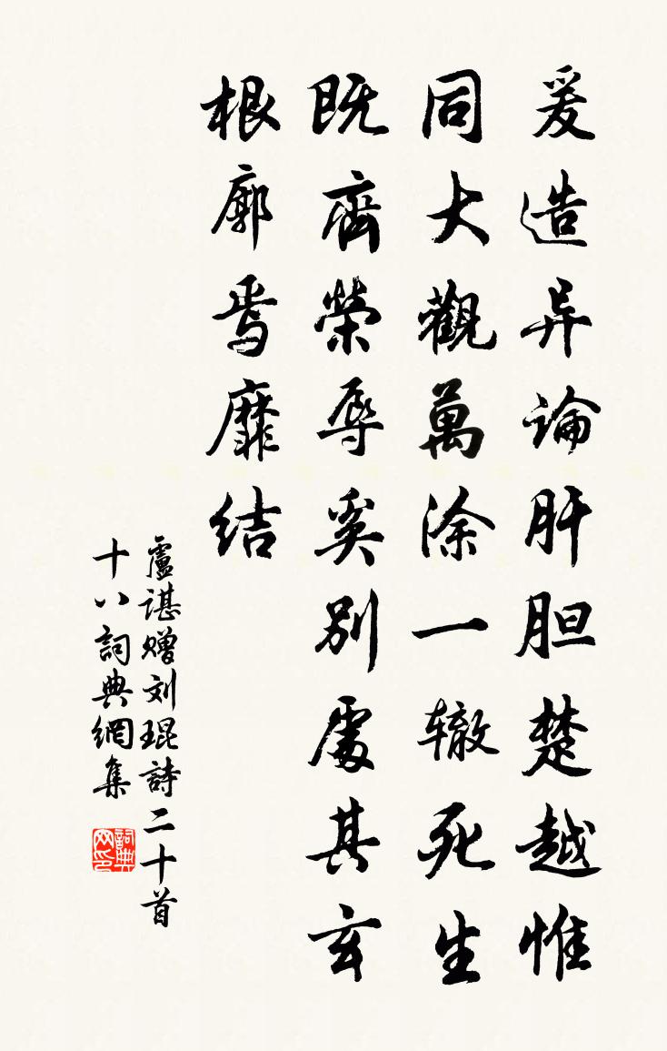 詩詞名句歷史字典書法欣賞書法字典國語詞典說文解字康熙字典古漢語字典標 題 作 者 詩 句 贈劉琨詩二十首 十八作者:盧諶 朝代:魏晉贈劉琨詩二十首 十八原文爰造異論。肝膽楚越。惟同大觀。萬塗一轍。死生既齊。榮辱奚別。處其玄根。廓焉靡結。詩詞問答問:贈劉琨詩二十首 十八的作者是誰?答:盧諶問:贈劉琨詩二十首 十八寫於哪個朝代?答:魏晉盧諶贈劉琨詩二十首 十八書法欣賞贈劉琨詩二十首 十八書法作品詩詞推薦禪師塔陳貴誠〔宋代〕舊到烏回寺,相迎識短筇。重來已無跡,今去欲安從。春曉空啼鳥,岩枯吼夜龍。諸天圍繞處,重聽一樓鍾。在西國懷王舍城(一三五七九言)義淨〔唐代〕游,愁。赤縣遠,丹思抽。鷲嶺寒風駛,龍河激水流。既喜朝聞日復日,不覺頹年秋更秋。已畢耆山本願城難遇,酬傅老劉宰〔宋代〕人生不見古無懷,平陸猶成灩澦堆。百歲髑髏能發語,有生非我死非災。減字木蘭花向子諲〔宋代〕無窮白水。無限芰荷紅翠里。幾點青山。半在雲煙暗靄間。移舟橫截。臥看碧天流素月。此意虛徐。好把薌林入畫夏畦艾性夫〔宋代〕清晨步蔬畦,生意慘不綠。烈哉三足烏,覆此五鼎餗。呼童吸深清,且勿荒我菊。一片雲有心,停陰作花屋。次韻陳心田郊居即事二首徐瑞〔宋代〕想見從來種種迂,讀書採藥灌園疏。看山不厭風期別,與世相忘機事疏。正自未妨悄徉飲,足知不作子公書。詩名{左酉右倉}蟹高似孫〔宋代〕西風送冷出湖田,一夢酣春落酒泉。介甲盡為香玉軟,脂膏猶作紫霞堅。魂迷楊柳灘頭月,身老松花瓮里天。不是和梁簽判潁州西湖十三題擷芳亭蘇頌〔宋代〕春來何處最花繁,湖水西頭百畝園。無限遊人折紅蕊,可憐桃李自無言。七夕宋白〔宋代〕纖吹浮雲薦,非因散巧樓。靈儔不可覿,仙溪泛悠悠。小姑王安石〔宋代〕小姑未嫁與蘭支,何恨流傳樂府詩。初學水仙騎赤鯉,竟尋山鬼從文狸。繽紛雲杉空棠檝,綽約煙鬟獨桂旗。弄玉曉起李商隱〔唐代〕擬杯當曉起,呵鏡可微寒。隔箔山櫻熟,褰帷桂燭殘。書長為報晚,夢好更尋難。影響輸雙蝶,偏過舊畹蘭。奉觀御飛白書應制夏竦〔宋代〕聖德天攸縱,慈闈實訓崇。飛毫邁古法,方丈奪神功。輕素飄驚吹,長煙疊遠空。點孤時戲蝶,波偃乍騰虹。洛畫兩日意殊不懌作短歌自遣陸游〔宋代〕一月得笑才四五,十事敗意常 * 。國中謾說無雙士,天下元無第一手。平生愛酒恨小戶,半世為文真弊帚。劫灰無夢令馬鈺〔元代〕三髻山侗愛笑。好弱歸之一笑。不是我如斯,有個內容欣笑。欣笑。欣笑。真樂自然歡笑。贈新昌王藍田三子姚勉〔宋代〕太原曾有三珠樹,花萼一團光彩聚。清晨肯挾三鳳來,真是王家兒可譽。乃翁喔詩松竹陰,三兒吾伊玉應金。不須唐辰臘八日大雪二首張耒〔宋代〕平生臘八日,借缽受齋糜。客路歲將晚,旅庖晨不炊。持杯從破律,遣興自吟詩。何日依禪宿,鍾魚自有時。五言贈諸法師公孫杲〔唐代〕駕鶴排朱霧,乘鸞入紫煙。凌晨味潭菊,薄暮玩峰蓮。玉葉低梁下,金飀引窗前。嘯傲雲霞際,留情鱗羽年。郊居吟釋行肇〔宋代〕靜室簾孤捲,幽光墜露多。徑寒杉影轉,窗晚雪聲過。茗味沙泉合,鑪香竹靄和。遙懷起深夕,舊寺隔滄波。溺溪流靚禪師〔宋代〕春天一夜雨滂沱,添得溪流意氣多。剛把山僧推倒卻,不知到海後如何。次韻王待制初見虎牙銅柱詩喻良能〔宋代〕千騎遠征夔子國,百篇還賦杜陵詩。虎牙突兀撐空出,恰似雲開衡岳時。名句推薦細雨春蕪上林苑,頹垣夜月洛陽宮。陸游《書憤五首·其二》 名不徒生,而譽不自長。功成名遂。墨子《墨子·02章 修身》 願借天風吹得遠,家家門巷盡成春。李方膺《題畫梅》 颯颯東風細雨來,芙蓉塘外有輕雷。李商隱《無題·颯颯東風細雨來》 京口瓜洲一水間,鐘山只隔數重山王安石《泊船瓜洲》 猶有桃花流水上,無辭竹葉醉尊前。劉禹錫《憶江南·春去也》 砌下落梅如雪亂,拂了一身還滿。李煜《清平樂·別來春半》 自笑好山如好色,只今懷樹更懷人。閒愁閒恨一番新。辛棄疾《浣溪沙·偕叔高子似宿山寺戲作》 玉不琢,不成器;人不學,不知道。戴聖《禮記·學記》 蠶娘洗繭前溪淥,牧童吹笛和衣浴。貫休《春晚書山家屋壁二首》