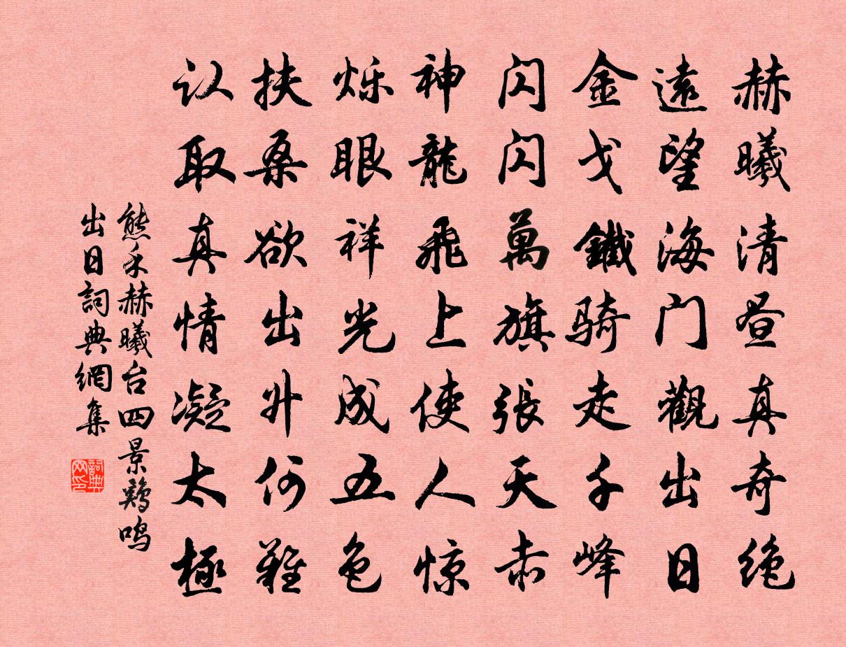 詩詞名句歷史字典書法欣賞書法字典國語詞典說文解字康熙字典古漢語字典標 題 作 者 詩 句 赫曦台四景雞鳴出日作者:熊禾 朝代:宋代赫曦台四景雞鳴出日原文赫曦清晝真奇絕,遠望海門觀出日。金戈鐵騎走千峰,閃閃万旗張天赤。神龍飛上使人驚,爍眼祥光成五色。扶桑欲出升何難,認取真情凝太極。詩詞問答問:赫曦台四景雞鳴出日的作者是誰?答:熊禾問:赫曦台四景雞鳴出日寫於哪個朝代?答:宋代熊禾赫曦台四景雞鳴出日書法欣賞赫曦台四景雞鳴出日書法作品詩詞推薦齊天樂(庚戈元夕都下遇趙立之)佚名〔宋代〕倦去休雨風還作,交相醒花蘇柳。字滿吟灰,痕添坐席,贏得新愁痴守。歸期未有。負小院移蘭,故園嘗韭。謾道得雨曹勛〔宋代〕喜乘一雨洗空闊,便覺四山來夕陰。飯了從容隨所住,追涼輕吹入疏襟。霜後紀園中草木十二絕范成大〔宋代〕遮藏茉莉檻,纏裹芭蕉身。我亦入室處,忍寒待陽春。冬至二首劉克莊〔宋代〕慈顏幽翳幾星霜,猶記斑衣共舉觴。老弟頗憐伯仁短,小孫突過阿宜長。親朋不至諳時態,兒女無知競曉妝。老退偶連日食雞夜夢有截一支者頗憐之有謂予言雞李流謙〔宋代〕平生不喜殺,殺戒宿所欽。累此多病身,蔬食慚未能。連日管庖供,只難薦餚蒸。異林發農驚,截支血霪霪。旁立凝碧晚望李彌遜〔宋代〕秋來何必送將歸,落日高台意自悲。一壑未容追法漫,三鍾猶得飽支離。黃花對客如相笑,白髮尋人似有期。時序出都來陳,所乘船上有題小詩八首,不知何人蘇軾〔宋代〕煙火動村落,晨光尚熹微。田園處處好,淵明胡不歸。贈陳隨隱劉彥朝〔宋代〕坎止流行只任天,吟廬新傍紫薇邊。夜窗低過宮花月,曉巷深橫御柳煙。五字肯同餘子說,一燈親自乃翁傳。雖然送程公辟郎中知洪州二首強至〔宋代〕滕閣欄高紅螮蝀,章江水闊碧琉璃。幾年氣象歸談笑,一道藩垣系指麾。那待韓公來屬部,無勞王勃寫雄辭。使君代送陳都大赴召李流謙〔宋代〕庭前梧葉西風起,三峽秋光淨如洗。仙帆一舸此入覲,靈鼉擊鼓馮夷喜。七閩山水天下奇,摧秀搴英瑞斯世。要知令狐信芳招飲天慶呈張文煥方回〔宋代〕仲秋久不雨,殘暑氣猶郁。晝夢化飛鴻,青冥脫羅罻。果有叩門者,嘉招為湔祓。林下見高人,杯中得佳物。世故匡山新霽圖唐寅〔明代〕翁昔少年初畫山,蒼松蒼竹雜潺湲。直疑積雨得深潤,不假浮雲相往還。世外空青秋一色,岩前遠黛曉千鬟。天台淮上宋庠〔宋代〕晚歲清淮路,淹留數問津。風平天合水,舟進樹迎人。飢鶩貪魚沒,高鴻望渚遵。楚鄉梅柳意,相慰似先春。賢者之孝二百四十首酈寄林同〔宋代〕直以劫父故,蒙他賣友名。閒將誅呂論,非勃亦非平。天津感事二十六首邵雍〔宋代〕誰引長河貫洛城,鑾輿東去此為輕。洪濤不服天津束,日夜奔騰作怒聲。句王逵〔宋代〕下鹽廣陌三條闊,斜倚危樓百尺高。正月十五夜出回梅堯臣〔宋代〕不出只愁感,出遊將自寬。貴賤依儔匹,心復殊不歡。漸老情易厭,欲之意先闌。卻還見兒女,不語鼻辛酸。去年二十九日道中次韻酬寄羅鄂州項安世〔宋代〕經世事日遠,獨往柰婆娑。兩途一未遂,痛飲復高歌。往者長已矣,黃山郁嵯峨。在者聊復爾,後生誰錯摩。向來和陳丞題陽家洞張明中〔宋代〕溪繚飛虹聽不潺,山雕翠玉望來寒。門牆面水臨橋靜,今古無虞枕自安。桐帽棕鞋非巧偽,花朝月夕幾團欒。箇中偶作二首高蟾〔唐代〕丁當玉佩三更雨,平帖金閨一覺雲。明日薄情何處去,風流春水不知君。霞衣重疊紅蟬暖,雲髻蔥籠紫鳳寒。天上名句推薦楝花飄砌。蔌蔌清香細。謝逸《千秋歲·詠夏景》 孤村落日殘霞,輕煙老樹寒鴉,一點飛鴻影下。白樸《天淨沙·秋》 衰楊古柳,幾經攀折,憔悴楚宮腰柳永《少年游·參差煙樹灞陵橋》 彩線輕纏紅玉臂,小符斜掛綠雲鬟。蘇軾《浣溪沙·端午》 大丈夫處其厚,不居其薄;處其實,不居其華。老子《老子·德經·第三十八章》 君子務修其內而讓之於外。荀子《荀子·儒效》 石卵不敵。蛇龍不鬥。馮夢龍《警世通言·卷九》 不如隨分尊前醉,莫負東籬菊蕊黃。李清照《鷓鴣天·寒日蕭蕭上瑣窗》 小軒窗。正梳妝。相顧無言,惟有淚千行。蘇軾《江城子·乙卯正月二十日夜記夢》 白鳥一雙臨水立,見人驚起入蘆花。戴復古《江村晚眺》