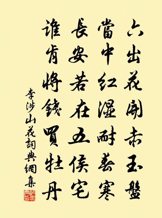詩詞名句歷史字典書法欣賞書法字典國語詞典說文解字康熙字典古漢語字典標 題 作 者 詩 句 山花作者:李涉 朝代:唐代山花原文六出花開赤玉盤,當中紅濕耐春寒。長安若在五侯宅,誰肯將錢買牡丹。詩詞問答問:山花的作者是誰?答:李涉問:山花寫於哪個朝代?答:唐代問:山花是什麼體裁?答:七絕李涉山花書法欣賞山花書法作品注釋全唐詩:卷477-83詩詞推薦省判李度支碩相過敘別兼述感懷宋祁〔宋代〕君趨召節向中台,我滯邊州未得回。頭白羞論天下事,眼青欣舉故人杯。池蛟得雨鱗先動。霜隼乘風翅始開。見上妾薄命趙汝鐩〔宋代〕冶容麗質世鮮比,擇對年少風流子。並欄觀魚雙戲水,妾心郎心誓如此。一朝結束萬里行,東欲到海西到作。醉中蘇武慢凌雲翰〔元代〕驢背馱詩,鴟夷盛酒,曉踏蘇堤殘雪。露闕雲門,璇階玉宇,照耀日華光潔。見說孤山,猶存老樹,清興一時超越偈頌八十七首釋慧開〔宋代〕遇緣即宗雲從龍,隨處作主風從虎,大地撮來無寸土。倒岳傾湫,興雲致雨。賀新郎(雪)葛長庚〔宋代〕是雨還堪拾。道非花、又從簾外,受風吹入。撲落梅梢穿度竹,恐是鮫人訴泣。積至暮、螢光熠熠。色映萬山迷遠秋夜讀書每以二鼓盡為節陸游〔宋代〕腐儒碌碌嘆無奇,獨喜遺編不我欺。白髮無情侵老境,青燈有味似兒時。高梧策策傳寒意,疊鼓冬冬迫睡期。秋夜舟行次南都遇雨鄭獬〔宋代〕雨聲飄斷忽南去,雲勢旋生從北流。料得涼風訊息近,蕭蕭只在柳梢頭。花光仲仁出秦蘇詩卷思二國士不可復見開卷絕黃庭堅〔宋代〕夢蝶真人貌黃槁,籬落逢花須醉倒。雅聞花光能畫梅,更乞一枝洗煩惱。扶持愛梅說道理,自許牛頭參已早。長眠送新茶釋重顯〔宋代〕乘春雀舌占高名,龍麝相資笑解醒。莫訝山家少為送,鄭都官謂草中英。殺氣不在邊孟郊〔唐代〕殺氣不在邊,凜然中國秋。道險不在山,平地有摧輈。河南又起兵,清濁俱鎖流。豈唯私客艱,擁滯官行舟。況余贈李道士(並敘)蘇軾〔宋代〕駕部員外郎李君宗固,景祐中良吏也,守漢州。有道士尹可元,精練善畫,以遺火得罪,當死。君緩其獄,會赦,行出東山望漢川孟浩然〔唐代〕一題作行至漢川作異縣非吾土,連山盡綠篁。平田出郭少,盤阪入雲長。萬壑歸於海,千峰劃彼蒼。猿聲亂楚峽,浙上重陽司空圖〔唐代〕登高唯北望,菊助可□明。離恨初逢節,貧居只喜晴。好文時可見,學稼老無成。莫嘆關山阻,何當不阻兵。醉中作陸游〔宋代〕名醞羔兒拆密封,香粳玉粒出新舂。披綿珍鯗經旬熟,斫雪雙螯洗手供。吟罷欲沉江渚月,夢回初動寺樓鍾。爐煙五鼓入城陸游〔宋代〕道旁竹樹露如傾,帶睡悠悠十里行。曉色未分煙尚重,壓城樓閣已崢嶸。壽薛象先陳傅良〔宋代〕蕭然山澤一臞仙,故被聲名絆俊躔。只為春秋同社燕,遂歸風雨對床眠。中年曾未鬚眉白,盡日全無車馬喧。我有代書寄應之舅蘇泂〔宋代〕故人天一方,鴻雁已南翔。世亂各生死,年飢無稻粱。丁寧機上錦,愛惜橐中裝。莫作孤飛想,冥冥忌弋傷。神弦李賀〔唐代〕女巫澆酒雲滿空,玉爐炭火香咚咚。海神山鬼來座中,紙錢窸窣鳴旋風。相思木貼金舞鸞,攢蛾一啑重一彈。呼星和李才甫先輩快閣五首黃庭堅〔宋代〕雲橫章貢雨翻盆,寺下江深水到門。落日荷鋤人著本,西風滿地葉歸根。李氏素風堂曾鞏〔宋代〕丞相事唐室,獨馳三絕名。家世在圖史,詩書傳後生。郎位逮流澤,出令箴輩驚。歲暮營燕坐,高居遺世情。翠竹名句推薦土花曾染湘娥黛,鉛淚難消。納蘭性德《採桑子·土花曾染湘娥黛》 窮猿投林,豈暇擇木!房玄齡《晉書·列傳·第六十二章》 風含翠篠娟娟淨,雨裛紅蕖冉冉香。杜甫《狂夫》 少壯不努力,老大徒傷悲!佚名《長歌行》 痴兒不知父子禮,叫怒索飯啼門東。杜甫《百憂集行》 不鳴則已,一鳴驚人。司馬遷《滑稽列傳》 莫辭秉燭通霄坐,明日相思隔隴煙。王守仁《諸門人送至龍里道中二首》 淇澳春雲碧,瀟湘夜雨寒。憨山德清《詠竹五首》 踏破鐵鞋無覓處,得來全不費工夫。馮夢龍《醒世恆言·卷十三》 行舟逗遠樹,度鳥息危檣。陰鏗《渡青草湖》