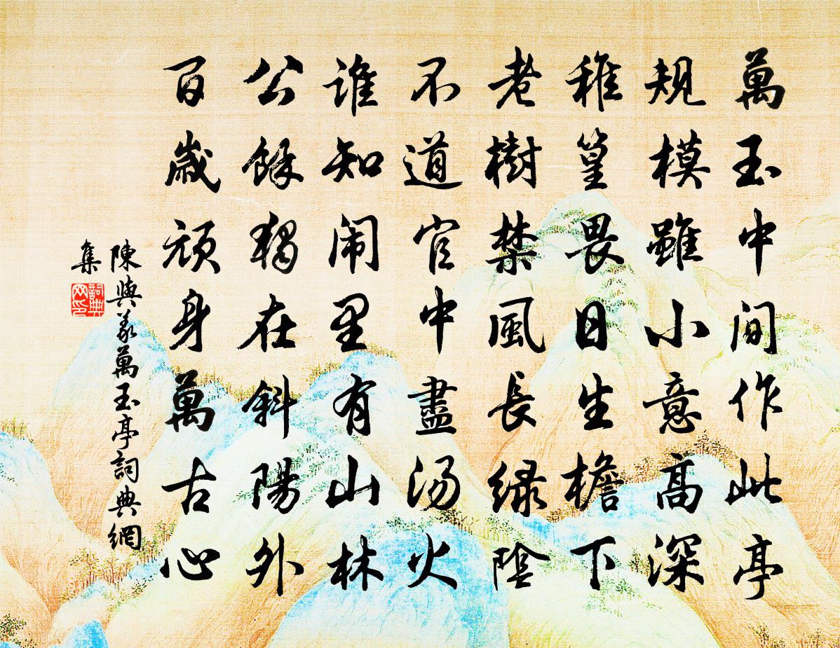 詩詞名句歷史字典書法欣賞書法字典國語詞典說文解字康熙字典古漢語字典標 題 作 者 詩 句 萬玉亭作者:陳與義 朝代:宋代萬玉亭原文萬玉中間作此亭,規模雖小意高深。稚篁畏日生檐下,老樹禁風長綠陰。不道官中盡湯火,誰知鬧里有山林。公餘獨在斜陽外,百歲頑身萬古心。詩詞問答問:萬玉亭的作者是誰?答:陳與義問:萬玉亭寫於哪個朝代?答:宋代問:陳與義的名句有哪些?答:陳與義名句大全陳與義萬玉亭書法欣賞萬玉亭書法作品詩詞推薦擷芳詞佚名〔唐代〕風搖盪,雨濛茸,翠條柔弱花頭重。春衫窄,香肌濕。記得年時,共伊曾摘。都如夢,何曾共,可憐孤似釵頭鳳。偈頌一百零二首釋紹曇〔宋代〕未入雞足山,不踏黃梅路。惡業苦無多,平白披毛去。明眼人前,一場笑具。題郭熙山水扇黃庭堅〔宋代〕郭熙雖老眼猶明,便面江山取意成。一段風煙且千里,解如明月逐人行。丙子歲三月十有二日游嵩山宿峻極中院時天氣李廌〔宋代〕松風憩俗駕,撫心愧營營。登臨念勝土,烏用千載名。願與婦子俱,終焉住神清。京師故僚以余退居近畿數賜存問因敘懷自感宋庠〔宋代〕病餘頗厭肉,欣得僧廬蔬。僧窗亦明潔,可以觀我書。弟兄冷相對,因著柏酒醉。酹餘欲拈筆,狀乃爾狼狽。我老和子瞻和陶淵明雜詩十一首蘇轍〔宋代〕五年寓黃閣,盛服朝玄端。愧無昔人姿,謬作奇章遷。還從九淵底,回望百尺巔。身世俱一夢,往來適三餐。天公自壽李劉〔宋代〕光景不相待,流年劇箭過。酸辛前詔左,科甲後生多。命蹇窮為祟,愁多睡作魔。蓋棺方事定,有酒且高歌。句廖融〔唐代〕圭灶先知曉,盆池別見天,古寺尋僧飯,寒岩衣鹿裘。雲穿搗藥屋,雪壓釣魚舟。游晉祠上李逢吉相公令狐楚〔唐代〕不立晉祠三十年,白頭重到一悽然。泉聲自昔鏘寒玉,草色雖秋耀翠鈿。少壯同游寧有數,尊榮再會便無緣。相思歸雁孟貫〔唐代〕春至衡陽雁,思歸塞路長。汀洲齊奮翼,霄漢共成行。雪盡翻風暖,寒收度月涼。直應到秋日,依舊返瀟湘。次韻君俞三詩時在山下李復〔宋代〕朝采南山薇,暮采南山蕨。零霜百草腓,薇蕨行亦絕。清溪有白石,欲煮朱可熱。故人在東山,幽桂安得結。柳枝·解凍風來末上青牛嶠〔五代〕解凍風來末上青,解垂羅袖拜卿卿。無端裊娜臨官路,舞送行人過一生。杜工部有同谷七歌其辭高古難及而音節悲壯可王炎〔宋代〕有母有母年七十,一室枵然徒壁立。茹蔬啜粥不怨尤,臥病在床無藥物。我為舉子得一官,南陔之養嗟何及。嗚呼賀新郎(壽中書舍人)佚名〔宋代〕突屼金仙屋。素秋沈、長空霽雨,萬山如浴。驚破元戎呼小隊,來看飛泉噴玉。正晚谷,清鏡圓熟。還是紫微初度陪閻安撫觀開漕河項安世〔宋代〕為民行水不妨農,為國憂民不費公。肯趁好天招惡客,能於舊貫立新功。山頭石埭千年計,海上靈查八月通,只恐唐大饗拜洛樂章昭和武則天〔唐代〕舒雲致養,合大資生。德以恆固,功由永貞。升歌薦序,垂幣翹誠。虹開玉照,鳳引金聲。甲午歲相國李公有北園寄贈之作…寓哀冥寞以廣遺韻雲武元衡〔唐代〕機事勞西掖,幽懷寄北園。鶴巢深更靜,蟬噪斷猶喧。仙醞百花馥,艷歌雙袖翻。碧雲詩變雅,皇澤葉流根。未報春夜聽客彈琵琶,作《隋唐評話》。陳維崧〔清代〕雨滴梅梢,雪消蕙葉,入春難得今宵暇。倩他銀甲淒清,鐵撥縱橫,聲聲迸碎鴛鴦瓦。依稀長樂夜烏啼,分明湓浦少章過吳門寵示淳夫子瞻唱和並惠山寄少游什朱長文〔唐代〕懷友對華月,身如匏繫何。遙聆金玉音,悵望江湖波。憂來誦三篇,調飢餉嘉禾。蘇范天下賢,閱士歲月多。鄰君次韻和厚卿答微之韓維〔宋代〕秉節當官號直清,非招不往為虞旌。書聞玉座光儒效,任久琳宮長道情。老縱筆鋒尤壯健,醉評花艷益精明。吾人名句推薦片帆西去,一聲誰噴霜竹。辛棄疾《念奴嬌·登建康賞心亭呈史致道留守》 書卷多情似故人,晨昏憂樂每相親。于謙《觀書》 倚竹不勝愁,暗想江頭歸路王之道《如夢令·一晌凝情無語》 不期修古,不法常可。韓非及後人《韓非子·五蠹》 滾滾長江東逝水,浪花淘盡英雄。楊慎《臨江仙·滾滾長江東逝水》 馬上離魂衣上淚,各自個、供憔悴程垓《酷相思·月掛霜林寒欲墜》 明日隔山嶽,世事兩茫茫。杜甫《贈衛八處士》 猿啼客散暮江頭,人自傷心水自流。劉長卿《重送裴郎中貶吉州》 辜負我,悔憐君,告天天不聞。牛嶠《更漏子·春夜闌》 閒倚博山長嘆,淚流沾皓腕。韋莊《歸國遙·春欲晚》
