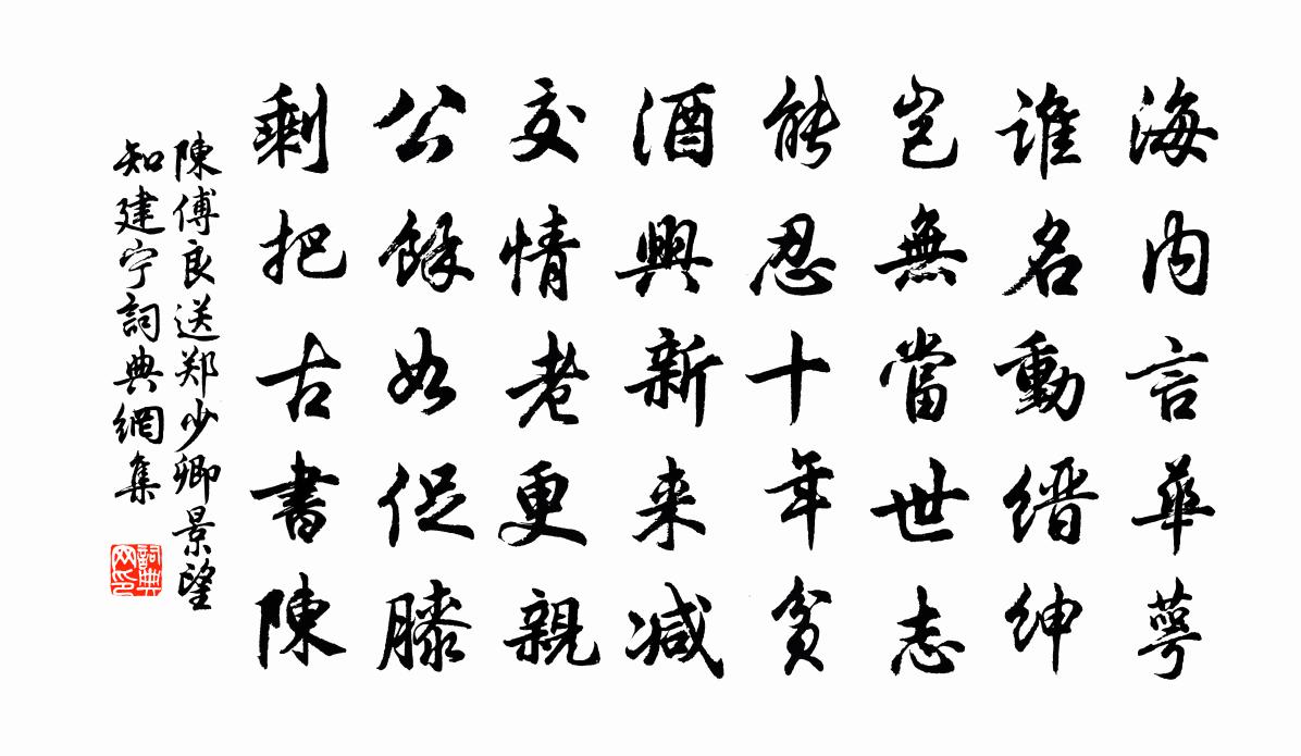 詩詞名句歷史字典書法欣賞書法字典國語詞典說文解字康熙字典古漢語字典標 題 作 者 詩 句 送鄭少卿景望知建寧作者:陳傅良 朝代:宋代送鄭少卿景望知建寧原文海內言華萼,誰名動縉紳。豈無當世志,能忍十年貧。酒興新來減,交情老更親。公餘如促膝,剩把古書陳。詩詞問答問:送鄭少卿景望知建寧的作者是誰?答:陳傅良問:送鄭少卿景望知建寧寫於哪個朝代?答:宋代陳傅良送鄭少卿景望知建寧書法欣賞送鄭少卿景望知建寧書法作品詩詞推薦挽陳知縣陳耆卿〔宋代〕為訊華亭鶴唳無,琴聲斷處客悲渠。日邊訊息花爭鬧,露下光陰柳變疎。未嘆子云新第宅,最憐定國舊門閭。風檐休日馬上陳與義〔宋代〕休日不自休,騎馬踏荒徑。卻扇受景風,今朝我無病。春雲閟晨耀,群綠澹相映。山川與朝市,一動自一靜。九衢三聖殿陳良翰〔宋代〕巨鎮標閩越,靈蹤肇晉齊。空壇仙一去,古洞佛雙棲。化石龜猶在,燒丹井已迷。塵襟誰復悟,惟聽曉猿啼。會客有美堂,周邠長官與數僧同泛湖往北山,蘇軾〔宋代〕載酒無人過子云,掩關晝臥客書裙。歌喉不共聽珠貫,醉面何因作纈紋。僧侶且陪香火社,詩壇欲斂鸛鵝軍。憑君從趙崇道求蜀紙五首趙蕃〔宋代〕病起猶余覓句勤,要題柿葉厭繽紛。陟厘盡付五十萬,今代誰為王右軍。蓬萊閣聞大風陸游〔宋代〕天風搖盪萬松聲,卷海頹山得我驚。觸灩澦堆秋起柂,鏖皋蘭下夜還營。荷戈老氣縱橫在,看劍新詩欬唾成。興盡冬至後五日夜雪復作再用韻虞儔〔宋代〕燈火黃昏漸漸收,烏薪已盡典輕裘。自篘浮螘床頭甕,誰膾新鱸江上舟。臥聽玉霙驚淅瀝,起看瓊樹怪聯鉤。多應林園即事寄舍弟紞王維〔唐代〕寓目一蕭散。銷憂冀俄頃。青草肅澄陂(一作波)。白雲移翠嶺。後沔(一作浦)通河渭。前山包鄢郢。松含風裡曹操疑冢羅公升〔宋代〕漢文因山事已定,曹操疑冢憂更深。假饒掩得腥臊骨,難掩欺孤一片心。丁亥正月新晴晚步二首楊萬里〔宋代〕急下柴車蹈晚晴,青鞋步步有沙聲。忽逢野沼無人處,兩鴨浮沉最眼明。伏枕舒邦佐〔宋代〕索索葉多雨,夢驚窗月明。一念墮世網,百慮戰心兵。天上麒麟閣,沙邊鷗鷺盟。展轉復展轉,孤鴻三兩聲。過桃川萬壽宮二首王阮〔宋代〕人共桃花事一空,兔葵無數舞春風。傷心俯仰成今古,知與劉郎事不同。除夕方岳〔宋代〕短髮蕭蕭老侍祠,夜壇三上華封辭。皇儲天啟重輪日,帝座春環萬壽卮。材具不供當世用,林居亦望太平時。羽衣簡葉丞李處權〔宋代〕傾蓋鄱陽彥,孤芳且寄林。一官方似水,五字可兼金。與世不求合,開筵猶見尋。何當鑄農器,歸望故人岑。孤山訪梅不遇簡知己武衍〔宋代〕結客尋春過舊隄,雪香雲冷鎖雙扉。隔牆應是梅花,敝卻貂裘尚未歸。竹溪直院盛稱起予草堂詩之善暇日覽之多有可劉克莊〔宋代〕險絕朝鮮國,微茫海四環。帝於焉駐蹕,人以此名山。虜讋天威近,師行雪浪間。車旗臨鳥道,草木識龍顏。露布雨杜甫〔唐代〕冥冥甲子雨,已度立春時。輕箑煩相向,纖絺恐自疑。煙添才有色,風引更如絲。直覺巫山暮,兼催宋玉悲。九日汪元卿送酒亦有相拉者以病嗽不出方回〔宋代〕紫蘭 * 園丁送,亦有鄰翁送酒來。何忽於斯須煮藥,不然夫豈怯銜杯。登高朋友空相見,抱病情懷未易開。過了頌古一百二十一首釋宗杲〔宋代〕慶體裁衣,量打水碓。毫髮不差,且居門外。玩丹砂 贈堂下道人馬鈺〔元代〕舍了家緣更捨身。即非餵虎濟飢鷹。幻軀識破自忘形。無恥無羞無染著,逍遙坦蕩氣神清。心中真佛現光明。名句推薦在天成象,在地成形。脫脫《宋史·志·卷五十二》 不知戒,後必有,恨後遂過不肯悔,讒夫多進荀子《荀子·成相》 溪谷少人民,雪落何霏霏!曹操《苦寒行》 正己而不求於人則無怨。上不怨天,下不尤人。子思《中庸·第十四章》 適與野情愜,千山高復低梅堯臣《魯山山行》 婦人依倚子與夫,同居貧賤心亦舒。張籍《征婦怨》 想烏衣年少,芝蘭秀髮,戈戟雲橫。葉夢得《八聲甘州·壽陽樓八公山作》 柳絮風輕,梨花雨細。謝逸《踏莎行·柳絮風輕》 溪上桃花無數,花上有黃鸝。黃庭堅《水調歌頭·遊覽》 人珍我棄、人棄我取沈復《浮生六記·浪遊記快》