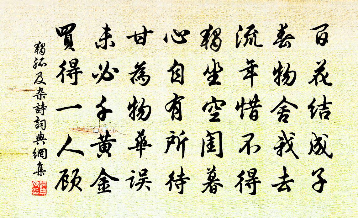 詩詞名句歷史字典書法欣賞書法字典國語詞典說文解字康熙字典古漢語字典標 題 作 者 詩 句 雜詩作者:獨孤及 朝代:唐代雜詩原文百花結成子,春物舍我去。流年惜不得,獨坐空閨暮。心自有所待,甘為物華誤。未必千黃金,買得一人顧。詩詞問答問:雜詩的作者是誰?答:獨孤及問:雜詩寫於哪個朝代?答:唐代問:雜詩是什麼體裁?答:五古獨孤及雜詩書法欣賞雜詩書法作品注釋全唐詩:卷246_27詩詞推薦哭詩六章王令〔宋代〕朝歌憂思多,暮歌無奈何。偶嘆氣亦絕,未慟血先沱。淚落入口少,不如出眼多。安得常病軀,不為瘠且瘥。寄林敏夫二首趙蕃〔宋代〕聞說君家家具區,秋風應熟季鷹鱸。雖雲禍福有倚伏,要是知凡失早圖。祝鵲王建〔唐代〕神鵲神鵲好言語,行人早回多利賂。我今庭中栽好樹,與汝作巢當報汝。寄西京通判宋次道學士梅堯臣〔宋代〕當時交友都無幾,欲問懽娛亦異今。花接上林新木變,水分清洛舊池深。嵯峨嵩色雲常在,窈窕宮牆草又侵。修竹散策釋紹嵩〔宋代〕江上雲亭霽景鮮,畫屏展盡一山川。遲遲欲去猶回首,目盡孤煙白鳥邊。聽夜泉張籍〔唐代〕細泉深處落,夜久漸聞聲。獨起出門聽,欲尋當澗行。還疑隔林遠,復畏有風生。月下長來此,無人亦到明。頌古四十五首釋如珙〔宋代〕一刀成兩段,釋得二僧爭。草鞋頭戴出,貓兒無再生。鮑待用輓詞四首林亦之〔宋代〕寒村夜雨斷人煙,卻有累累哭野田。一飯誰能吊衰草,似君此事至今傳。贊三十六祖頌釋印肅〔宋代〕破頭山下起清波,流注黃梅不奈何。四度敕宣端不動,尊威妙湛灌娑婆。乙丑春旱至四月十六夜雨陳宓〔宋代〕何處笙歌酒入唇,應慚忍渴望雲人。朝來頓覺西山黑,農圃歡聲總是春。山雲惠二物畫竹薛嵎〔宋代〕跬步園林種亦難,渭川還有幾千竿。山雲遺我冰綃軸,得與梅花相對看。贈故人二首馮時行〔宋代〕一日如三秋,屬君情所專。晨風吹初春,繞屋鵲聲乾。得非造物意,憐我徒侶單。放晴速君歸,一笑不作難。起攜君山浮遠堂王呈瑞〔宋代〕萬室東南里,炊煙落照黃。山腰圍野闊,沙尾刺江長。好景終然遠,浮雲轉已亡。幾多如湛輩,今昔一淒涼。贈張術人項安世〔宋代〕霅川張姓彪其名,惠而過我古津亭。自言有術通心靈,西庚北壬甲與丁。配以十二珠躔經,水火木金相孕刑。錯綜讀蘇叔黨汝州北山雜詩次其韻陸游〔宋代〕舊絮補破襦,生薪續微火;惸孤有凍死,自視亦已過。鄰翁冒風雪,斗酒持飲我。尖團擘霜蟹,丹漆飣山果。欣然偈頌八十七首釋慧開〔宋代〕靈山一會,泥團土塊。問訊燒香,和贓捉敗。陪幸太平公主南莊詩(一作蘇頲詩)蘇頲〔唐代〕主第山門起灞川,宸游風景入初年。鳳凰樓下交天仗,烏鵲橋頭敞御筵。往往花間逢彩石,時時竹里見紅泉。今朝學進士作大方無隅二首劉克莊〔宋代〕趨出範圍表,蓆子主之大。理同然不異,隅至此俱無。聖豈東西判,游何內外拘。鵠邊天浩浩,蝸角國區區。廣可答端韋應物〔唐代〕坐憶故園人已老,寧知遠郡雁還來。長瞻西北是歸路,獨上城樓日幾回。劉向二首陳造〔宋代〕江邊逐客楚宗卿,諫數君疏命自輕。可信後儒慚往哲,輒將強聒議更生。名句推薦少事長,賤事貴,不肖事賢,是天下之通義也。荀子《荀子·仲尼》 十輪霜影轉庭梧,此夕羈人獨向隅。晏殊《中秋月》 君是南山遺愛守,我為劍外思歸客。蘇軾《滿江紅·江漢西來》 柳暝河橋,鶯晴台苑,短策頻惹春香。吳文英《夜合花·自鶴江入京泊葑門外有感》 相逢一醉是前緣,風雨散、飄然何處。蘇軾《鵲橋仙·七夕》 袨服華妝著處逢,六街燈火鬧兒童。元好問《京都元夕》 如今白首鄉心盡,萬里歸程在夢中。清江《送婆羅門》 無父無君,是禽獸也。孟子《孟子·滕文公章句下·第九節》 妖嬈艷態,妒風笑月,長殢東君。李清照《慶清朝·禁幄低張》 子不能治子之身,惡能治國政。墨子《墨子·48章 公孟》