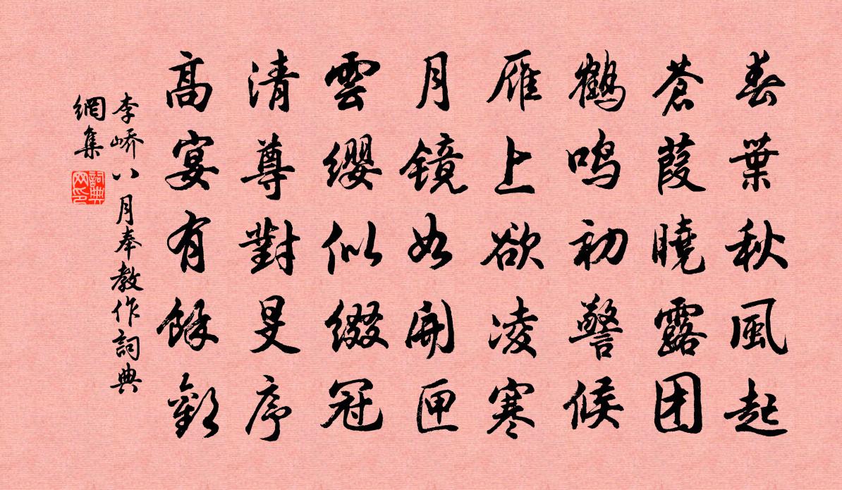 詩詞名句歷史字典書法欣賞書法字典國語詞典說文解字康熙字典古漢語字典標 題 作 者 詩 句 八月奉教作作者:李嶠 朝代:唐代八月奉教作原文春葉秋風起,蒼葭曉露團。鶴鳴初警候,雁上欲凌寒。月鏡如開匣,雲纓似綴冠。清尊對旻序,高宴有餘歡。詩詞問答問:八月奉教作的作者是誰?答:李嶠問:八月奉教作寫於哪個朝代?答:唐代問:八月奉教作是什麼體裁?答:五律李嶠八月奉教作書法欣賞八月奉教作書法作品注釋全唐詩:卷58_34詩詞推薦盧發佚名〔唐代〕十姓胡中第六胡,也曾金闕掌洪爐。少年從事夸門第,莫向尊前氣色粗。十姓胡中第六胡,文章官職勝崔盧。暫來留別山中溫古上人兄並示舍弟縉王維〔唐代〕解薜登天朝。去師偶時(一作將)哲。豈惟山中人。兼負松上月。宿昔同游止。致身雲霞末。開軒臨潁陽。臥視飛次韻子云春日見懷二首韓元吉〔宋代〕每惜春光去世,生憎鶗鴃鳴。倦遊心易賞,多病戍仍更。風雨山花過,池塘野水生。買牛歸問舍,此計會應成。題表丈三大夫書齋楊巨源〔唐代〕盛府自蓮花,群公是歲華。蘭姿丈人圃,松色大夫家。素卷堆瑤席,朱弦映絳紗。詩題三百首,高韻照春霞。南歌子(楚守周豫出舞鬟,因作二首贈之)蘇軾〔宋代〕紺綰雙蟠髻,雲欹小偃巾。輕盈紅臉小腰身。疊鼓忽催花拍、斗精神。空闊輕紅歇,風和約柳春。蓬山才調最清新【中呂】滿庭芳_鐵馬兒虛檐喬吉〔元代〕鐵馬兒虛檐月明。穿簾得失,注月前程。只聞閫外將軍令,肅肅宵征。歌舞鬧難蹅錦營,雨雲閒偏戰愁城。嘶不定東武吟曹鄴〔唐代〕心如山上虎,身若倉中鼠。惆悵倚市門,無人與之語。夜宴李將軍,欲望心相許。何曾聽我言,貪謔邯鄲女。獨上益壽美金花侯善淵〔元代〕頤生就死。死裡逃生終復始。棄假求真。真性明知身外身。無中生有。有里還無難啟口。默守神功。功滿朝無上碧折梅二首白玉蟾〔宋代〕一朵寒香已自奇,高丫兩朵更清姿。樹前樹後花都絕,折了南枝折北枝。琴曲歌辭白雪歌僧貫休〔唐代〕列鼎佩金章,淚眼看風枝。卻思食藜藿,身作屠沽兒。負米無遠近,所希升斗歸。為人無貴賤,莫學雞狗肥。斯言八月十五夜看月姚合〔唐代〕亭亭千萬里,三五復秋中。此夕光應絕,常時思不同。九霄微有露,四海靜無風。惆悵逡巡別,誰能看碧空。傅大土贊釋慧開〔宋代〕對御請經,無本可據。案上一揮,誰知落處。知落處,拍板興門槌,總是閒家具。夜來枕上得四絕句因視王性之謝其相訪也未專晁說之〔宋代〕皇祚中興徹九垓,不煩猶道宋王臺。歸鴻特比常年少,應戀黃麾不忍來。再送先之晁說之〔宋代〕君家父子真國器,棄逐那知上苑春。嵐障城中尤自樂,浦珍市里本來貧。曾憐濁俗排閶闔,蹔屈清江縱羽鱗。我老八月十五日夜半雲開然後玩月因書一時之景寄呈樂天劉禹錫〔唐代〕半夜碧雲收,中天素月流。開城邀好客,置酒賞清秋。影透衣香潤,光凝歌黛愁。斜輝猶可玩,移宴上西樓。句方慎言〔宋代〕借問城中推妙手,誰能寫得使君心。秋蘭三絕史彌寧〔宋代〕杜若江蘺汝弟兄,楚騷經里總知名。雖然臭味略相似,畢竟還他骨格清。蒼頡台李鹹用〔唐代〕先賢憂民詐,觀跡成綱紀。自有書契來,爭及結繩理。贈田九判官(梁丘)杜甫〔唐代〕崆峒使節上青霄,河隴降王款聖朝。宛馬總肥春苜蓿,將軍只數漢嫖姚。陳留阮〔王禹〕誰爭長,京兆田郎早見招月下杲飲七首楊萬里〔宋代〕坐久輕雲次第開,月光飛入酒林來。今霄只有半邊月,一半桂枝何處栽。名句推薦浩蕩離愁白日斜,吟鞭東指即天涯。龔自珍《己亥雜詩·其五》 今夫飛蓬遇飄風而行千里,乘風之勢也。商鞅《商君書·禁使》 取之非易,守之尤艱;智不足弗得,謀有失竟患,死生事也。來俊臣《羅織經·控權卷第四》 主人有酒歡今夕,請奏鳴琴廣陵客。李頎《琴歌》 黃花本是無情物,也共先生晚節香。于謙《過菊江亭》 臨水一長嘯,忽思十年初。白居易《垂釣》 相馬失之瘦,相士失之貧。司馬遷《史記·滑稽列傳》 開軒面場圃,把酒話桑麻。孟浩然《過故人莊》 黃鶴一去不復返,白雲千載空悠悠。崔顥《黃鶴樓 / 登黃鶴樓》 災人者,人必反 災之。莊子《莊子·內篇·人間世》