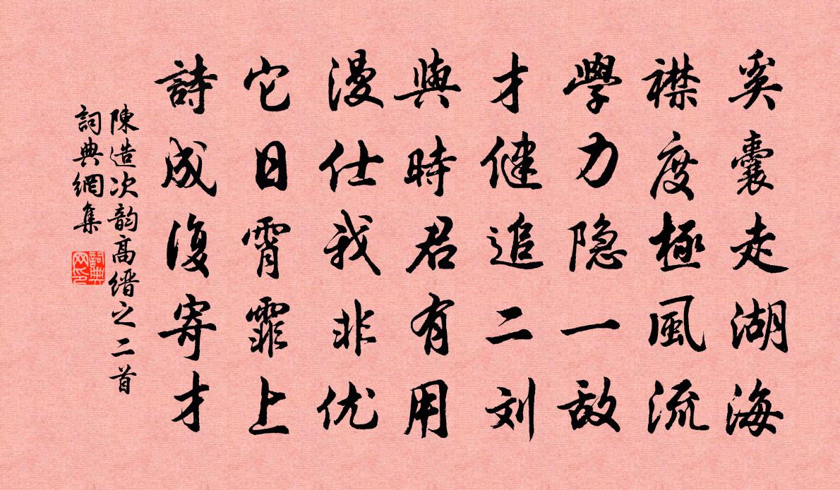 詩詞名句歷史字典書法欣賞書法字典國語詞典說文解字康熙字典古漢語字典標 題 作 者 詩 句 次韻高縉之二首作者:陳造 朝代:宋代次韻高縉之二首原文奚囊走湖海,襟度極風流。學力隱一敵,才健追二劉。與時君有用,漫仕我非優。它日霄霏上,詩成復寄才。詩詞問答問:次韻高縉之二首的作者是誰?答:陳造問:次韻高縉之二首寫於哪個朝代?答:宋代陳造次韻高縉之二首書法欣賞次韻高縉之二首書法作品詩詞推薦句吳璋〔宋代〕倒懸欲墮花如綴,背立將飛鳥似驚。行色宋伯仁〔宋代〕擬作惟揚數月留,西風勸我買歸舟。功名得失千年夢,豪傑窮通萬斛愁。 * 已花休巒酒,青山何處不登樓。漁翁婺舟道中鄭伯熊〔宋代〕筍輿時得並溪行,溪水秋來似鑒清。仰春雲山勞眼力,臨流照眼卻分明。送張學士兩浙提點刑獄司馬光〔宋代〕朝家重典刑,書府借時英。鉦鼓喧江下,雲山拂眼清。秋風鱸膾美,書日錦衣榮。勿似朱翁子,空令守邸驚。銛老許相過不至炎約堯章訪方又以事奪銛寄二王炎〔宋代〕南山藏霧豹,幾欲訪幽深。詩到如相挽,盟寒尚可尋。惠初從柳子,支遁會山陰。此事今寥落,期公慰我公。贊崇禧丈室二仙圖張榘〔宋代〕鹿皮槲葉,容顏枯槁。於巾白袍,飄然氣貌。不同者形,所同者道。金丹一丸,天地同老。水龍吟辛棄疾〔宋代〕渡江天馬南來,幾人真是經綸手?長安父老,新亭風景,可憐依舊!夷甫諸人,神州沉陸,幾曾回首!算平戎萬里送翁誠之赴闕徐照〔宋代〕我亦清湘去,何年可會君。貧惟詩送別,愁覺酒難醺。郊祀隨天仗,台上識瑞雲。定知分美郡,音問欲相聞。玉樓春(同官載酒為叔母壽次韻為謝時自潼過遂)魏了翁〔宋代〕射洪官酒元曾醉。又六十八年重至。長江驛畔水如藍,也應似、向人重翠。人生豈必高官貴。願長對、詩書習氣。再贈束孝先王令〔宋代〕玉缺見不撓,劍折佑真剛。張目不見心,人固未易量。念我未知子,徒知外觀望。安識子所懷,赤日包白光。去去句汪晫〔宋代〕減燭閔娥傷。和潘叔治題劉道士房畫薛稷六鶴圖六首其四舞梅堯臣〔宋代〕如逢僊圃風,飄颻奮雙翅。拊節餘欲助,和歌誰爾類。但看矯然姿,固於流雪異。宮詞張公庠〔宋代〕仙韶一部選輕盈,獨得君王記姓名。中使忽來催待宴,匆匆不許暫調笙。好事近(黃瓊)楊無咎〔宋代〕花里愛姚黃,瓊苑舊曾相識。不道風流種在,又一枝傾國。擬圖遮斷倚闌人,休教妄攀摘。其奈老來情減,負十分夏日山居好十首舒岳祥〔宋代〕夏日山居好,涼風樹下生。三茶還可瀹,二韮尚堪烹。永日閒言語,平生實講明。前空飛赤電,燕坐不須驚。虞美人張炎〔宋代〕修眉刷翠春痕聚。難翦愁來處。斷絲無力綰韶華。也學落紅流水、到天涯。那回錯認章台下。卻是陽關也。待將新鷓鴣天辛棄疾〔宋代〕石壁虛雲積漸高。溪聲繞屋幾周遭。自從一雨花零亂,卻愛微風草動搖。呼玉友,薦溪毛。殷勤野老苦相邀。杖藜七月一日出城舟中苦熱蘇軾〔宋代〕涼飆呼不來,流汗方被體。稀星乍明滅,暗水光瀰瀰。香風過蓮芡,驚枕裂魴鯉。欠伸宿酒余,起坐濯清泚。火雲題琦公贊光堂晁說之〔宋代〕山川固高深,不掩珠玉光。道人覺物者,明明豈自藏。奈何一世中,瞑醉不我臧。收歛萬古志,風雨一茅堂。問之涵碧亭葛洪〔宋代〕雨歇留蒸濕,明來得翳涼。雙嬉魚欲動,萬個竹添長。景到煩詩答,嘆多厄日忙。茲游端勝絕,不是學高陽。名句推薦自昔佳人多薄命,對古來、一片傷心月。辛棄疾《賀新郎·用前韻送杜叔高》 風無纖埃,雨無微津。左思《三都賦》 野梅燒不盡,時見兩三花劉基《古戍》 閨中風暖,陌上草薰江淹《別賦》 夫萬事萬物之理,不外於吾心。王陽明《傳習錄·卷中·答顧東橋書》 荊州麥熟繭成蛾,繰絲憶君頭緒多。李白《荊州歌》 有桃花紅,李花白,菜花黃。秦觀《行香子·樹繞村莊》 善善不進,惡惡不退;賢者隱蔽,不肖在位;國受其害。黃石公《三略·上略》 佇立傷神。無奈輕寒著摸人。朱淑真《減字木蘭花·春怨》 百年成之不足,一旦壞之有餘。佚名《增廣賢文·上集》