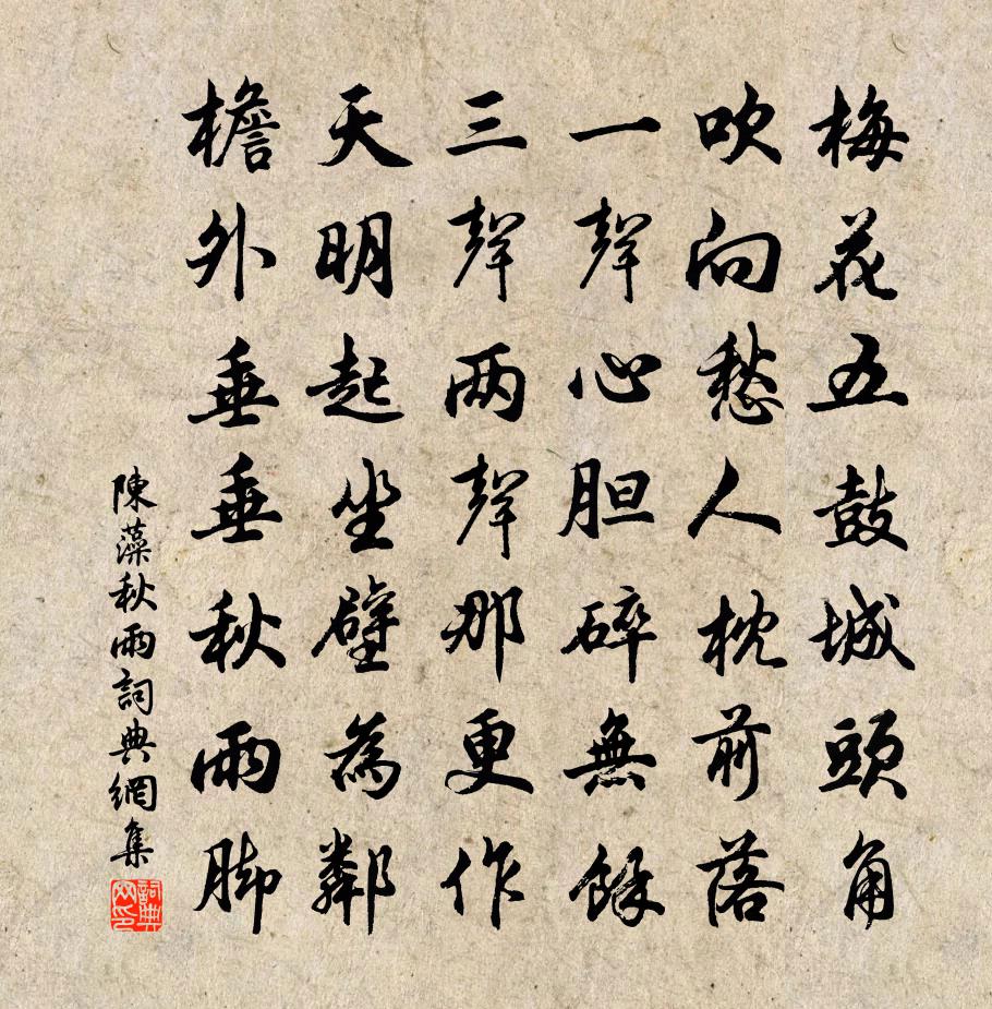 詩詞名句歷史字典書法欣賞書法字典國語詞典說文解字康熙字典古漢語字典標 題 作 者 詩 句 秋雨作者:陳藻 朝代:宋代秋雨原文梅花五鼓城頭角,吹向愁人枕前落。一聲心膽碎無餘,三聲兩聲那更作。天明起坐壁為鄰,檐外垂垂秋雨腳。詩詞問答問:秋雨的作者是誰?答:陳藻問:秋雨寫於哪個朝代?答:宋代陳藻秋雨書法欣賞秋雨書法作品詩詞推薦紅梅蘇泂〔宋代〕等觀非白亦非紅,開落那知色自空。落葉成陰花又子,幾將心事托東風。奉餞郎中四兄罷餘杭太守承恩加侍御史…赴汝南行營劉長卿〔唐代〕星使三江上,天波萬里通。權分金節重,恩借鐵冠雄。梅吹前軍發,棠陰舊府空。殘春錦障外,初日羽旗東。岸柳秋日登滕王閣彭孫遹〔清代〕客路逢秋思易傷,江天煙景正蒼涼。依然極浦生秋水,終古寒潮送夕陽。高士幾回亭草綠?梅仙一去嶺雲荒。臨風八聲甘州李好古〔宋代〕古揚州、壯麗壓長淮,形勝絕東南。問竹西歌吹,蜀岡何許,楊柳鬖鬖。行樂誰家年少,兩兩更三三。知我江南客佳人停板圖唐寅〔明代〕仙娥記曲世無雙,下直歸來日滿窗。隨手托牙鏤板在,低頭不語暗尋腔。五月十七日冒暑報謁張九成〔宋代〕炎熱不可觸,報謁當及時。登車汗如洗,黽勉將何之。城隅行詰屈,路轉沿江湄。仰看山列黛,俯瞰水淪漪。心寬柳梢青楊炎正〔宋代〕生紫衫兒。影金領子,著得偏宜。步穩金蓮,香熏紈扇,舞轉花枝。捧杯更著膎。唱一個、新行耍詞。玉骨冰肌澹岩謝用賓〔宋代〕雲山野客,家在浯溪。乘風而來,泛月而歸。送李回李頎〔唐代〕知君官屬大司農,詔幸驪山職事雄。歲發金錢供御府,晝看仙液注離宮。千岩曙雪旌門上,十月寒花輦路中。不睹贈夏秀才李中〔唐代〕軒車紫陌競尋春,獨掩衡門病起身。步月怕傷三徑蘚,取琴因拂一床塵。明時儻有丹枝分,青鑒從他素髮新。況是臘月二十二夜漏下數刻小飲徑醉坐小合睡傍無劉克莊〔宋代〕丹書大聖初元,白髮先朝遺老。浪言鐵筆猶存,不覺玉山自倒。浣溪沙(科斗)王千秋〔宋代〕燈火闌珊欲曉時。夜遊人倦總思歸。更須冰蛹替挼絲。玉篆古文光燦爛,花垂零露影參差。月寒煙淡最相宜。少年游薩都剌〔元代〕去年人在鳳凰池。銀燭夜彈絲。沉火香消,梨雲夢暖,深院繡簾垂。今年冷落江南夜,心事有誰知。楊柳風和,海蠻子歌劉禹錫〔唐代〕蠻語鉤輈音,蠻衣斑斕布。熏狸掘沙鼠,時節祠盤瓠。忽逢乘馬客,恍若驚麏顧。腰斧上高山,意行無舊路。八朋七日省真苦雨三首司馬光〔宋代〕菊蕊如排粟,青青見葉心。未嘗窺白日,何以散黃金。欹側疏籬短,綿延墁草深。寒蛩爾何與,終夕亦悲吟。次韻葉茵〔宋代〕懶作千年調,偷閒得幾回。吟壇元不峻,俗駕可曾來。蘚碧牆陰合,榴紅屋角開。枕肱真樂在,飲水當傳杯。皆山夜起趙文〔宋代〕上田下田水嘵嘵,南嶺北嶺蟲啁啁。如此月明誰管領,可憐滿壁海棠梢。陌上二女梅堯臣〔宋代〕素手搴冪{上四下離},柔纖明春荑。轉眄動桂葉,陽語啟瓠犀。阿姊金盛珠,阿妹繅籍圭。吹香襲行路,豈獨下對月了殘經贊釋了惠〔宋代〕好念脫空經,不如山月轉。將謂了多時,猶有者一卷。奉和袁使君高,郡中新亭會張鍊師晝會二上人皎然〔唐代〕置亭隱城堞,事簡跡易幽。公性崇儉素,雅才非廣求。傍檐竹雨清,拂案杉風秋。不移府中步,登茲如遠遊。坐覺名句推薦自見之謂明。韓非及後人《韓非子·喻老》 斟酌乎質文之間,而隱括乎雅俗之際,可與言通變矣。劉勰《文心雕龍·通變》 不論平地與山尖,無限風光盡被占羅隱《蜂》 別君去兮何時還?且放白鹿青崖間。須行即騎訪名山。李白《夢遊天姥吟留別 / 別東魯諸公》 駐馬橋西,還系舊時芳樹。高觀國《玲瓏四犯·水外輕陰》 仁義禮善之於人也,辟之若貨財粟米之於家也。荀子《荀子·大略》 風住塵香花已盡,日晚倦梳頭。李清照《武陵春·春晚》 不知其子視其友,不知其君視其左右。荀子《荀子·性惡》 無善而致人譽,不如無惡而致人毀。洪應明《菜根譚·概論》 尊嚴而憚,可以為師荀子《荀子·致士》