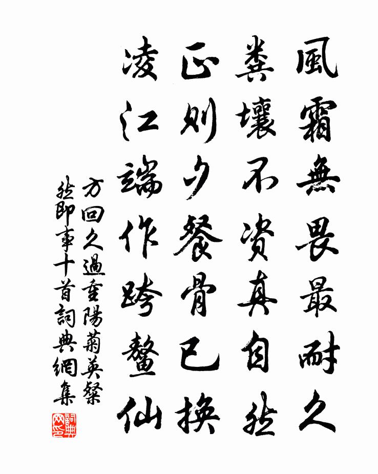 詩詞名句歷史字典書法欣賞書法字典國語詞典說文解字康熙字典古漢語字典標 題 作 者 詩 句 久過重陽菊英粲然即事十首作者:方回 朝代:宋代久過重陽菊英粲然即事十首原文風霜無畏最耐久,糞壤不資真自然。正則夕餐骨已換,凌江端作跨鰲仙。詩詞問答問:久過重陽菊英粲然即事十首的作者是誰?答:方回問:久過重陽菊英粲然即事十首寫於哪個朝代?答:宋代方回久過重陽菊英粲然即事十首書法欣賞久過重陽菊英粲然即事十首書法作品詩詞推薦壽昌道中壁間有烏石寺和其韻葛立方〔宋代〕鍾情翠巘倚崚嶒,付與芒鞋與瘦藤。君賜一麾方作吏,天融萬壑卻輪僧。擬將炬矱追廉杜,未許機鋒嗣秀能。投幘六親五法佚名〔先秦〕以家為鄉,鄉不可為也;以鄉為國,國不可為也;以國為天下,天下不可為也。以家為家,以鄉為鄉,以國為國,偈頌一百零一首釋慧性〔宋代〕有結有解俱錯,到底無繩自縛。一夏九十日終,個個眉須墮落。入水長人,填溝塞壑。相逢只解那斯祁,明眼衲僧劉少師妻獻園宅為景靈宮基二首張嵲〔宋代〕漢家原廟廠雄規,欲及櫻桃果獻時。豈為夫人能體國,將軍本不以家為。橫山聳翠柳敘〔宋代〕蘭陰山跨浴溪南,春破峰顏三月三。松柏森森翻野籟,竹梧隱隱撲晴嵐。高摩雲漢千尋路,倒浸峰巒百尺潭。此外信府同知黃侯名其讀書之室曰廣居戴表元〔宋代〕隘夫護藩畛,得少便有餘。達士心曠然,清明如太虛。海岳東鼎俎,羲駕走軒車。唯諾無不行,尚懷豚與魚。嗟茲偈八首釋明辯〔宋代〕十五日已前不得去,少林雙履無藏處。十五日已後不得住,桂子天香和雨露。浣溪沙(侑劉恭父別酒)張孝祥〔宋代〕射策金門記昔年。又交藩翰入陶甄。不妨衣缽再三傳。粉淚但能添楚竹,羅巾誰解系吳船。捧杯猶願小留連。虞美人(劉帥生日)趙彥端〔宋代〕疏梅淡月年年好。春意今年早。迎長時節近佳辰。看取袞衣黃髮、畫麒麟。酒中倒臥南山綠。起舞人如玉。風流椿譙令以眎堰絕色見示次其韻李流謙〔宋代〕我瘠不妨天下肥,期公他日到黃扉。憫農一念通精祲,定遣驚雷飛。紅樓夢十二曲——飛鳥各投林曹雪芹〔清代〕為官的家業凋零,富貴的金銀散盡。有恩的死裡逃生,無情的分明報應。欠命的命已還,欠淚的淚已盡:冤冤相報為郡王禹偁〔宋代〕為郎為郡意何闌,羞拂朝纓蓋病顏。賜筆任分雙管赤,梳頭已是二毛斑。道孤自合先歸隱,俸薄無由便買山。出坐菊花新葛長庚〔宋代〕銅壺四水。寒生素被。夜迢迢,煙月熹微。池浸霜荷,檻竹響,井楓飛。寶枕潭無夢,念忡忡地。形留神往,鎮日張使君以畫屏求題章甫〔宋代〕西湖景物天與奇,歲晚春風常探支。水邊竹外更幽絕,一夜花開南北枝。何處飛來兩鸂鶒,影碎晴波盪春碧。荷蓋東山彭澤鄧林〔宋代〕氣靈風鶴屐折齒,壁後寘人汗如洗。樵漁雜沓坐林間。蜉蝣塵埃不可攀,石頭擾擾柴桑閒。送鄭秉叔西征王邁〔宋代〕聊轡而西三十程,風餐雨宿費經營。間關閱舊途經熟,老大逢新曆日驚。我正與時相枘鑒,君方隨詔赴弓旌。獨班寄新安梁殿丞趙湘〔唐代〕郡孤詩句許秋供,見說多閒卻似慵。移樹好禽來獨院,上樓高雪在諸峰。泉當月際搖吟影,蘚自雲邊得屣蹤。此興守居園池雜題北園文同〔宋代〕春風有多少,盡入使君家。當與那人樂,滿園桃李花。馮家女楊維楨〔元代〕馮家女,綠髮盤雙鴉,亂離棄鄉土。聘入將軍家,將軍愛幸諸婦妒。顏色粹美無疵瑕,掩鼻襲餘術,淚眼啼春華。太常引劉秉忠〔元代〕長安三唱曉雞聲。誰不被,利名驚。攪鏡照星星。都老卻、當年後生。山林蒼翠,江湖煙景,歸去沒人爭。休望濯名句推薦人無遠慮,必有近憂。佚名《增廣賢文·上集》 快上西樓,怕天放、浮雲遮月。辛棄疾《滿江紅·中秋寄遠》 塞上長城空自許,鏡中衰鬢已先斑。陸游《書憤五首·其一》 雲盡月如練,水涼風似秋。歐陽詹《荊南夏夜水樓懷昭丘直上人云夢李莘》 一襟余恨宮魂斷,年年翠陰庭樹。仇遠《齊天樂·蟬》 白髮漁樵江渚上,慣看秋月春風。楊慎《臨江仙·滾滾長江東逝水》 枕上潛垂淚,花間暗斷腸。魚玄機《贈鄰女 / 寄李億員外》 秋風生渭水,落葉滿長安。賈島《憶江上吳處士》 近淚無乾土,低空有斷雲。杜甫《別房太尉墓》 親愛我,孝何難。親憎我,孝方賢。李毓秀《弟子規·入則孝》