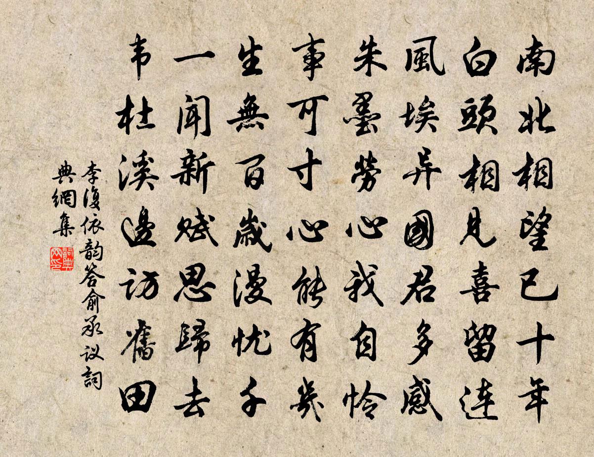 詩詞名句歷史字典書法欣賞書法字典國語詞典說文解字康熙字典古漢語字典標 題 作 者 詩 句 依韻答俞承議作者:李復 朝代:宋代依韻答俞承議原文南北相望已十年,白頭相見喜留連。風埃異國君多感,朱墨勞心我自憐。事可寸心能有幾,生無百歲漫憂千。一聞新賦思歸去,韋杜溪邊訪舊田。詩詞問答問:依韻答俞承議的作者是誰?答:李復問:依韻答俞承議寫於哪個朝代?答:宋代李復依韻答俞承議書法欣賞依韻答俞承議書法作品詩詞推薦履方攜姜坦道詩卷相過為書其後章甫〔宋代〕姜侯同鄉井,憶昨初見時。春風頭陀菴,快作六字主寺。一別十五年,漂流各萍轉。君攜此軸來,如覿故人面。淤臨江仙·千里長安名利客劉彤〔宋代〕千里長安名利客,輕離輕散尋常。難禁三月好風光。滿階芳草綠,一片杏花香。記得年時臨上馬,看人眼淚汪汪。既別晦庵復成二詩呈之近欲同游善權不果臨行趙蕃〔宋代〕去始豐城劍,還終大仰禪。縱橫幾詩句,摹寫百山川。竹使承流日,蓬山促召年。儂行亦何為,白首使如遷。洛陽春/一落縈陳師道〔宋代〕酒到橫波嬌滿。和香噴面。攀花落雨祝東風,誚不借、周郎便。背立腰肢挪拈。更須回盼。多生不作好因緣,甚只出門偶成陳著〔宋代〕雙鷺飛飛高復低,復低飛下近山溪。一聲樵唱山前路,卻又飛歸翡翠西。投徐端公許棠〔唐代〕無謀尋舊友,強喜亦如愁。丹桂阻丹懇,白衣成白頭。窮吳迷釣業,大漢事貧游。霄漢期提引,龍鍾未擬休。詠松胡仲弓〔宋代〕蕭蕭琴瑟鳴,灑灑霜露下。願期素心人,同游明月夜。寄周洪道參政陸游〔宋代〕菱舟煙雨久思歸,貪戀明時未拂衣。乞與一城教睡足,猶能覓句寄黃扉。和劉後村梅花百詠方蒙仲〔宋代〕簾圍玉館愁吟盡,錦藉瑤瓶怕摘殘。姑息梅花詎須爾,山家何處有朱欄。歸田賦張衡〔兩漢〕游都邑以永久,無明略以佐時。徒臨川以羨魚,俟河清乎未期。感蔡子之慷慨,從唐生以決疑。諒天道之微昧,追次韻樊伯撝見貺陳著〔宋代〕自笑我何如,叨年八十餘。戶門覺老病,梅竹護窮居。拙計信天鳥,殘生減水魚。時將一字命,仰臥向空書。再和陳起予二首王邁〔宋代〕誦君詩一點頭,華摛春艷氣凌秋。耳邊厭聽兩蛙部,眼底新夸五鳳樓。花信風殘生酒興,竹枝歌罷動閨愁。蘭亭已元宵雨十六日晴二首李洪〔宋代〕每恨元宵雨,收燈遽喜晴。喧闐雖倦逐,勃窣漫徒行。入夜寒無賴,隨人月有情。旅懷忘晤賞,擁鼻有詩成。以王通一所畫小舟橫截春江圖為韓無咎壽章甫〔宋代〕江上春風花滿樹,春水才平舊痕處。何人笑傲一扁舟,橫截千波萬波去。王郎有句藏毫端,寫出生綃半幅間。明窗仙女詞楊衡〔唐代〕玉京初侍紫皇君,金縷鴛鴦滿絳裙。仙宮一閉無訊息,遙結芳心向碧雲。游曲江分韻得月字姚勉〔宋代〕曲江磯頭山崒嵂,此景江南夸第一。漁舟晚弄煙煙波閒,市樓春映晴嵐出。擁輿長吟入畫圖,席地草飲成真率。更次韻歐陽伯威見和趙蕃〔宋代〕宗派滔滔是,於今得障流。無悲和者寡,故愈暗中投。我願下取履,君其高臥樓。穹岡如許割,肯愛一官休。定風波(丙寅四月吳門西樓之集)蔡伸〔宋代〕老去情鐘不自持。篸花酌酒送春歸。玉貌冰姿人窈窕。一笑。清狂豈減少年時。欲上香車俱脈脈,半簾花影月平西李與賢來訪,自言所居幽勝,甚似剡溪。因以楊萬里〔宋代〕山似剡溪溪似油,人如詩句句如秋。無邊春里花饒笑,有底忙時草喚愁。歷陽十詠之一厤湖賀鑄〔宋代〕昔也萬家邑,今為無底淵。城郭泯遺蹟,人民安得全。弔古一回首,薄暮愁風煙。拯溺不無意,吾生後千年。名句推薦喪不過三年,示民有終也。孔子及其弟子《孝經·喪親》 酒意詩情誰與共?淚融殘粉花鈿重。李清照《蝶戀花·暖雨晴風初破凍》 殘螢棲玉露,早雁拂金河。許渾《早秋三首·其一》 孤雁飛南遊,過庭長哀吟。曹植《雜詩六首·其一》 黃河西來決崑崙,咆哮萬里觸龍門。李白《公無渡河》 人稟七情,應物斯感,感物吟志,莫非自然。劉勰《文心雕龍·明詩》 竹葉於人既無分,菊花從此不須開。杜甫《九日五首·其一》 浴不必江海,要之去垢;馬不必騏驥,要之善走。司馬遷《史記·外戚世家》 不修身而求個名於世者,猶貌甚惡而責妍影於鏡也。顏之推《顏氏家訓·名實篇》 無端和淚拭胭脂,惹教雙翅垂張泌《蝴蝶兒·蝴蝶兒》