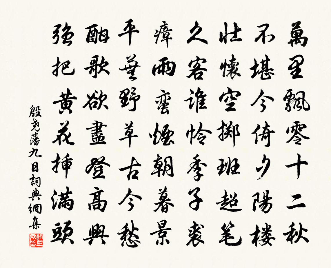 詩詞名句歷史字典書法欣賞書法字典國語詞典說文解字康熙字典古漢語字典標 題 作 者 詩 句 九日作者:殷堯藩 朝代:唐代九日原文萬里飄零十二秋,不堪今倚夕陽樓。壯懷空擲班超筆,久客誰憐季子裘。瘴雨蠻煙朝暮景,平蕪野草古今愁。酣歌欲盡登高興,強把黃花插滿頭。詩詞問答問:九日的作者是誰?答:殷堯藩問:九日寫於哪個朝代?答:唐代問:九日是什麼體裁?答:七律殷堯藩九日書法欣賞九日書法作品注釋全唐詩:卷492-24詩詞推薦詠史六首班固樂雷發〔宋代〕請室冤魂叫不聞,神丘隆碣謾遺文。平生詞藻誰知己,腐鼠孤雛卻悞君。城西射弓挺之以病不至簡示新詩有唯應欠我渭蔡襄〔宋代〕雪後西郊物外清,官閒乘興此閒行。出門疏樹無塵色,入內流渠帶野聲。近臘酒醪香更釅,得風弓箭力還生。知君次韻嚴子文旅中見贈范成大〔宋代〕杯中疇昔共江天,傾座新詩報警聯。海浦寸心空共月,京華雙鬢各凋年。交情敢說同方友,句法甘從弟子員。有意別盧綸暢當〔唐代〕故交君獨在,又欲與君離。我有新秋淚,非關宋玉悲。紹興二十八年祀圜丘學士院〔宋代〕帝出於震,巽惟齊明。律日姑洗,以示潔清。我交於神,蠲意必精。既興而往,祈監斯誠。寫意二首牟融〔唐代〕寂寥荒館閉閒門,苔徑陰陰屐少痕。白髮顛狂塵夢斷,青氈泠落客心存。高山流水琴三弄,明月清風酒一樽。醉後贈南首座兼簡盧老二首趙蕃〔宋代〕旋糊紙屋過冬寒,客至成開去即關。我亦借寮成掛搭,未妨朝慕往仍還。寄永興窣兄万俟紹之〔宋代〕憶昔京華聚首時,大兄常念阿連痴。別來相望天涯遠,長誦對床風雨詩。將至杉木鋪望野人居陳與義〔宋代〕春風漠漠野人居,若使能詩我不如。數株蒼檜遮官道,一樹桃花映草廬。梨花董嗣杲〔宋代〕辦取看花沽酒錢,素肌嬌怯冷籠煙。愁遺弟子離園日,淚盡宮妃過驛年。縞夜露零啼恨濕,扶春雪壓洗妝妍。鞦韆水龍吟劉志淵〔元代〕閒人閒樂琴書味。行胡朗反貨藥囊符水。頓然識破,沾名作解,蹉跎真計。枯木岩前累。要撅劣、諸緣總棄。剔開龜山禪寺姚望之〔宋代〕萬山深處遠輪蹄,古寺雍熙詔賜題。坐望竺乾諸佛近,徙憑菌閣十方低。靈岩頻見玄猿度,琪樹 * 白鶴樓。不覺綠萼梅蘇泂〔宋代〕煉得丹成卸羽衣,更餐日彩弄晨曦。九疑魂斷歸無計,自倚湘筠醉幾時。南鄉子佚名〔宋代〕把酒祝江梅。春到南枝早早開。人在隴頭凝望久,徘徊。驛使如今尚未來。寄語莫相催。直待東風細剪裁。只恐未揚州雜詠七首晁補之〔宋代〕皁莢村南三里許,春江不隔一程遙。雙堤鬥起如牛角,知是隋家萬里橋。追和東坡梅花十絕王之道〔宋代〕莫怪風前玉斚飛,飲酣初喜傳花枝。正當北雪消殘後,恰直東風料峭時。頌古一百則釋正覺〔宋代〕草漫漫,門裡門外君自看。荊棘林中下腳易,夜明簾外轉身難。看看,幾何般。且隨老木同寒瘠,將逐春風入燒瘢送梵才上人歸天台吳育〔宋代〕幾年瓶缽帝城棲,看盡塵勞息盡機。詩妙偶因餘力到,名高卻與本心違。雲深路入千山去,歲晚身攜一錫歸。林下游廬山將歸有作二首曹勛〔宋代〕上真應御白雲閒,肅立香霏玉殿寒。五百年中今應運,原還中土漢衣冠。芥齏楊萬里〔宋代〕茈姜馨辣最佳蔬,孫芥芳辛不讓渠。蟹眼嫩湯微熟了,鵝兒新酒未醒初。棖香醋釅作三友,露葉霜芽知幾鋤。自笑名句推薦萬里雲間戍,立馬劍門關。崔與之《水調歌頭·題劍閣》 日色已盡花含煙,月明欲素愁不眠。李白《長相思三首·其二》 蠶無夏織桑充寨,田廢春耕犢勞軍。杜荀鶴《題所居村舍》 山光悅鳥性,潭影空人心。常建《題破山寺後禪院》 一曲當筵落淚,重掩羅巾。晏殊《山亭柳·贈歌者》 翠華想像空山里,玉殿虛無野寺中。杜甫《詠懷古蹟五首·其四》 深居俯夾城,春去夏猶清。李商隱《晚晴》 月有盈虧花有開謝,想人生最苦離別。張鳴善《普天樂·詠世》 不以文害辭,不以辭害志。以意逆志,是為得之。孟子《孟子·萬章章句上·第四節》 主道明則下安,主道幽則下危。故下安則貴上,下危則賤上。荀子《荀子·正論》
