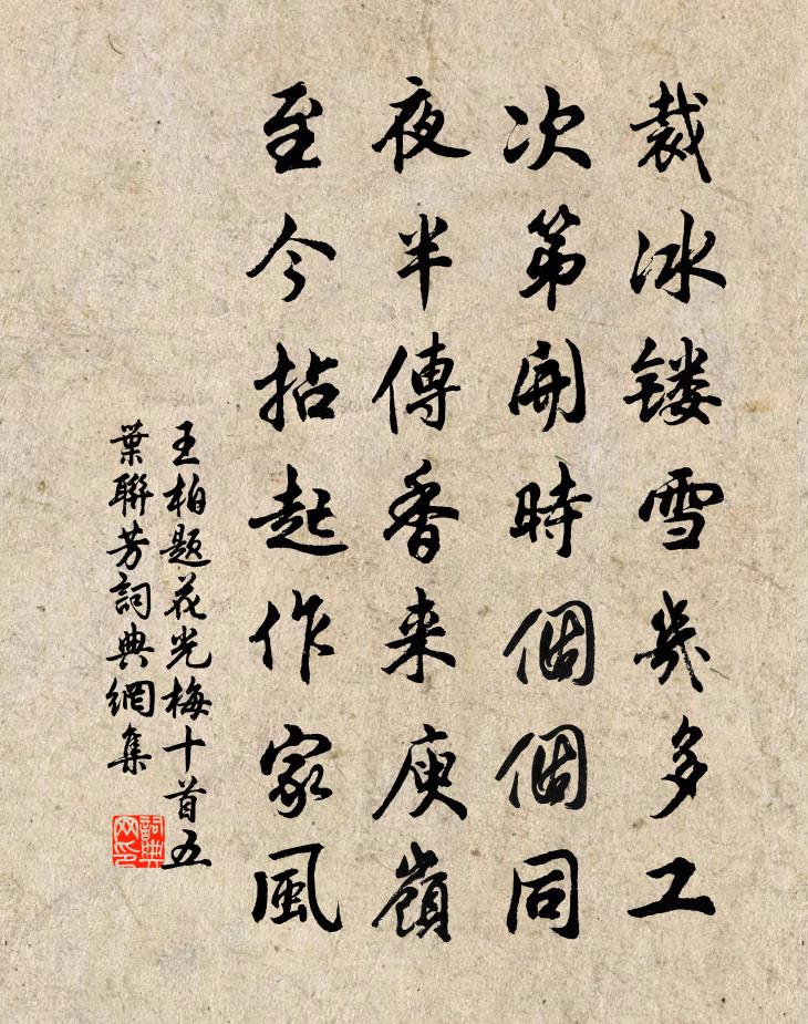 詩詞名句歷史字典書法欣賞書法字典國語詞典說文解字康熙字典古漢語字典標 題 作 者 詩 句 題花光梅十首五葉聯芳作者:王柏 朝代:宋代題花光梅十首五葉聯芳原文裁冰鏤雪幾多工,次第開時個個同。夜半傳香來庾嶺,至今拈起作家風。詩詞問答問:題花光梅十首五葉聯芳的作者是誰?答:王柏問:題花光梅十首五葉聯芳寫於哪個朝代?答:宋代王柏題花光梅十首五葉聯芳書法欣賞題花光梅十首五葉聯芳書法作品詩詞推薦偈七首釋允韶〔宋代〕一五二五,機輪無阻。南山起雲,北山下雨。有人卻道錦上添花,有人又道泥中洗土。有人又道離此二途,便見丹和昭文相公上巳宴歐陽修〔宋代〕一雨初消九陌塵,秉蘭修禊及芳辰。恩深始錫龍池宴,節正須知鳳歷新。紅琥珀傳杯瀲灩,碧琉璃瑩水奫淪。上林題扇張鎡〔宋代〕梧竹風來玉枕涼,月高偏愛占華堂。休言境界親曾有,畫出如聞夜氣香。和楊高品馬廄猢猻梅堯臣〔宋代〕嘗聞養騏驥,辟惡系獼猴。供春新教藝,將軍舊病偷。聊看緣柱杪,尚想傍崖頭。更祝南州使,如拳試為求。柳梢青(次韻趙德莊)管鑒〔宋代〕神仙墮謫。天為賦與,經綸才識。蓋代聲名,宗英惟向,翰林頌白。黃堂一笑留客。算此處、淹留未得。且對清尊送魏錄事劉克莊〔宋代〕君去民稱頌,吾州錄事廉。平心決蠻觸,恕筆讞髠鉗。守法仁人勇,持身處女嚴。城中旗傍盛,不欠惡詩拈。贈逍遙子蔡元厲〔宋代〕身在逍遙境,開庵寓此身。紅塵不到處,白日獨閒人。月滿雲月夜,花留玉洞春。坐中無俗客,猿鶴故相親。二月十六日,與張、李二君游南溪,醉後,相蘇軾〔宋代〕終南太白橫翠微,自我不見心南飛。行穿古縣並山麓,野水清滑溪魚肥。須臾渡溪踏亂石,山光漸近行人稀。窮探再和並答楊次公蘇軾〔宋代〕昆盧海上妙高峰,二老遙知說此翁。聊復艤舟尋紫翠,不妨持節散陳紅。高懷卻有雲門興,好句真傳雪竇風。唱我別息道二十二弟晃沖之〔宋代〕中令有清德,風流二百年。舉家惟食粥,絕口不言錢。里閈容吾老,庭闈賴汝賢。陶丘過范蠡,莫泛五湖船。核舟記魏學洢〔明代〕明有奇巧人曰王叔遠,能以徑寸之木,為宮室、器皿 、人物,以至鳥獸、木石,罔不因勢象形,各具情態。嘗貽秋中寄崔道士姚合〔唐代〕貧居雀喧噪,況乃靜巷陌。夜眠睡不成,空庭聞露滴。旁有一杯酒,歡然如對客。月光久逾明,照得筆墨白。平生金陵一本同下題作二首王貞白〔唐代〕六代江山在,繁華古帝都。亂來城不守,戰後地多蕪。寒日隨潮落,歸帆與鳥孤。興亡多少事,回首一長吁。憶齊安郡杜牧〔唐代〕平生睡足處,雲夢澤南州。一夜風欺竹,連江雨送秋。格卑常汩汩,力學強悠悠。終掉塵中手,瀟湘釣漫流。送勝因長老釋重顯〔宋代〕黃梅散席三百載,續焰聯芳事空在。宗兮派兮生異端,花兮葉兮太煩碎。韶陽間出多慷慨,權要雄雄曾絕待。曲木鹽井李新〔宋代〕鑿到金輪水際通,綆長牛領血垂紅。作梅後日看調鼎,擬雪前人慾散空。波素儘熬瀚海,虎形不待鹽南風。輸官已別曹教授三首裘萬頃〔宋代〕江花岸柳太多情,長逐春風管送迎。我亦思歸歸未得,夜窗愁聽杜鵑聲。寄華山司空侍郎徐夤〔唐代〕山掌林中第一人,鶴書時或問眠雲。莫言疏野全無事,明月清風肯放君。桃源憶故人(追和東坡韻呈曾倅子修三首)王之道〔宋代〕逢人借問春歸處。遙指蕪城煙樹。收盡柳梢殘雨。月闖西南戶。遊絲不解留伊住。漫惹閒愁無數。燕子為誰來去。柳李冶〔唐代〕最愛纖纖曲水濱,夕陽移影過青蘋。東風又染一年綠,楚客更傷千里春。低葉已藏依岸棹,高枝應閉上樓人。舞腰名句推薦瀉水置平地,各自東西南北流。鮑照《擬行路難十八首》 晚風收暑,小池塘荷淨。劉光祖《洞仙歌·荷花》 故明主必謹養其和,節其流,開其源,而時斟酌焉。荀子《荀子·富國》 惟有兩行低雁,知人倚、畫樓月。范成大《霜天曉角·梅》 暗教愁損蘭成,可憐夜夜關情張炎《清平樂·候蛩淒斷》 松江上,念故人老矣,甘臥閒雲。吳文英《沁園春·送翁賓暘游鄂渚》 話須通俗方傳遠,語必關風始動人。馮夢龍《警世通言·卷十二》 無限河山淚,誰言天地寬夏完淳《別雲間》 貧而無諂,富而無驕孔子弟子《論語·學而篇》 誰言寸草心,報得三春暉。孟郊《遊子吟 / 迎母漂上作》