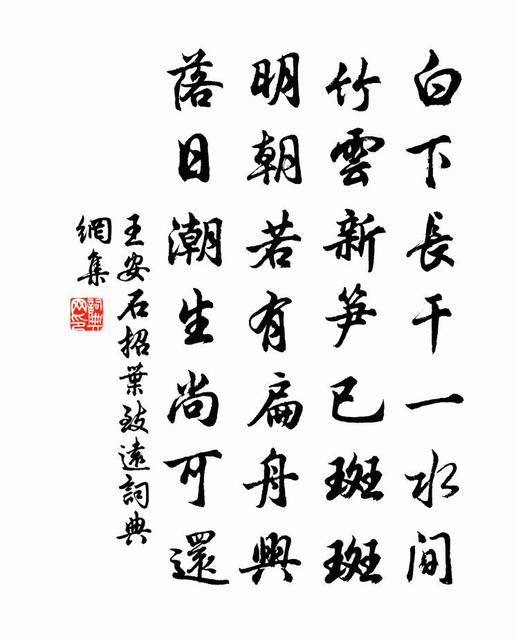 詩詞名句歷史字典書法欣賞書法字典國語詞典說文解字康熙字典古漢語字典標 題 作 者 詩 句 招葉致遠作者:王安石 朝代:宋代招葉致遠原文白下長乾一水間,竹雲新筍已斑斑。明朝若有扁舟興,落日潮生尚可還。詩詞問答問:招葉致遠的作者是誰?答:王安石問:招葉致遠寫於哪個朝代?答:宋代問:王安石的名句有哪些?答:王安石名句大全王安石招葉致遠書法欣賞招葉致遠書法作品詩詞推薦再題鍾賢良詠歸堂劉克莊〔宋代〕伏戲以來凡幾年,六經之外凡幾書。人間簡冊渺煙海,君以約法包無餘。往年華轂臨敝廬,舌端霆卷俄電舒。平欺次袁尚書巫山十二峰二十五韻黃人傑〔宋代〕文昌老仙絕俗姿,愛山成癖非兒痴。胸中況自有丘壑,檻結瑰異常恐遲。坤維謀畧出分閫,江山致助爭出奇。尋幽豪家夏冰詠雍裕之〔唐代〕金錯銀盤貯賜冰,清光如聳玉山稜。無論塵客閒停扇,直到消時不見蠅。首尾吟邵雍〔宋代〕堯夫非是愛吟詩,詩是堯夫語道時。天聽雖高只些子,人情相去沒多兒。無聲無臭盡休也,不忮不求還得之。雖有晚樓寓懷劉兼〔唐代〕薄暮疏林宿鳥還,倚樓垂袂復憑欄。月沈江底珠輪淨,雲鎖峰頭玉葉寒。劉毅暫貧雖壯志,馮唐將老自低顏。無言和晉齋兄韻三首袁甫〔宋代〕家塾提綱屬晉齋,絜齋氣脈遠乎哉。何時升講開聾聵,衿佩蹌蹌濟濟來。存廚徐君徵生輓歌何夢桂〔宋代〕一廚聊寄等歸藏,荷鍤攜壺畢此鄉。逆旅不歸前路惡,蓋棺未了後期長。壙中酣飲自忘癖,道上哀歌人笑狂。千古安樂窩中詩一編邵雍〔宋代〕安樂窩中詩一編,自歌自詠自怡然。陶鎔水石閒勳業,銓擇風花靜事權。意去乍乘千里馬,興來初上九重天。忺時蘇幕遮 寄與譚哥唐哥王哲〔元代〕訓人人,休碌碌。□□搜尋,密妙長修福。慧慧明燈參性燭。謹謹營軀,食食牟平祿。拜風風,為叔叔。兩兩侄賢寄呂惠卿吉甫兼簡林伯通王令〔宋代〕踆踆門外馬,客至知謂誰。昔面尚未逢。那論心相知。揖客拜上堂,謝客辱弗遺。寒暑相問酬,唯諾坐無為。靜默送人歸華下齊己〔唐代〕蓮花峰翠濕凝秋,舊業園林在下頭。好束詩書且歸去,而今不愛事風流。湘南春日懷古羅隱〔唐代〕晴江春暖蘭蕙薰,鳧鷖苒苒鷗著群。洛陽賈誼自無命,少陵杜甫兼有文。空闊遠帆遮落日,蒼茫野樹礙歸雲。松醪趣成父釀酒用子進家法故及其昆仲趙蕃〔宋代〕入眼江梅皆好枝,是中勞我幾懷思。詩聲何止一頭出,酒事乃稱百室師。建隆以來祀享太廟十六首佚名〔宋代〕猗歟太祖,受命於天。化行區宇,功溢簡編。武威震耀,文德昭宣。開基垂統,億萬斯年。武牢關羅隱〔唐代〕楚人曾此限封疆,不見清陰六里長。一壑暮聲何怨望,數峰秋勢自顛狂。由來四皓須神伏,大抵秦皇謾氣強。欲學春夢岑參〔唐代〕洞房昨夜春風起,故人尚隔湘江水。枕上片時春夢中,行盡江南數千里。菩薩蠻李真人〔元代〕還丹父母將何作。木從火里生枝博。枝博既芳榮。離宮火漸明。漸明終卻滅。化土生金屑。土謝玉金鄉。金來歸北澠池道中寄福昌令張景良通直晁補之〔宋代〕十年一夢間湖湘,欲往從之道阻長。可但知君愛彭澤,不應言我薄淮陽。馬穿崤底流泉白,鳥下關頭落照黃。愁作頌古二十四首釋宗演〔宋代〕善財童子採來親,大智文殊用得靈。今日青山端午節,不勞拈出再施呈。偈頌六十八首釋法薰〔宋代〕大雪滿長安,春來特地寒。新年頭佛法,一點不相瞞。名句推薦山從人面起,雲傍馬頭生。李白《送友人入蜀》 盡無言、閒品秦箏,淚滿參差雁呂渭老《薄倖·青樓春晚》 遠岫出山催薄暮,細風吹雨弄輕陰。李清照《浣溪沙·小院閒窗春色深》 功名萬里外,心事一杯中。高適《送李侍御赴安西》 盤飧市遠無兼味,樽酒家貧只舊醅。杜甫《客至》 萬里橋邊多酒家,遊人愛向誰家宿。張籍《成都曲》 綠樹陰濃夏日長,樓台倒影入池塘。高駢《山亭夏日》 桃花春水淥,水上鴛鴦浴。韋莊《菩薩蠻》 紗廚藤簟,玉人羅扇輕縑。白樸《天淨沙·夏》 夜吟敲落霜紅,船傍楓橋系。吳文英《荔枝香近·送人游南徐》