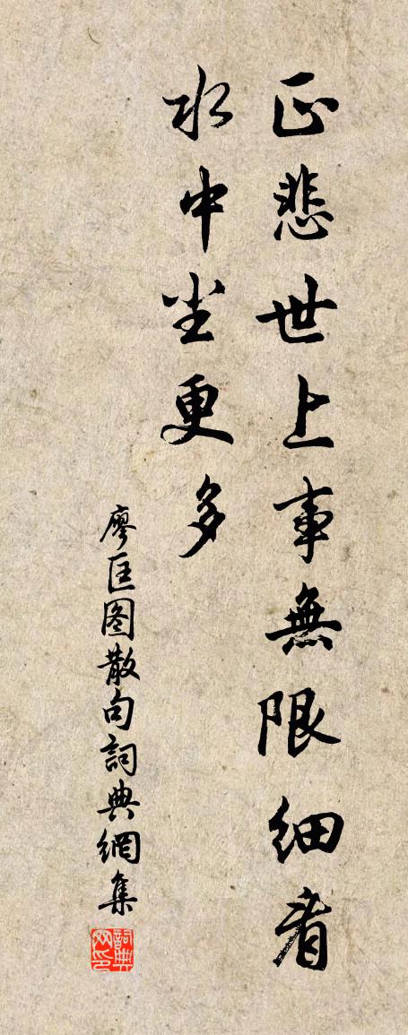 詩詞名句歷史字典書法欣賞書法字典國語詞典說文解字康熙字典古漢語字典標 題 作 者 詩 句 句作者:廖匡圖 朝代:唐代句原文正悲世上事無限,細看水中塵更多。詩詞問答問:句的作者是誰?答:廖匡圖問:句寫於哪個朝代?答:唐代問:句是什麼體裁?答:句廖匡圖句書法欣賞句書法作品注釋全唐詩:卷740-14詩詞推薦訪湖友徐璣〔宋代〕城中日日望南湖,乞得閒來訪隱居。漸有秋霖籬菊長,才無暑氣渚蓮疏。壁間古畫多賢像,案上塵編半佛書。未見送汪以南教授方回〔宋代〕郡文學掾未宜卑,四七元勛所願為。歸興忽如憶鱸膾,閒心肯復戀皋比。鄭虔粱肉非無分,薛令桑榆竟自奇。想見送蕭晉卿西行李伯玉〔宋代〕上馬能擊賊,下馬能草檄。蕭郎負此文武之全才,當臥元龍樓百尺。屏山閱盡眼中人,磊落深沉只識君。冷官不受和人葦花司馬光〔宋代〕葭菼迷河曲,高秋一番榮。齊紈張野白,楚練照川明。不夜月常皎,逾時雪未晴。萬仙霓帔合,千畝玉苗生。漠漠擬古吳思齊〔宋代〕平原布一遺老,布九重未知布名。臨危觀勁節,相視膽為驚。折陊猶舉手,籲天閩無成。九隕期報國,萬古猶光晶偈三首釋慧方〔宋代〕沔水江頭叫一聲,此時方得契平生。多年不識重相見,千聖同歸一路行。溪村鄒登龍〔宋代〕兀兀小橋西,人家住繞溪。雲山當戶入,竹樹出檐齊。風急花初盡,春深鶯亂啼。稻畦新雨足,穉子亦鉏犁。悼亡·君自垂千古商景蘭〔清代〕君自垂千古,吾猶戀一生。君臣原大節,兒女亦人情。折檻生前事,遺碑死後名。存亡雖異路,貞白本相成。句彭止〔宋代〕天西玉一鉤。觀芙蓉有感岳珂〔宋代〕芙蓉城邊觀芙蓉,開時淡白薦深紅。新晴著人過於酒,聊與老面回春風。少年白面豈長好,花落花開不知老。老來觀釣熊禾〔宋代〕暫停窗間詩,觀此池上釣。魚尾何沉沉,竹午何嫋嫋。一絲波面動,搖曳出深沼。校人畜我時,活我良謂厚。作鱠昭德皇后輓歌詞武元衡〔唐代〕玉扆將遷坐,金雞忽報晨。珮環仙馭遠,星月夜台新。劍沒川空冷,菱寒鏡不春。國門車馬會,多是濯龍親。句釋守恭〔宋代〕布發人來絕,術花鹿去多。二月望日三七侄移庖於休休堂約四老人為送春吳芾〔宋代〕光陰過眼似奔輪,誰保生前夢幻身。四 * 成三百歲,一時已勝萬千人。得閒對酒須拼醉,乘健看花莫厭頻。勿謂邊城客思釋斯植〔宋代〕客里厭芳塵,淒涼又問津。向南人去遠,歸北馬嘶頻。野水荒城暮,孤舟海樹春。故鄉非久別,已覺鬢毛新。簡同志溫庭筠〔唐代〕開濟由來變盛衰,五車才得號鎡基。留侯功業何容易,一卷兵書作帝師。潯陽古寺古汴高士〔宋代〕潯陽古寺久荒涼,倒柱頹梁臥夕陽。一盞佛燈猶未滅,霽天雲淡月華光。春晚即事范成大〔宋代〕屋頭清樾暗荊扉,紫葚斕斑翠莢肥。春晚軒窗人獨困,日長籬落燕雙飛。即事趙若槸〔宋代〕雲散春山出,人閒白晝長。禽聲答空谷,樹影畫斜陽。種果期秋實,澆花趁晚涼。行藏天已定,隨分且徜徉。袁府君輓詞樓鑰〔宋代〕家學傳三世,幾間無二書。力行真勇猛,進取故舒徐。前輩多遺墨,先人只故廬。後來窺瓮牖,志士為欷歔。名句推薦以其行理也。行理性於染當。墨子《墨子·03章 所染》 看朱成碧思紛紛,憔悴支離為憶君。武則天《如意娘》 胡人吹笛戍樓間,樓上蕭條海月閒。高適《和王七玉門關聽吹笛 / 塞上聞笛》 記玉關踏雪事清游,寒氣脆貂裘。張炎《八聲甘州·記玉關踏雪事清游》 出其東門,有女如雲。佚名《出其東門》 綴文者情動而辭發,觀文者披文以入情劉勰《文心雕龍·知音》 水來土掩,兵到將迎。施耐庵《水滸傳·第二十回》 聞道梅花坼曉風,雪堆遍滿四山中。陸游《梅花絕句》 正是霜風飄斷處,寒鷗驚起一雙雙。陸龜蒙《冬柳》 千秋釣舸歌明月,萬里沙鷗弄夕陽。杜牧《西江懷古》