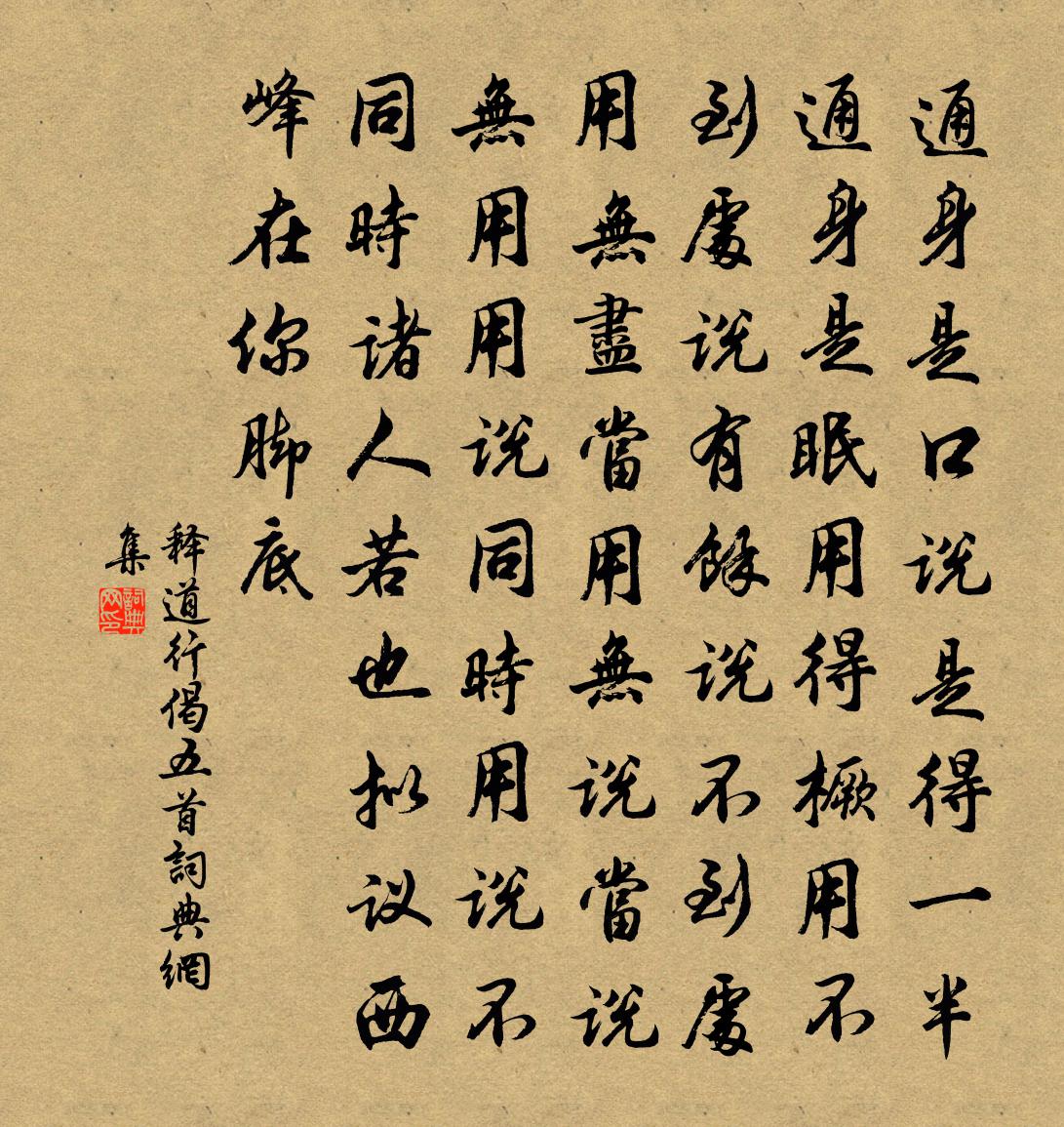 詩詞名句歷史字典書法欣賞書法字典國語詞典說文解字康熙字典古漢語字典標 題 作 者 詩 句 偈五首作者:釋道行 朝代:宋代偈五首原文通身是口,說是得一半。通身是眠,用得橛。用不到處說有餘,說不到處用無盡。當用無說,當說無用。用說同時,用說不同時。諸人若也擬議,西峰在你腳底。詩詞問答問:偈五首的作者是誰?答:釋道行問:偈五首寫於哪個朝代?答:宋代釋道行偈五首書法欣賞偈五首書法作品詩詞推薦贈曾醫魏了翁〔宋代〕太極分陰陽,物物具兩儀。乾坤互南北,坎離迭東西。四時有見伏,晝夜有盪推。夫人遷於物,由之而不知。主淫將游太平宮小詩呈趙季茂岳珂〔宋代〕聖治峰前松檜寒,舊遊從此解歸鞍。著身泉石無心客,主掌雲山正額官。老去隱居居紫府,新來雜壓壓黃冠。門東依韻和景彝觀刑部廳燕侍郎畫山水二首王珪〔唐代〕秋曹壁上奇山水,官冷尤將野趣宜。翠竹忽逢行盡處,白雲相伴看多時。於今絕筆誰還識,當日清吟亦欠詩。猶喜送韋岫郎中典泗州(一作癸丑歲毗陵會中貽同老)章碣〔唐代〕玉皇恩詔別星班,去壓徐方分野間。有鳥盡巢垂汴柳,無樓不到隔淮山。旌旗漸向行時擁,案牘應從到日閒。想憶餘思未盡,加為六韻,重寄微之白居易〔唐代〕海內聲華並在身,篋中文字絕無倫。[美微之也。]遙知獨對封章草,忽憶同為獻納臣。走筆往來盈捲軸,除官遞胭脂井楊維楨〔元代〕井無水,荒龍倚。不知如,巴馬子。仰天夜見黃姑星,水底嘍嘍話紅鬼,長繩捲起天河水。井中人,不殉死,宮人劍器近·夜來雨袁去華〔宋代〕夜來雨。賴倩得、東風吹住。海棠正妖饒處。且留取。悄庭戶。試細聽、鶯啼燕語。分明共人愁緒。怕春去。佳樹和天予孺子亭三首吳芾〔宋代〕南州高士務躬行,不事王侯只力耕。西嶺已如剛節峻,東湖還似古心清。正慚老拙非良牧,安有仁恩及庶氓。若也紹興以後蜡祭四十二首佚名〔宋代〕豐年孔多,百禮以洽。匪極神嘆,何以昭答。載酌之酒,用申其動。神具醉止,興物交欣。五丈觀音董嗣杲〔宋代〕海國風濤擁萬尋,此身何翅直千金。涉波直現昂藏相,結屋還堅報施心。圓得諸方傳轉智,倖存一半有觀音。陰廊贈唐棲寺僧周弼〔宋代〕山門寂寞唐棲寺,別去閒居又一年。草暗暮田君雁遠,花明春院一僧禪。雲房夕磬浮清雨,水殿寒燈宿細煙。作得長安有狹斜行二首曹勛〔宋代〕長安有狹斜,狹斜難方軌。道逢兩青衣,問君住何里。我家銅駝陌,高閣通朱邸。長子爵通侯,次子聯端揆。小子春日三會閒行蘇欽〔宋代〕風搖隴麥東西浪,春入郊原遠近花。閒趁溪流到村曲,斷垣喬木兩三家。陸編修送月石硯屏張鎡〔宋代〕何年商顥澄中秋,中光列籍稀校讎。冰輪充滿不復玷,玉斧棄置無煩修。蝦蟇遁走兔老黠,歷歷可認渾銀樓。揚光長安歲暮許渾〔唐代〕獨望天門倚劍歌,乾時無計老關河。東歸萬里慚張翰,西上四年羞卞和。花暗楚城春醉少,月涼秦塞夜愁多。三山【雙調】祆神急佚名〔元代〕珠簾閒玉鉤,寶篆冷金獸。銀箏錦瑟,生疏了弦上手。恩情如紙葉薄,人比花枝瘦。雕鞍去,眉黛愁。數歸期三月三教圖贊釋梵琮〔宋代〕六耳不同謀,相看已漏泄。都來只三人,證龜卻成鱉。者也之乎,無為寂滅。養家一般,道路千別。別不別,掉棒季夏即事晁補之〔宋代〕紅葵有雨長穗,青棗無風壓枝。濕礎人沾汗際,蒸林蟬烈號時。壬戌首春十九日鎖宿玉堂四絕劉克莊〔宋代〕無情蓮炬剪將殘,有樣葫蘆畫不難。盡笑翰林麻草拙,誰知老子布衾寒。過龍門(春愁)史達祖〔宋代〕醉月小紅樓。錦瑟箜篌。夜來風雨曉來收。幾點落花饒柳絮,同為春愁。寄信問晴鷗。誰在芳洲。綠波寧處有蘭舟名句推薦勸君更盡一杯酒,西出陽關無故人。王維《渭城曲 / 送元二使安西》 三杯兩盞淡酒,怎敵他、晚來風急?李清照《聲聲慢·尋尋覓覓》 舉頭紅日白雲低,四海五湖皆一望。唐寅《伯虎扮乞兒,作詩騙酒》 馬駭輿,則君子不安輿;庶人駭政,則君子不安位。荀子《荀子·王制》 雨暗殘燈棋散後,酒醒孤枕雁來初。杜牧《齊安郡晚秋》 卷盡愁雲,素娥臨夜新梳洗。吳文英《點絳唇·試燈夜初晴》 教化之行,興於學校。脫脫《金史·列傳·卷三十七》 樹柤梨橘柚者,食之則甘,嗅之則香;樹枳棘者,成而刺人。故君子慎所樹。韓非及後人《韓非子·外儲說左下》 春田龜坼苗不滋,猶賴立春三日雪。王士禎《春不雨》 留連光景惜朱顏,黃昏獨倚闌。李煜《阮郎歸·呈鄭王十二弟》
