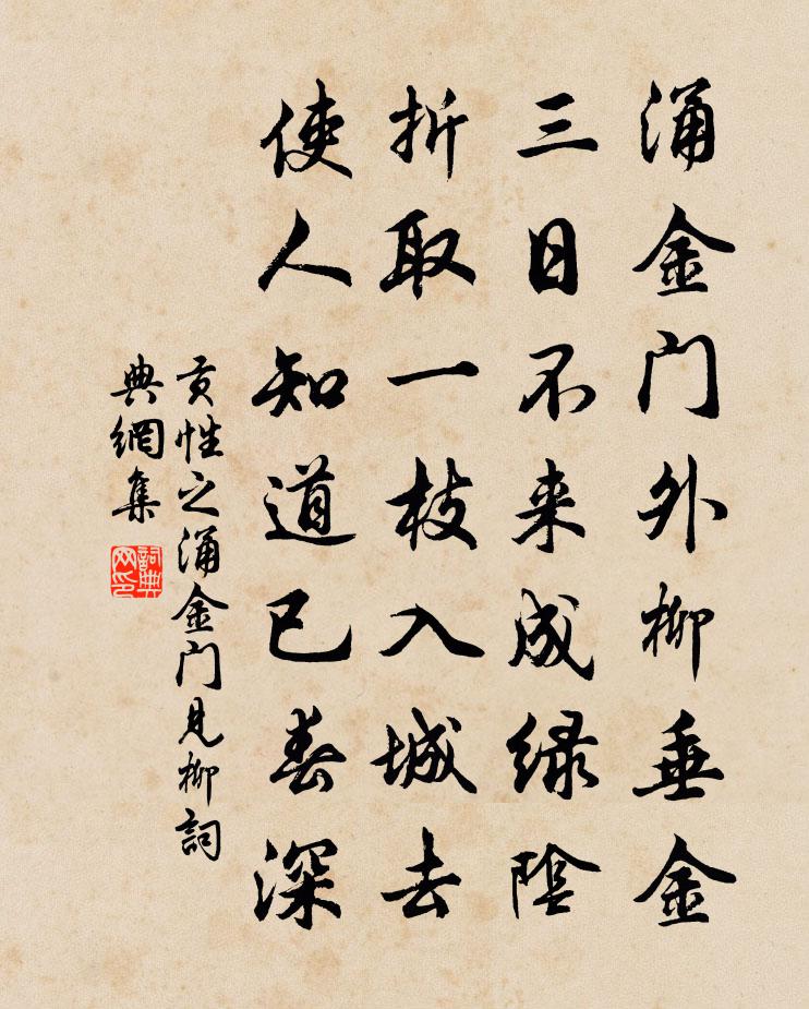 詩詞名句歷史字典書法欣賞書法字典國語詞典說文解字康熙字典古漢語字典標 題 作 者 詩 句 涌金門見柳作者:貢性之 朝代:元代涌金門見柳原文涌金門外柳垂金,三日不來成綠陰。折取一枝入城去,使人知道已春深。詩詞問答問:涌金門見柳的作者是誰?答:貢性之問:涌金門見柳寫於哪個朝代?答:元代問:涌金門見柳是什麼體裁?答:七絕貢性之涌金門見柳書法欣賞涌金門見柳書法作品注釋元詩別裁集詩詞推薦劉壯輿是是堂歌:張耒〔宋代〕讀堂中之書兮,以致子之眠。飲堂中之酒兮,以休子之言。是非雜然於子之耳兮,付庭中之嘆蚓,與夫木上之鳴蟬疾病晁說之〔宋代〕疾病非吾有,吾身與世輕。看棋得靜意,說藥肯傷生。不道江湖遠,惟多鷗鷺情。況聞登俊傑,即日是昇平。宿宜興禪房李曾伯〔宋代〕冬當月初後,天欲試霜時。永夜絕人語,新寒聽雁知。壯心憂國在,老計入山宜。莫作邯鄲夢,蕭蕭鬢已絲。舟行夜泊夔州唐求〔唐代〕維舟鏡面中,迥對白鹽峰。夜靜沙堤月,天寒水寺鐘。故園何日到,舊友幾時逢。欲作還家夢,青山一萬重。大帽山釋圓悟〔宋代〕眾山皆弭伏,獨讓此峰尊。絕頂時猶雨,中林晝亦昏。逆風松勢偃,獨石水聲喧。定有幽棲者,何因得晤言。趙季茂通判惠詩走筆奉和十篇岳珂〔宋代〕天巧與天宜,雕鎪焉用詩。冥鴻吾自愛,隱豹彼何知。牧笛方堪聽,胡笳不奈吹。傷時燭之武,老矣不能為。題峽中石上白居易〔唐代〕巫女廟花紅似粉,昭君村柳翠於眉。誠知老去風情少,見此爭無一句詩?送賈彥臨訓導霍丘方行〔元代〕中都會面得從容,兩載同聽長樂鍾。天近君門嚴虎豹,地寬人海混魚龍。承恩自合歸宣室,論道安能老辟雍?江柳對晚開夜合花贈皇甫郎中白居易〔唐代〕移晚校一月,花遲過半年。紅開杪秋日,翠合欲昏天。白露滴未死,涼風吹更鮮。後時誰肯顧,唯我與君憐。寓言三首·其二李白〔唐代〕搖裔雙彩鳳,婉孌三青禽。往還瑤台里,鳴舞玉山岑。以歡秦娥意,復得王母心。區區精衛鳥,銜木空哀吟。落花圖詠唐寅〔明代〕久陽芳草笛悠悠,春盡驚看又轉頭。淅瀝風光搖草樹,驂驔時節逐川流。臨階思數脂千片,繞樹空煩繡半鉤。九十園中口占喻良能〔宋代〕舂鋤野鳧疑水鄉,湖陰山色仍蒼蒼。西風三徑有佳致,朔雪橫枝多暗香。長統遊戲自足樂,少游贏餘非所望。開林逍遙詠宋太宗〔宋代〕貪染猶來理不通,虛勞歲月面西東。從前自是凡心別,利益須歸上帝功。洞府名高同景致,塵泥蹤跡莫知空。去非四時田園雜興范成大〔宋代〕采菱辛苦廢犁鋤,血指流丹鬼質枯。無力買田聊種水,近來湖面亦收租!薌岩山居孟夏二十絕舒岳祥〔宋代〕無色庭前石,無聲石上琴。此時寂寞意,千載有知音。遠思齊己〔唐代〕遠思極何處,南樓煙水長。秋風過鴻雁,遊子在瀟湘。海面雲生白,天涯墮晚光。徘徊古堤上,曾此贈垂楊。燈夕寄獻內翰虢略公楊億〔宋代〕瓊樓十二玉梯斜,乾鵲南飛轉斗車。有客郢中歌白雪,幾人天上醉流霞。金吾緹騎章台陌, * 繁弦太帝家。秦痔春夜雪再用韻十首楊公遠〔宋代〕詩夢關情草滿池,東皇已向歲前歸。怪渠楊柳搖金未,底事漫空絮便飛。和張功父見寄陸游〔宋代〕佐命貂蟬再世孫,手鉏瓜壟傍青門。超騰已得丹換骨,戀著肯求香返魂?正復悲秋如騎省,可令病渴似文園?庭前送德麟監院歸天童和楊廷秀韻二首陸九淵〔宋代〕盡道吾廬登陟難,上人得得到相看。莫言無物堪延待,也有茶澆舌本乾。名句推薦津橋春水浸紅霞,煙柳風絲拂岸斜。雍陶《天津橋望春》 幸災不仁,乘危不武張廷玉《明史·列傳·卷一百三十六》 吳姬越艷楚王妃,爭弄蓮舟水濕衣。王昌齡《採蓮曲二首》 橫笛和愁聽,斜枝倚病看。崔道融《梅花》 文豈有常體,但以有體爲常李大師、李延壽《南史·列傳·卷三十二》 釣罷歸來不繫船,江村月落正堪眠。司空曙《江村即事》 酒美梅酸,恰稱人懷抱。李清照《蝶戀花·上巳召親族》 盧家少婦鬱金堂,海燕雙棲玳瑁梁。沈佺期《古意呈補闕喬知之 / 古意 / 獨不見》 少室眾峰幾峰別,一峰晴見一峰雪。李頎《少室雪晴送王寧》 聞道長安燈夜好,雕輪寶馬如雲。毛滂《臨江仙·都城元夕》