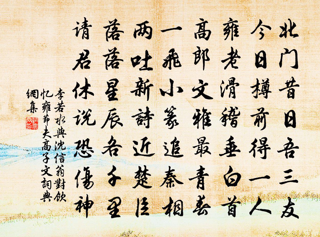 詩詞名句歷史字典書法欣賞書法字典國語詞典說文解字康熙字典古漢語字典標 題 作 者 詩 句 與沈信翁對飲憶雍節夫高子文作者:李若水 朝代:宋代原文北門昔日吾三友,今日樽前得一人。雍老滑稽垂白首,高郎文雅最青春。一飛小篆追秦相,兩吐新詩近楚臣。落落星辰各千里,請君休說恐傷神。詩詞問答問:《與沈信翁對飲憶雍節夫高子文》的作者是誰?答:李若水問:該詩寫於哪個朝代?答:宋代書法欣賞與沈信翁對飲憶雍節夫高子文書法作品詩詞推薦奉和魯望閒居雜題五首。醒聞檜皮日休〔唐代〕解洗餘酲晨半酉,星星仙吹起雲門。耳根無厭聽佳木,會盡山中寂靜源。秋雨聯句韓愈〔唐代〕萬木聲號呼,百川氣交會。 ——孟郊庭翻樹離合,牖變景明藹。 ——韓愈潈瀉殊未終,飛浮亦云泰。 ——孟玉樓春(賦雙頭牡丹)汪元量〔宋代〕帝鄉春色濃於霧。誰遣雙環堆繡戶。金張公子總封侯,姚魏弟兄皆列士。碧紗窗下修花譜。交頸鴛鴦嬌欲語。絳綃解首座職事書記相招以偈力辭釋正覺〔宋代〕原鴒能作歸呼音,暮風墮葉秋在林。路沙漠漠水潏潏,夜色冉冉山陰陰。坐冠多士自省短,挽袂乃友相知深。乞與贈汪叔潛陸游〔宋代〕火雲嵯峨如疊嶂,百病攻衰非一狀。低檐小屋桑竹村,忽辱君來問亡恙。蹶然攬衣起闖門,裹飯仍煩遠相餉。歲飢贈算數汪生方岳〔宋代〕貂蟬勳業麒麟畫,自有夔龍向上人。數本不為吾輩設,風煙之句水雲身。罷徐州,往南京,馬上走筆寄子由五首蘇軾〔宋代〕父老何自來,花枝裊長紅。洗盞拜馬前,請壽使君公。前年無使君,魚鱉化兒童。舉鞭謝父老,正坐使君窮。窮人書懷貽京邑同好孟浩然〔唐代〕維先自鄒魯,家世重儒風。詩禮襲遺訓,趨庭沾末躬。晝夜常自強,詞翰頗亦工。三十既成立,嗟吁命不通。慈親九曲櫂歌十首白玉蟾〔宋代〕寂寂秋煙鎖碧灣,往年此地有禪關。不神移入龍宮去,一夜風雷吼萬山。【大石調】青杏子_天賦兩風流馬致遠〔元代〕天賦兩風流,須知是福惠雙修。驂鸞仙子騎鯨友,瓊姬子高,巫娥宋玉,織女牽牛。【憨郭郎】當壚心既有,題柱寄董武賈島〔唐代〕雖同一城裡,少省得從容。門掩園林僻,日高巾幘慵。孤鴻來半夜,積雪在諸峰。正憶毗陵客,聲聲隔水鍾。惜梅陳棣〔宋代〕朔雪沒寒蕪,嚴威等群木。東君惜江梅,先與借微燠。造物逞新奇,亭亭付幽獨。天然水雪姿,不許鉛華凟。疏影襄陽寒食寄宇文籍竇鞏〔唐代〕煙水初銷見萬家,東風吹柳萬條斜。大堤欲上誰相伴,馬踏春泥半是花。大道歌白玉蟾〔宋代〕烏飛金,兔走玉,三界一粒粟。山河大地幾年塵,陰陽顛倒入玄谷。人生石火電光中,數枚客鵲枝頭宿。桑田滄海雲洞韓元吉〔宋代〕揮策度絕壑,撐空見樓台。丹崖幾千仞,中有佛寺開。老僧如遠公,譍門走蒿萊。下馬問所適,褰衣指崔嵬。飛闌賀新郎葛長庚〔宋代〕夢繞荷花國。遍□□、橘州柳市,芙蓉巷陌。桂社蘭鄉白苹里,月冷波寒之夕。有孤鶩、落霞知得。一鶴橫空雲漠游李少師園十題笛竹范祖禹〔宋代〕鳳食實已美,龍吟聲更奇。惜無蔡邕識,那得馬融吹。賢者之孝二百四十首宗元卿林同〔宋代〕異哉宗子孝,親疾遠關心。每驗痛大小,因知疾淺深。為慧林沖禪師燒香頌三首黃庭堅〔宋代〕昨夜三更狗吠雪,東家閉門推出月。是渠覺海性澄圓,衲子 * 須見血。黃用之遷居奉寄姜特立〔宋代〕聞道秋來過別居,秋風應已入琴書。草玄正要一區宅。入蜀何須駟馬車。名句推薦東山老,可堪歲晚,獨聽桓箏。葉夢得《八聲甘州·壽陽樓八公山作》 有大略者,不可責以捷巧;有小智者,不可任以大功。劉安及其門客《淮南子·主術訓》 傷心重見,依約眉山,黛痕低壓姜夔《慶宮春·雙槳蓴波》 怕歌愁舞懶逢迎。妝晚托春酲。陸游《朝中措·代譚德稱作》 鞭影落春堤,綠錦鄣泥卷。納蘭性德《生查子·鞭影落春堤》 恩威同施,才德相較,苟無功,得無天耶?來俊臣《羅織經·治下卷第三》 古人忠孝,不離心頭,今人忠孝,不離口頭,此是何等志量。王永彬《圍爐夜話·第二三則》 料有牽情處,忍思量、耳邊曾道。時彥《青門飲·寄寵人》 客里看春多草草,總被詩愁分了張炎《清平樂·采芳人杳》 明月皎皎照我床,星漢西流夜未央。曹丕《燕歌行二首·其一》