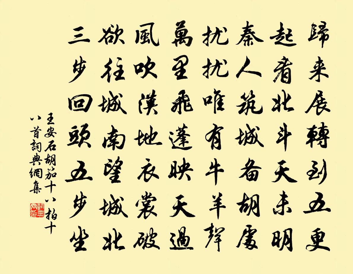 詩詞名句歷史字典書法欣賞書法字典國語詞典說文解字康熙字典古漢語字典標 題 作 者 詩 句 胡笳十八拍十八首作者:王安石 朝代:宋代胡笳十八拍十八首原文歸來展轉到五更,起看北斗天未明。秦人築城備胡處,擾擾唯有牛羊聲。萬里飛蓬映天過,風吹漢地衣裳破。欲往城南望城北,三步回頭五步坐。詩詞問答問:胡笳十八拍十八首的作者是誰?答:王安石問:胡笳十八拍十八首寫於哪個朝代?答:宋代問:王安石的名句有哪些?答:王安石名句大全王安石胡笳十八拍十八首書法欣賞胡笳十八拍十八首書法作品詩詞推薦秋夜感遇十首以孤村一犬吠殘月幾人行為韻陸游〔宋代〕長康有三絕,吾獨得其一,寓世八十年,一痴萬事畢。世問所謂黠,正類褌中虱,燂湯會有時,為計誰得失?道上見村民聚飲陸游〔宋代〕霜風利如割,霜葉淨如掃,正當十月時,我行山 * 。場功俱已畢,歡樂無壯老,野歌相和答,村鼓更擊考。市壚木犀晚來盛開寄吳守虞儔〔宋代〕繚枝偃蹇傍岩隈,密葉稄層不露才。一色渾疑新釀熟,址分端為好詩開。佳人宜與簪雲髻,上客須邀釂玉杯。只恐滿庭芳佚名〔宋代〕金貼鼓腰,繡妝檐額,吾宗自昔豪奢。椒馨蘭馥,煙霧靄橫斜。吹管聒天今夜,香風度、羅綺光華。看雙美,郎君送項倅周南〔宋代〕昨者搜賢詔下來,旌蒲紛遝起蒿萊。誰人肯厭承明直,我輩休汙世俗埃。天近須回宣室召,時難倍愴渭城杯。殷勤賢者之孝二百四十首楊震林同〔宋代〕尚自畏四知,於親豈忍欺。種藍有助者,拔去不妨奇。漫作二首韓偓〔唐代〕暑雨灑和氣,香風吹日華。瞬龍驚汗漫,翥鳳綷雲霞。懸圃珠為樹,天池玉作砂。丹霄能幾級,何必待乘槎。黍谷宿正覺寺曾季貍〔宋代〕古寺荒涼甚,秋風更颯然。殿焚猶有礙,僧老不知年。但可扶藜至,無因假榻眠。鍾魚久寂寞,誰施囊錢。一春四十日天氣未佳花事行復已矣太息成吟舒岳祥〔宋代〕積翠林塘十畝陰,雨中不覺變流音。江山萬里登樓眼,宇宙千年隱几心。有客不來還日暮,掩書無語自春深。倚闌過許州沈德潛〔清代〕到處陂塘決決流,垂楊百里罨平疇。行人便覺鬚眉綠,一路蟬聲過許州。景仁書雲去冬因酒病耳病牙遂不入洛以詩寄呈司馬光〔宋代〕許昌攜手盡時英,況復新開甲第成。醉里都將春作達,老來不向酒藏情。齒疏無廢銜杯趣,耳病猶分度曲聲。舊友赦到不得歸題江上石沈佺期〔唐代〕家住東京里,身投南海西。風煙萬里隔,朝夕幾行啼。聖主謳歌洽,賢臣法令齊。忽聞銅柱使,走 * 金雞。棄市十月二十九日雪四首蘇轍〔宋代〕幽居漫爾存三徑,燕坐何妨應六窗。老憶舊書時展卷,病封藥酒旋開缸。小園搖落黃花盡,古檜飛鳴白鶴雙。珍重題縉雲山鼎池二首徐凝〔唐代〕黃帝旌旗去不回,空餘片石碧崔嵬。有時風卷鼎湖浪,散作晴天雨點來。天地茫茫成古今,仙都凡有幾人尋。到來挽趙秋曉張孺子〔宋代〕早袖經綸手,歸歟臥首陽。可憐心錦繡,不補帝衣裳。祿與名俱靳,身宜壽且康。互鄉蒙子潔,聞訃重心傷。酬邢端公濟春日蘇台有呈袁州李使君…辛陽王三侍御皎然〔唐代〕大賢當佐世,堯時難退身。如何丹霄侶,卻在滄江濱。柳色變又遍,鶯聲聞亦頻。賴逢宜春守,共賞南湖春。營道和張二十五春日見寄五首范祖禹〔宋代〕白日春台上,歡娛莫訴杯。飛花留客醉,啼鳥近人來。金剛隨機無盡頌離色離相分第二十釋印肅〔宋代〕榮辱空中響,迷真逐妄想。觀其所由來,盡屬虛撈攘。又次簽判丈惜花絕句三首趙蕃〔宋代〕春事違人去若狂,便驚鶗鴃怨年芳。兒童強作留連意,拾去殘花學試妝。和仁仲過濱江胡寅〔宋代〕溈山未暇往,石磴上雪端。初識清修路,遙憐菡萏寒。野寬耕僅有,民殄政猶殘。總使林泉穩,那能寢飯安。名句推薦爭教清淚不成冰?好處便輕別。納蘭性德《好事近·簾外五更風》 半盞屠蘇猶未舉,燈前小草寫桃符。陸游《除夜雪》 故人書報,莫因循、忘卻蓴鱸。辛棄疾《漢宮春·會稽秋風亭觀雨》 可憐日暮嫣香落,嫁與春風不用媒。李賀《南園十三首》 何日平胡虜,良人罷遠征。李白《子夜吳歌·秋歌》 去年戰桑乾源,今年戰蔥河道。李白《戰城南》 書當快意讀易盡,客有可人期不來。陳師道《絕句·書當快意讀易盡》 日暮秋煙起,蕭蕭楓樹林。戴叔倫《過三閭廟》 公生明,偏生暗荀子《荀子·不苟》 升堂坐階新雨足,芭蕉葉大梔子肥。韓愈《山石》