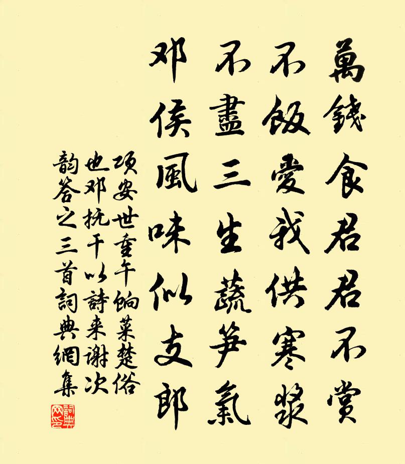 詩詞名句歷史字典書法欣賞書法字典國語詞典說文解字康熙字典古漢語字典標 題 作 者 詩 句 重午餉菜楚俗也鄧撫乾以詩來謝次韻答之三首作者:項安世 朝代:宋代原文萬錢食君君不賞,不飯愛我供寒漿。不盡三生蔬筍氣,鄧侯風味似支郎。詩詞問答問:《重午餉菜楚俗也鄧撫乾以詩來謝次韻答之三首》的作者是誰?答:項安世問:該詩寫於哪個朝代?答:宋代書法欣賞重午餉菜楚俗也鄧撫乾以詩來謝次韻答之三首書法作品詩詞推薦梅開次韻答葉教授二首項安世〔宋代〕春風一點暗驚梅,便有千花動地開。卻似德人方寸事,等間流向筆端來。寓泊浙江寄漢陽孫邁郎中潘閬〔宋代〕維揚相別後,十載浙江居。氣概貧猶在,顛狂老漸疏。已憑天柱客,曾寄漢陽書。近見人來說,才華患有餘。次韻答晁以道見贈二首蘇籀〔宋代〕玉井之泉汲又新,腐陳收拾已空囷。鐵牛城下三年眼,剨見仇池社裡人。朝中措王之道〔宋代〕老窮無賴事成叢。短髮自髼鬆。坐想帝城當日,萬花繡出天宮。幾時臨賦,深浮綠蟻,緩唱黃鍾。莫獲追陪勝賞,看梅趙庚夫〔宋代〕竟日梅花側,枝枝入肺肝。濕疑霜旋剪,清比玉堪餐。臨水嚴光釣,吟風東野寒。年來難取友,珍重莫吹殘。念奴嬌沈瀛〔宋代〕光陰轉轂,況生死事大,無常迅速。學道參禪、要識取,自家本來面目。鬧里提撕,靜中打坐,閒看傳燈錄。話頭游龍興寺韓維〔宋代〕空庭落葉赤,聯步得幽尋。蘇剝殘碑字,塵昏古象金。菊煙淒晚秀,松日淡秋陰。南陽風埃滿,禪關只自深。洞庭湖君山頌呂岩〔唐代〕午夜君山玩月回,西鄰小圃碧蓮開。天香風露蒼華冷,雲在青霄鶴未來。贈從弟弘元謝靈運〔南北朝〕昔爾同事。謂予偕征。暌合無朕。聚散有情。我端北署。子騰南溟。申非授乖。飲淚淒聲。初寒示鄰曲陸游〔宋代〕村北村南數十家,陂池重複谷谽紡。荻叢缺處見漁火,蓬戶閉時聞紡車。淺瀨水清雙立鷺,橫林葉盡萬棲鴉。是中塗毒策禪師真贊陸游〔宋代〕骨相瓌奇,風神蕭散。貌肅而和,語盡而簡。畫得者英氣逼人,畫不得者頂門上一雙眼。寄松江陸龜蒙處士齊己〔唐代〕萬卷功何用,徒稱處士休。閒欹太湖石,醉聽洞庭秋。道在誰開口,詩成自點頭。中間欲相訪,尋便阻戈矛。送王子正宰長樂二首陳淳〔宋代〕君當民社戴星游,我玩簞瓢守故丘。袂自此分何所憾,學無與講是吾憂。聖心未可窺覘得,道體難從寡陋求。鱗翼企喻歌二首佚名〔南北朝〕其一男兒欲作健,結伴不須多。鷂子經天飛,群雀兩向波。其二男兒可憐蟲,出門懷死憂。屍喪狹谷中,白骨無人湘南樓劉克莊〔宋代〕偶陪群彥賦登樓,一笑聊寬故國愁。近郭山來晴檻里,待船人立晚沙頭。春天晴雨常多變,晦日文書得小休。尚有折檻行杜甫〔唐代〕嗚呼房魏不復見,秦王學士時難羨。青衿胄子困泥塗,白馬將軍若雷電。千載少似朱雲人,至今折檻空嶙峋。婁公學仙詞寄顧雲李昭象〔唐代〕記得初傳九轉方,碧雲峰下祝虛皇。丹砂未熟心徒切,白日難留鬢欲蒼。無路洞天尋穆滿,有時人世美劉郎。仙人從人求花黃庭堅〔宋代〕舍南舍北勃姑啼,體中不佳陰雨垂。欲向黃梅問訊息,背陰合有兩三枝。枕上陸游〔宋代〕檐角查查鵲語輕,窗欞澹澹日痕生。清愁不逐爐香散,旋啜寒齏解宿酲。奉和九月九日登慈恩寺浮圖應制鄭愔〔唐代〕涌霄開寶塔,倒影駐仙輿。雁子乘堂處,龍王起藏初。秋風聖主曲,佳氣史官書。願獻重陽壽,承歡萬歲餘。名句推薦風雨牢愁無著處,那更寒蛩四壁。文天祥《酹江月·和友驛中言別》 立盡黃昏淚幾行,一片鴉啼月。夏完淳《卜運算元·秋色到空閨》 羌笛何須怨楊柳,春風不度玉門關。王之渙《涼州詞二首·其一》 擬泛煙中片葉,但兩湖佳處,任風吹泊徐燦《念奴嬌·西湖雨感次素庵韻》 無情不似多情苦。一寸還成千萬縷。晏殊《玉樓春·春恨》 高岸為谷,深谷為陵。佚名《十月之交》 君子養心莫善於誠荀子《荀子·不苟》 門外平橋連柳堤,歸來晚樹黃鶯啼。溫庭筠《春洲曲》 晚春盤馬踏青苔,曾傍綠陰深駐。晏幾道《御街行·街南綠樹春饒絮》 四邊伐鼓雪海涌,三軍大呼陰山動。岑參《輪台歌奉送封大夫出師西征》