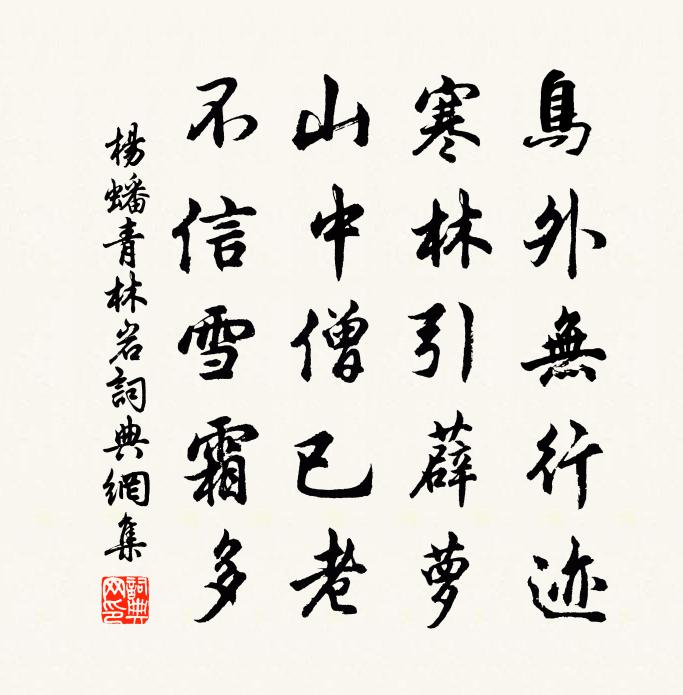 詩詞名句歷史字典書法欣賞書法字典國語詞典說文解字康熙字典古漢語字典標 題 作 者 詩 句 青林岩作者:楊蟠 朝代:宋代青林岩原文鳥外無行跡,寒林引薜蘿。山中僧已老,不信雪霜多。詩詞問答問:青林岩的作者是誰?答:楊蟠問:青林岩寫於哪個朝代?答:宋代楊蟠青林岩書法欣賞青林岩書法作品詩詞推薦浣溪沙(新安驛席上留別)范成大〔宋代〕送盡殘春更出遊。風前蹤跡似沙鷗。淺斟低唱小淹留。月見西樓清夜醉,雨添南浦綠波愁。有人無計戀行舟。丞相信庵趙公哀詩五首劉克莊〔宋代〕憶昔東淮羽檄馳,非公受鉞國幾危。春潮全藉孤舟渡,廈屋曾將一木支。著白接?麾猛將,坑紅衲襖等嬰兒。揚州唐昌觀玉蕊花楊巨源〔唐代〕晴空素 * 霞新,香灑天風不到塵。持贈昔聞將白雪,蕊珠宮上玉花春。古人晁說之〔宋代〕古人愁已極,今我不用愁。去日已忽忽,來日諒悠悠。便能如此志,終恐慚白頭。經月不讀書,閉目得自求。不如六月十四日大雨少頃月如晝李流謙〔宋代〕火雲忽改色,大雨捲地來。淝水萬貔貅,一戰山嶽摧。須臾天宇霽,刮掃無纖埃。佳月流清輝,瓊瑤碎六街。薄泥荔支嘆蘇軾〔宋代〕十里一置飛塵灰,五里一堠兵火催。顛坑仆谷相枕藉,知是荔支龍眼來。飛車跨山鶻橫海,風枝露葉如新采。宮中春晚方岳〔宋代〕一樽無計遣春留,落日傷情獨倚樓。柔綠怕堤如可染,老紅滿徑為誰愁。烈文佚名〔先秦〕烈文辟公,錫茲祉福。惠我無疆,子孫保之。無封靡於爾邦,維王其崇之。念茲戎功,繼序其皇之。無競維人,四宮中調笑·團扇王建〔唐代〕團扇,團扇,美人病來遮面。玉顏憔悴三年,誰復商量管弦。弦管,弦管,春草昭陽路斷。豆葉黃/憶王孫呂渭老〔宋代〕晚妝新試碧衫涼。金鴨猶殘昨夜香。柳際風來月滿廊。一雙雙。人對鴛鴦浴小塘。北溪蒼山謀避寇念青陽蒼山徘徊不忍作古調開利登〔宋代〕憶我昨選勝,瓶錫來蒼山。上岩豁萬里,下峽窮重玄。謂此已勝絕,可以無梅川。後同北溪游,青陽稅塵鞍。險流龍穴錢聞詩〔宋代〕丁君神靈斡天樞,一叱二龍遺戲珠。龍來求珠珠不與,吐下腥涎滿庭宇。僧繇畫柱真龍形,有龍來鬭風雷鳴。君篆舟過桐廬三首楊萬里〔宋代〕後面山無數,南頭柳更多。人家逼江岸,屋柱入滄波。老去頻經此,重來更幾何。牛山動悲感,曾侍板輿過。題無熱軒曾幾〔宋代〕一溪喬木陰,六月火雲冷。門外有行人,寒泉思汲井。阻雪方岳〔宋代〕客飯江豚美,仍須滯此留。竹深通酒舍,沙冷歇漁舟。專與詩為地,明將雪作愁。此行乘興耳,吾亦盡風猷。冬日遙和盧使君幼平、綦毋居士游法華寺高頂皎然〔唐代〕仁坊花標絕境,花廉守躡高花蹤。天曉花才分剎,風傳欲盡鍾。城中歸路遠,湖上碧山重。水照千花界,雲開七葉輕薄篇張華〔魏晉〕末世多輕薄,驕代好浮華。志意既放逸,貲財亦豐奢。被服極纖麗,餚膳盡柔嘉。僮僕余粱肉,婢妾蹈綾羅。文軒南柯子/南歌子陳三聘〔宋代〕月傍雲頭吐,風將雨腳吹。夜深烏鵲向南飛。應是星娥顰恨、入雙眉。舊怨垂千古,新歡只片時。一年屈指數佳期同存子侄造成蓮蕩舟中作陽枋〔宋代〕此行為愛盪中蓮,萬里清風駕客船。兩壁青山看不盡,舉頭天際有飛鳶。病起陸游〔宋代〕頹垣破屋暗藜蒿,病起不知秋已高。晨倚山楹群木脫,暮臨苔砌百蟲號。力殫編簡初何得,腰折塵埃只漫勞。賴有名句推薦獨倚危欄,神遊無際,天地猶嫌隘。朱栴《念奴嬌·雪霽夜月中登樓望賀蘭山作》 長江千里,煙淡水雲闊。李綱《六么令·次韻和賀方回金陵懷古鄱陽席上作》 我與我周旋久,寧作我。劉義慶《世說新語·品藻》 精衛銜微木,將以填滄海。陶淵明《讀山海經·其十》 不知江月待何人,但見長江送流水。張若虛《春江花月夜》 殘雪庭陰,輕寒簾影,霏霏玉管春葭。王沂孫《高陽台·和周草窗寄越中諸友韻》 鞠躬盡瘁,死而後已。諸葛亮《後出師表》 易挑錦婦機中字。難得玉人心下事。劉克莊《玉樓春·戲林推》 江上往來人,但愛鱸魚美范仲淹《江上漁者》 勿營華屋,勿謀良田。朱柏廬《朱子家訓·全文》