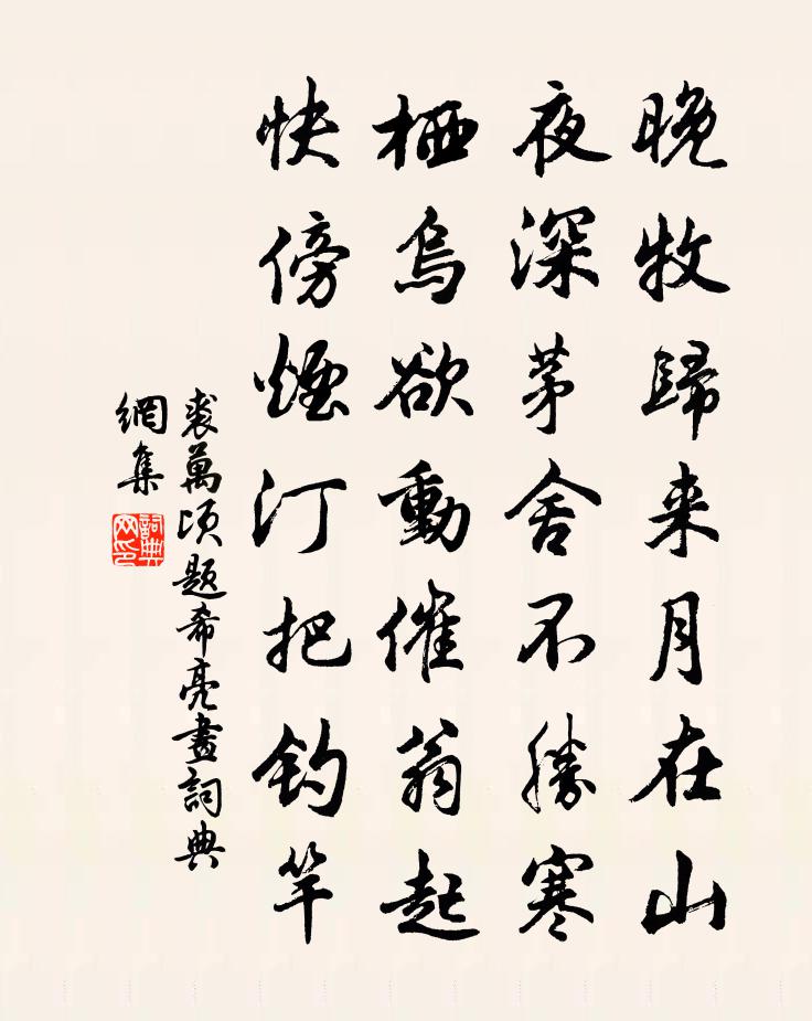 詩詞名句歷史字典書法欣賞書法字典國語詞典說文解字康熙字典古漢語字典標 題 作 者 詩 句 題希亮畫作者:裘萬頃 朝代:宋代題希亮畫原文晚牧歸來月在山,夜深茅舍不勝寒。棲烏欲動催翁起,快傍煙汀把釣竿。詩詞問答問:題希亮畫的作者是誰?答:裘萬頃問:題希亮畫寫於哪個朝代?答:宋代裘萬頃題希亮畫書法欣賞題希亮畫書法作品詩詞推薦高士詠韓康吳筠〔唐代〕伯休抱遐心,隱括自為美。賣藥不二價,有名反深恥。安能受玄纁,秉願終素履。逃遁從所尚,蕭蕭絕塵軌。金陵懷古六首周文璞〔宋代〕司馬家兒持酒杯,天星亦下澆崔嵬。當時若便效牛飲,定有孟津師旅來。感秋六首鄭獬〔宋代〕林杪一蟬噪,翛翛涼風來。清響斷復連,裂耳增餘哀。浩露洗明月,珠樹涼璀璀。蛻飛各有時,詎能人力裁。儒生置酒沛宮詩樓鑰〔宋代〕漢祖功成後,時因過沛宮。還鄉上心喜,置酒故人同。高會延遺老,酣歌和眾童。窮歡新笑樂,起舞舊英雄。慷慨揚州送別薛廷玉〔宋代〕匹馬揚州路,香開幾樹花。春光無揀擇,淮池亦繁華。日沸長江水,風昏古戰沙。爭雄舊時事,君去莫思家。卜運算元楊無咎〔宋代〕平分月殿香,碎點金盤露。占斷秋光獨自芳,端稱觴飛羽。謝了卻重開,若個花同侶。誰識靈心一點通,手拈空無妾薄命梅堯臣〔宋代〕妾命似春冰,不受杲日照。有分定隨流,綠波應解笑。不是郎情薄,自是郎年少。待郎歡厭足,妾發如蓬藋。頌古三十一首釋玿〔宋代〕北禪夜分歲,特地巧安排。維那出只手,線去又絲來。田郎催拍板,鮑老舞三台。若教行正令,活作一坑埋。醉別程秀才白居易〔唐代〕五度龍門點額回,卻緣多藝復多才。貧泥客路粘難出,愁鎖鄉心掣不開。何必更游京國去,不如且入醉鄉來。吳弦更漏子·秋張淑芳〔宋代〕墨痕香,紅蠟淚。點點愁人離思。桐葉落,蓼花殘。雁聲天外寒。五雲嶺,九溪塢。待到秋來更苦。風淅淅,水淙送圓(一作圖)上人歸廬山李中〔唐代〕蓮宮舊隱塵埃外,策杖臨風拂袖還。踏雪獨尋青嶂下,聽猿重入白雲間。蕭騷紅樹當門老,斑駁蒼苔鎖徑閒。預想中元前賀余處恭尚書禱雨沛然沾足楊萬里〔宋代〕數點飄蕭供晚清,二更傾瀉到天明。雷驅雲氣如旋磨,雨遍山村卻入城。簟面頓無秋後暑,檐牙最愛夢中聲。尚書池上早夏白居易〔唐代〕水積春塘晚,陰交夏木繁。舟船如野渡,籬落似江村。靜拂琴床蓆,香開酒庫門。慵閒無一事,時弄小嬌孫。嘆靈鷲寺山榴李群玉〔唐代〕水蝶岩蜂俱不知,露紅凝艷數千枝。山深春晚無人賞,即是杜鵑催落時。相和歌辭長門怨吳少微〔唐代〕月出映曾城,孤圜上太清。君王春愛歇,枕席涼風生。怨咽不能寢,踟躕步前楹。空階白露色,百草塞蟲鳴。念昔歸老陸游〔宋代〕兩腳走萬里,歸老樵風溪,雖遠京雒塵,窮巷還多泥。累累喪家狗,喔喔失旦雞。幸非徙比景,何恨棲會稽。今年自嘆吳潛〔宋代〕門槌拍板久收藏,又向棚頭弄一場。束縛冠裳新上舍,經營粥飯舊街方。亂鴉啼處客回首,落雁聲邊人斷腸。堆案鳴玉泉陸九韶〔宋代〕朅來坐幽亭,恍在崑山曲。清越聲盈耳,群工琢良玉。又疑躋金闕,仙班佩相屬。圓環碎瓊琚,登降互擊觸。洒然西江月(丁巳長沙大閱)趙師俠〔宋代〕笳鼓旌旗改色,弓刀鎧甲增明。攢花簇隊馬蹄輕。稟聽元戎號令。羊祐輕裘臨陣,亞夫細柳屯營。觀瞻已聳定王城崔元受少府自貶所還,遺山姜花,以詩答之劉禹錫〔唐代〕故人博羅尉,遺我山姜花。采從碧海上,來自謫仙家。雲濤潤孤根,陰火照晨葩。靜搖扶桑日,艷對瀛洲霞。世人名句推薦燕子飛時,綠水人家繞。枝上柳綿吹又少。蘇軾《蝶戀花·春景》 東風夜放花千樹。更吹落、星如雨。辛棄疾《青玉案·元夕》 對聖賢言語,必要我平時照樣行去,才算讀書。王永彬《圍爐夜話·第二則》 惡人自有惡人磨。施耐庵《水滸傳·第三十回》 落日塞塵起,胡騎獵清秋。辛棄疾《水調歌頭·舟次揚州和人韻》 老母與子別,呼天野草間。李白《豫章行》 爭渡,爭渡,驚起一灘鷗鷺。李清照《如夢令·常記溪亭日暮》 黃雲連白草,萬里有無間。王鎡《塞上曲》 白馬繞旌旗,悲鳴相追攀。李白《豫章行》 驚塞雁,起城烏,畫屏金鷓鴣。溫庭筠《更漏子·柳絲長》