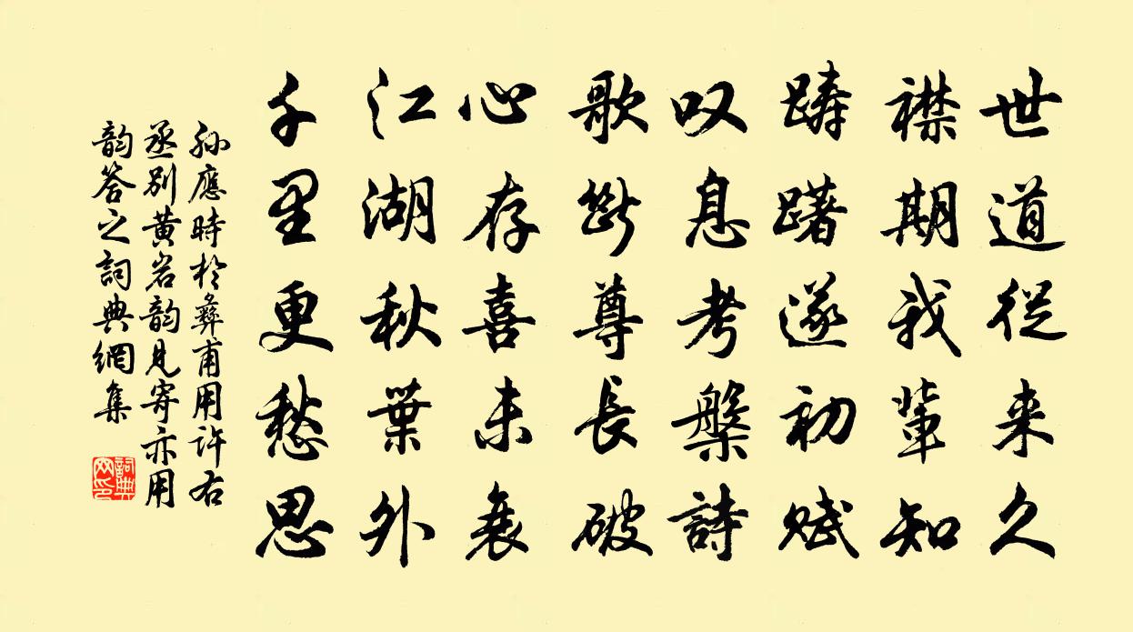 詩詞名句歷史字典書法欣賞書法字典國語詞典說文解字康熙字典古漢語字典標 題 作 者 詩 句 於彝甫用許右丞別黃岩韻見寄亦用韻答之作者:孫應時 朝代:宋代原文世道從來久,襟期我輩知。躊躇遂初賦,嘆息考槃詩。歌斷尊長破,心存喜未衰。江湖秋葉外,千里更愁思。詩詞問答問:《於彝甫用許右丞別黃岩韻見寄亦用韻答之》的作者是誰?答:孫應時問:該詩寫於哪個朝代?答:宋代書法欣賞於彝甫用許右丞別黃岩韻見寄亦用韻答之書法作品詩詞推薦玄妙觀重建玉皇殿詩楊維楨〔元代〕神鰲載弁青浮紅,水晶宮闕神人宮。金鋪雕礎固且崇,參差珠閣當天中。仰瞻倍扆天人容,天威只赤下地通。白雲偈頌七十一首釋了惠〔宋代〕星在天上,眼在眉下。星無暗明,眼無書夜。密密綿綿無縫罅。欲別葉茵〔宋代〕欲別哽無語,蘸酒評歸期。潮汐有朝暮,郎心無轉移。西亭早秋送徐員外武元衡〔唐代〕鼎鉉辭台座,麾幢領益州。曲池連月曉,橫角滿城秋。有美皇華使,曾同白社游。今年重相見,偏覺艷歌愁。奉和魯齋先生涵古齋詩二首金履祥〔宋代〕陋巷深居世已疏,書齋幽雅更清癯。神徂聖伏人何在,古往今來跡易枯。太極運行常自若,羲皇向上可潛圖。渾涵聞湖寇陳耆卿〔宋代〕淮上兵戈血染川,浙河餓莩骨盈船。又聞寇盜湖南起,不覺遲回夜半眠。食肉貴人無恙否,剝膚巧吏尚依然。吾皇次韻何伯溫三首洪咨夔〔宋代〕銅瓶一穟蕙,芳潔以自旌。相看色轉睟,未言意先傾。翛如鄭子真,聲名豈其卿。明窗細披挹,心空氣和平。道中聞九里香花王以寧〔宋代〕不見江梅三百日,聲斷紫簫愁夢長。何許綠裙紅帔客,御風來獻返魂香。覽褒子臥病一絕,聊以題示(沈氏生全真)韋應物〔唐代〕念子抱沉疾,霜露變滁城。獨此高窗下,自然無世情。春夜劉兼〔唐代〕薄薄春雲籠皓月,杏花滿地堆香雪。醉垂羅袂倚朱欄,小數玉仙歌未闋。鷓鴣天朱敦儒〔宋代〕竹粉吹香杏子丹。試新紗帽紵衣寬。日長几案琴書靜,地僻池塘鷗鷺閒。尋汗漫,聽潺湲。澹然心寄水雲間。無人抒情因上郎中二十二叔監察十五叔兼呈李益端公柳縝評事孟郊〔唐代〕方憑指下弦,寫出心中言。寸草賤子命,高山主人恩。游邊風沙意,夢楚波濤魂。一日引別袂,九回沾淚痕。自悲道傍竹楊萬里〔宋代〕竹竿穿竹籬,卻與籬為柱。大小且相依,榮枯何足顧。端午內中帖子詞皇帝閣王珪〔唐代〕御醑璩杯白,仙風羽扇清。靈符不須進,漢壘已銷兵。再和二首王邁〔宋代〕壯歲清源曾倦遊,今朝大郡又封侯。身安不用扶鳩杖,骨貴從知應虎頭。望闕承恩顏有喜,即家問政禮宜優,濟時別擬太上皇帝輓歌詞六首范成大〔宋代〕身濟投艱業,時乘撥亂機。荊榛荒帳殿,風雨頮戎衣。有日臨黃道,無星彗紫微。至今淮海上,猶詠六龍飛。偈頌九十三首釋梵琮〔宋代〕也大奇,也大奇,住個庵兒最好嬉。兩個兒童忽相打,中間一攧少人知。卻愁騎馬滑,故作泛舟歸。韓知合輓詩虞儔〔宋代〕容色雖嚴重,襟懷實坦夷。功名期自奮,趨向肯隨進。翻念懸車樂,俄成易簀悲。扁舟苕霅上,此意幾人知。滿江紅(和吳毅甫)吳泳〔宋代〕伶俐聰明,都不似、阿奴碌碌。漸欲買、青山路隱,白雲同宿。半醉盡教烏幘墮,熟眠休管屏風觸。算人生、能有永龍吟(湖山勝概金沙酴沒架)史浩〔宋代〕平湖渺渺煙波,是中只許神仙住。人間空愛,夭桃繁李,雪飛紅雨。誰信壺天,靚妝玉貌,春光容與。似佳人才子名句推薦事窮勢蹙之人,當原其初心;功成行滿之士,要觀其末路。洪應明《菜根譚·概論》 欹枕數秋天,蟾蜍下早弦。納蘭性德《菩薩蠻·蕭蕭幾葉風兼雨》 岸柳垂金線,雨晴鶯百囀。顧敻《醉公子·岸柳垂金線》 腸斷月明紅豆蔻,月似當時,人似當時否?納蘭性德《鬢雲松令·枕函香》 聖人不法古,不脩今。法古則後於時,脩今則塞於勢。商鞅《商君書·開塞》 平明日出東南地,滿磧寒光生鐵衣。李益《度破訥沙二首·其二 / 塞北行次度破訥沙》 柳如眉,雲似發,鮫綃霧縠籠香雪。魏承班《漁歌子·柳如眉》 月明星稀,烏鵲南飛。繞樹三匝,何枝可依?曹操《短歌行》 綺席象床寒玉枕,美人何處醉黃花。汪元量《望江南·幽州九日》 深村時節好,應為去年豐。范成大《寒食郊行書事》