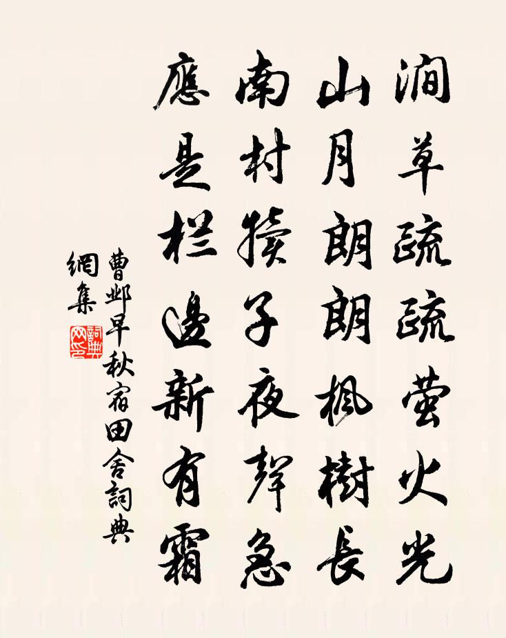 詩詞名句歷史字典書法欣賞書法字典國語詞典說文解字康熙字典古漢語字典標 題 作 者 詩 句 早秋宿田舍作者:曹鄴 朝代:唐代早秋宿田舍原文澗草疏疏螢火光,山月朗朗楓樹長。南村犢子夜聲急,應是欄邊新有霜。詩詞問答問:早秋宿田舍的作者是誰?答:曹鄴問:早秋宿田舍寫於哪個朝代?答:唐代問:早秋宿田舍是什麼體裁?答:七絕曹鄴早秋宿田舍書法欣賞早秋宿田舍書法作品注釋全唐詩詩詞推薦長陵唐彥謙〔唐代〕長安高闕此安劉,祔葬累累盡列侯。豐上舊居無故里,沛中原廟對荒丘。耳聞明主提三尺,眼見愚民盜一壞。千載送碧梧入府許月卿〔宋代〕人勸酒公入相,酒我勸公早酒歸。今以酒副樞入,好以元樞回。易為六經宗,學易貴知時。時止則時行,時義大矣和子長縣尉林同年立春後十日風雪大作訪客不虞儔〔宋代〕一束烏薪抵百金,外間風雪政愁陰。履穿東郭先生病,梅老西湖處士吟。青帝未教春滿目,玄冥還有歲寒心。蹇驢送松上人西歸兼呈去佞隱君子及其家賢子侄致釋寶曇〔宋代〕白雲二十七,倒跨楊岐驢。相當子歲年,力挽千乘車。佛法全盛日,南方即吾廬。後來鑿空輩,一一人為徒。誠負凌雲閣潘興嗣〔宋代〕蕭峰頂上與雲齊,一派溪流直下飛。擊破寒冰千萬片,涵林幽響動清暉。次韻答王東墅胡仲弓〔宋代〕元龍湖海分棲遲,懶把琴心累子期。不是三生曾有舊,如何一見便論詩。春行谷外鶯求友,月在吟邊鵲繞枝。甚欲走筆代書答西士戴栩〔宋代〕帝城龜百司官事少,故府庭閒長春草。獨餘人事十倍多,一月束龜逾束稿。我於其間厭見之,語可摹龜百不移。深竹林寺別友人(一作與德玄別,一作李玄)許渾〔唐代〕騷人吟罷起鄉愁,暗覺年華似水流。花滿謝城傷共別,蟬鳴蕭寺喜同游。前山月落杉松晚,深夜風清枕簟秋。明日秋雨嘆陸游〔宋代〕淙淙雨聲瀉高秋,稻粱浸瀾雨不休。志士仁人萬行淚,孤臣孽子無窮憂。一身窮困未暇恤,如此無事理有不?聖言詠苕霅釋文珦〔宋代〕苕霅水煙鄉,溪風六月涼。家家有船步,日日聽魚根。柳樹垂陰密,蘋花入夢香。山入心亦愛,時到詠滄浪。孩兒花佚名〔宋代〕纖穠初見似嬌痴,鼓舞春風二月時。何事自開還自落,可憐造化亦兒嬉。葉師迎娶還吳省親遂之官達州以詩見意孔武仲〔宋代〕言止蘇台駕,遂泛荊江舟。京師訣別易,不以樽俎留。念書片言贈,俚音謝珠球。飛飛雙鳳凰,指日還故丘。更翔春晚簡德孺李處權〔宋代〕人生有酒即佳辰,忽忽園林已暮暮。雨後落花渾帖砌,風前飛絮欲沾人。我如放浪陶彭澤,公是風流賀季真。伊水和運使陳學士游靈隱寺寓懷林逋〔宋代〕山壑氣相合,旦暮生秋陰。松門韻虛籟,錚若鳴瑤琴。舉目群狀動,傾耳百慮沉。按部既優遊,時此振衣襟。泓澄奉和周蕃伯用王道夫韻二章見寄陳傅良〔宋代〕森森萬木一精廬,黃卷青燈自卷舒。卻肯追隨三舍遠,不論聞問十年疎。遺賢公已長懷玉,老圃吾方欲荷鋤。安得憶游天台寄道流張佐〔唐代〕憶昨天台到赤城,幾朝仙籟耳中生。雲龍出水風聲急,海鶴鳴皋日色清。石筍半山移步險,桂花當澗拂衣輕。今來湖西納涼徐集孫〔宋代〕小艇撐過第一橋,酌泉橋下擲詩瓢。來游道院分荷供,擬拉吟僧遣鶴招。暮靄直從漁笛起,月華高過塔燈遙。且於浣溪沙·晚逐香車入鳳城張泌〔唐代〕晚逐香車入鳳城,東風斜揭繡簾輕,慢回嬌眼笑盈盈。訊息未通何計是?便須佯醉且隨行,依稀聞道太狂生。在伯考試未歸有懷趙蕃〔宋代〕行路悠悠自有詩,君行況乃暮秋時。復萌鄙吝疏黃憲,都盡利名親紫芝。長亭怨慢周密〔宋代〕齋、西安令翁浩堂、郡博士洪恕齋,一時名流星聚,見為奇事。倅居據龜阜,下瞰萬室,外環四山,先子作堂曰嘯名句推薦小軒窗。正梳妝。相顧無言,惟有淚千行。蘇軾《江城子·乙卯正月二十日夜記夢》 桃花春色暖先開,明媚誰人不看來。周朴《桃花》 丹灶初開火,仙桃正落花。孟浩然《清明日宴梅道士房 / 宴梅道士山房》 秋雨一何碧,山色倚晴空。方岳《水調歌頭·平山堂用東坡韻》 畫船兒天邊至,酒旗兒風外颭。張養浩《水仙子·詠江南》 記得短亭歸馬,暮衙蜂鬧。吳文英《天香·蠟梅》 仁義禮善之於人也,辟之若貨財粟米之於家也。荀子《荀子·大略》 黑髮不知勤學早,白首方悔讀書遲。顏真卿《勸學詩》 越人語天姥,雲霞明滅或可睹。李白《夢遊天姥吟留別 / 別東魯諸公》 雪虐風饕愈凜然,花中氣節最高堅。陸游《落梅》
