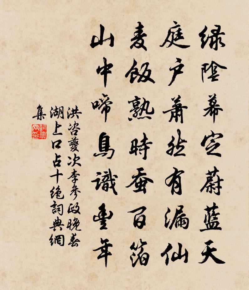 詩詞名句歷史字典書法欣賞書法字典國語詞典說文解字康熙字典古漢語字典標 題 作 者 詩 句 次李參政晚春湖上口占十絕作者:洪咨夔 朝代:宋代次李參政晚春湖上口占十絕原文綠陰幕定蔚藍天,庭戶蕭然有漏仙。麥飯熟時蠶百箔,山中啼鳥識豐年。詩詞問答問:次李參政晚春湖上口占十絕的作者是誰?答:洪咨夔問:次李參政晚春湖上口占十絕寫於哪個朝代?答:宋代洪咨夔次李參政晚春湖上口占十絕書法欣賞次李參政晚春湖上口占十絕書法作品詩詞推薦頌證道歌證道歌釋印肅〔宋代〕有人不肯任情徵,大地山河發問情。一指頭端無兩樣,普天匝地一時明。憩楹塘驛二首楊萬里〔宋代〕松鳴竹嘯響千崖,為底炎蒸吹不開。自是筍輿趍北去,薰風不是不南來。清明陰雨呈南舍吳儆〔宋代〕薄薄輕寒作許陰,村村花柳為誰新。良辰欣見百五日,冠者仍餘五六人。冷雨淒風連午夜,飛花流水一年春。窺園城南雜題劉敞〔宋代〕盤跚不稱三公位,掩抑空妨數畝庭。只有老僧偏愛惜,倩人圖畫作書屏。戲題大年防禦蘆雁黃庭堅〔宋代〕揮毫不作小池塘,蘆荻江村落雁行。雖有珠簾藏翡翠,不忘煙雨罩鴛鴦。嘉陵江羅鄴〔唐代〕嘉陵南岸雨初收,江似秋嵐不煞流。此地終朝有行客,無人一為棹扁舟。宿浚儀公湖亭楊載〔元代〕兩兩三三白鳥飛,背人斜去落漁磯。雨余不遣濃雲散,猶向前山擁翠微。留范景山陳著〔宋代〕滿天風雨作新正,下訪勞君一日程。長揖不交隨俗禮,苦言惟有隔年情。鐙生暈處醒相對,犬吠聲中心自驚。人事禪人並化主寫真求贊釋正覺〔宋代〕默默工夫,心田自鋤。醭生唇上滿,泥斲鼻頭余。少林何曾說話,曹溪不識文書。誰言伎倆渾無巧,自信家風也不次陳和仲惠雲山歌韻徐僑〔宋代〕幽人尋坦道,為言柔履剛。所利在艱正,未取馬逐良。雲山坐深窈,無人蘭自芳。青青松與竹,障暑拒雪霜。人跡湖口阻風劉過〔宋代〕冒雪沖霜已十程,狂風乃敢厄吾行。無人說向江神道,莫待明年卻世情。送僧歸廬山趙嘏〔唐代〕禪棲忽憶五峰游,去著方袍謝列侯。經啟樓台千葉曙,錫含風雨一枝秋。題詩片石侵雲在,洗缽香泉覆菊流。卻憶壽星寺聞子規二首周文璞〔宋代〕子規欲歸歸未得,啼向錢王壽星石。月明血盡人不知,只怪曉山深似碧。文宣王及其弟子贊宋高宗〔宋代〕賢行顏叔,親承尼父。志銳所期,道尊是輔。泥在鈞陶,木就規矩。終縻好爵,揚名東武。悼楊休甫陳傅良〔宋代〕袖手旁觀一世余,元非親物亦非疎。酒邊每事如人意,燈下通宵讀我書。學到莊騷才止此,生逢周流定何如。西州早春滻水送友人溫庭筠〔唐代〕青門煙野外,渡滻送行人。鴨臥溪沙暖,鳩鳴社樹春。殘波青有石,幽草綠無塵。楊柳東風裡,相看淚滿巾。道中四絕鄭剛中〔宋代〕敗篋沖霜思往歲,舊遊如夢慨平生。鬢華已逐心事老,溪水祗如前日清。龍舒朱獻賓主漢陽簿棄官以歸予亦不合丐去為王阮〔宋代〕浪作鸞棲去,驚隨鶴怨還。無心漢江水,有節皖公山。此事真堪話,諸公寧厚顏。嗟予亦興盡,昨夜已投閒。元豐己未三院東閣作元豐戊午夏予尹京治陳蘇頌〔宋代〕搆虛為實盡枝辭,直道公心自不欺。眾口鑠金雖可畏,三人成虎我猶疑。忠邪所賴圓穹鑒,通塞須憑大衍推。況是寅子生朝寄以蜀果項安世〔宋代〕老來夫婦喜如顛,遙舉生朝白玉船。多作時文充上賦,深持偽學繼家傅。九年伏枕吾何恨,五子通經汝更專。嘉實名句推薦何處相逢,登寶釵樓,訪銅雀台。劉克莊《沁園春·夢孚若》 朝落暮開空自許,竟無人解知心苦晏幾道《蝶戀花·笑艷秋蓮生綠浦》 霜風搗盡千林葉,閒倚筇枝數鸛巢。范成大《冬日田園雜興》 戍客望邊邑,思歸多苦顏。李白《關山月》 琅琅新雨洗湖天,小景六橋邊。張可久《風入松·九日》 思則有備,有備無患左丘明《左傳·襄公·襄公十一年》 舞殿冷袖,風雨淒淒。杜牧《阿房宮賦》 投策命晨裝,暫與園田疏。陶淵明《始作鎮軍參軍經曲阿作》 人之初,性本善。王應麟《三字經·全文》 寂寞離亭掩,江山此夜寒。王勃《江亭夜月送別二首》