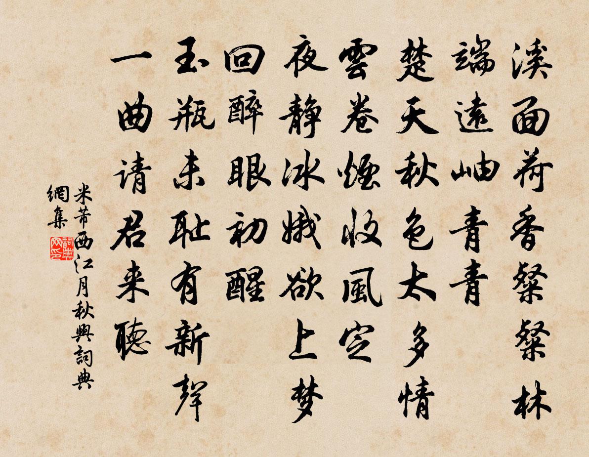 詩詞名句歷史字典書法欣賞書法字典國語詞典說文解字康熙字典古漢語字典標 題 作 者 詩 句 西江月(秋興)作者:米芾 朝代:宋代西江月(秋興)原文溪面荷香粲粲,林端遠岫青青。楚天秋色太多情。雲捲菸收風定。夜靜冰娥欲上,夢回醉眼初醒。玉瓶未恥有新聲。一曲請君來聽。詩詞問答問:西江月(秋興)的作者是誰?答:米芾問:西江月(秋興)寫於哪個朝代?答:宋代問:西江月(秋興)是什麼體裁?答:詞米芾西江月(秋興)書法欣賞西江月(秋興)書法作品詩詞推薦朝爽之前瑞竹忽生喻良能〔宋代〕好竹逾千個,數莖忽發生。月明連理影,風細合歡聲。矯矯雙鴛舉,悠悠兩鳳鳴。只應三昧手,彩筆畫難成。席上有贈韓偓〔唐代〕矜嚴標格絕嫌猜,嗔怒雖逢笑靨開。小雁斜侵眉柳去,媚霞橫接眼波來。鬢垂香頸雲遮藕,粉著蘭胸雪壓梅。莫道和郭戶部中秋月李復〔宋代〕重雲宿靄風收盡,千丈銀毫吐海涯。露氣洗開青玉闕,龍宮浮出白蓮華。寒驚棲鵲翻庭樹,陰引靈珠耀浦沙。我是勸農 其四陶淵明〔魏晉〕氣節易過,和澤難久。冀缺攜儷,沮溺結耦。相彼賢達,猶勤隴畝。矧茲眾庶,曳裾拱手!明妃曲武衍〔宋代〕馬上風沙亂鬢蟬,膻鄉同地不同天。琵琶何用彈深怨,出降烏孫更可憐。次韻子瞻過淮見寄兼簡孫奕職方三首蘇轍〔宋代〕行役饒新喜,臨川逢故人。相看對泉石,憐我在埃塵。會合終多故,分張類有神。南遊得如願,夢想霅溪春。釣池口阻風,迷失港道范成大〔宋代〕迴風打船失西東,柁痴櫓弱無適從。三老號呼鐵纜墜,招頭撾鼓驅魚龍。千篙撐折百丈斷,日暮稍與洪相通。推移同前太行皇太后輓詞二首周必大〔宋代〕憶昨登中壽,梅觴慶九重。回春方晝永,月掩遽雲濃。鐘鼓沈長樂,蠶桑罷濯龍。宣仁遺懿在,定謚獨追蹤。同陳器之題迎福院軒張耒〔宋代〕東風吹面酒楹樽,臘後一番梅柳新。殘雪作寒山向晚,橫煙不動野浮春。地留京洛豪華氣,川帶秦韓戰伐塵。今古和劉編修潛夫讀近報蔣峴被逐二首王邁〔宋代〕讀報欣然共賦詩,古來忠佞各殊岐。彼猶愧見蔣穎叔,君盍自期劉器之。惡草剪除雖一快,芳蘭銷歇已多時。懷哉絕句·人生無百歲劉基〔明代〕人生無百歲,百歲復如何?古來英雄士,各已歸山河。病中喜李仲霍王子載見過晁公溯〔宋代〕春風餞余寒,山雨留暝色。杜門正臥病,俯仰空四壁。庭空鳥雀至,窗破風雨入。擁爐意無聊,胸次百憂集。肉消交讓瀆楊備〔宋代〕琴丁結友事耕耘,田熟翻如虞芮君。彼此持廉為棄物,一名交讓兩難分。重到都門俲轆轤體柴望〔宋代〕兩年不作京華夢,重到湖山事已非。柳外晚風寒食節,花間天氣雨晴時。闌乾獨憑鶯飛去,簾幕低垂燕未歸。欲托木客李公佐仆〔唐代〕酒盡君莫沾,壺傾我當發。城市多囂塵,還山弄明月。店翁送花宋自遜〔宋代〕店翁排日送春花,老去情懷感物華。翁欲殷勤留客住,客因花惱轉思家。紹興次韻趙成猶閏七夕項安世〔宋代〕乞得天孫網,人間巧已多。還逢閏重七,奈此眾兒何。耕織關民事,婚姻自俗訛。乾坤大務本,觀象莫蹉跎。偈頌一百二十三首釋普度〔宋代〕垂垂白髮老成魔,異類中行罪過多。業債既深償未足,又托犁把出煙蘿。鶯鶯圖唐寅〔明代〕扶頭酒醒寶香焚,戲寫蒲東一片雲。昨夜隔牆花影動,猛聞人語喚雙文。病梅館記龔自珍〔清代〕江寧之龍蟠,蘇州之鄧尉,杭州之西溪,皆產梅。或曰:“梅以曲為美,直則無姿;以欹為美,正則無景;以疏為名句推薦心似已灰之木,身如不系之舟。蘇軾《自題金山畫像》 酒賤常愁客少,月明多被雲妨。蘇軾《西江月·世事一場大夢》 寒隨一夜去,春逐五更來。史青《應詔賦得除夜》 細數十年事,十處過中秋。范成大《水調歌頭·細數十年事》 零落成泥碾作塵,只有香如故。陸游《卜運算元·詠梅》 離恨做成春夜雨。添得春江,劃地東流去楊炎正《蝶戀花·別范南伯》 離多最是,東西流水,終解兩相逢。晏幾道《少年游·離多最是》 莫辭秉燭通霄坐,明日相思隔隴煙。王守仁《諸門人送至龍里道中二首》 汀洲采白苹,日落江南春。柳惲《江南曲》 不怕慢,只怕站。佚名《增廣賢文·下集》
