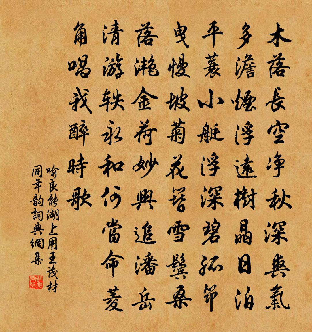 詩詞名句歷史字典書法欣賞書法字典國語詞典說文解字康熙字典古漢語字典標 題 作 者 詩 句 湖上用王茂材同年韻作者:喻良能 朝代:宋代湖上用王茂材同年韻原文木落長空淨,秋深爽氣多。澹煙浮遠樹,晶日泊平蓑。小艇浮深碧,孤筇曳慢坡。菊花簪雪鬢,桑落灩金荷。妙興追潘岳,清游軼永和。何當命菱角,唱我醉時歌。詩詞問答問:湖上用王茂材同年韻的作者是誰?答:喻良能問:湖上用王茂材同年韻寫於哪個朝代?答:宋代喻良能湖上用王茂材同年韻書法欣賞湖上用王茂材同年韻書法作品詩詞推薦送僧歸護國寺黃宗旦〔宋代〕一瓶一缽是生涯,來扣樞扉帶礪家。寵服降從丹鳳闕,禪房歸掩赤城霞。五芝岩下傳心印,八桂峰前散雨花。還伴和杜學士旅次淮口阻風李嶠〔唐代〕夕吹生寒浦,清淮上暝潮。迎風欲舉棹,觸浪反停橈。淼漫煙波闊,參差林岸遙。日沉丹氣斂,天敞白雲銷。水雁戲呈堯夫司馬光〔宋代〕近來朝野客,無座不談禪。顧我何為者,逢人獨懵然。羨君詩即好,說佛眾誰先。只恐前身是,東都白樂天。自嘆二首舒邦佐〔宋代〕莫莫更莫莫,休休復休休。平生都是錯,一病盡堪羞。龜為靈鑽殼,膏因明出油。細思根本悴,端的是招憂。臨清龕汪任〔宋代〕地辟仙龕小亦奇,龕前長瀉碧琉璃。我來恰似陶彭澤,鑒景濡毫便賦詩。贊李源圓澤圖釋法薰〔宋代〕昭昭靈靈,未脫生死。等閒狹路相逢,無奈這冤家子。天竺山前招角歌,至今餘韻在松蘿。句陳越〔宋代〕誰哀城下酌,不廢洛中吟。滿江紅呂本中〔宋代〕東里先生,家何在、山陰溪曲。對一川平野,數間茅屋。昨夜岡頭新雨過,門前流水清如玉。抱小橋、回合柳參天題汪水雲詩十首羅志仁〔宋代〕西子西湖只一般,翠雲珠髻恣君看。世間萬物移人處,高鼻虬須也被瞞。庚申病中作李曾伯〔宋代〕六十三年憂患鄉,人言晚景尚悠長。不知氣鬱致痰厥,忽爾異證生微茫。操修弗遂仁者壽,治療倍費醫之良。今將鸚鵡子蘭〔唐代〕翠毛丹觜乍教時,終日無寥似憶歸。近來偷解人言語,亂向金籠說是非。廣陰亭詩陳士徽〔宋代〕唐翁靜者閉門飲水啜粥無知音,我能發爾一片冰清心。巨風吹天振海浪如屋,此翁林中眠正熟。中天渴烏吐火六合春暮張耒〔宋代〕春盡空餘白日長,枝頭青杏已堪嘗。人閒簾幕燕相語,風暖園林柳半黃。病里不知時節換,老來都減少年狂。殘風清平樂(秋詞)蘇軾〔宋代〕清淮濁汴。更在江西岸。紅旆到時黃葉亂。霜入梁王故苑。秋原何處攜壺。停驂訪古踟躕。雙廟遺風尚在,漆園傲山中自敘釋智圓〔宋代〕閉門業文翰,誰謂溪山陋。閒臥貴道肥,誰謂形容瘦。斯言谷無玷,內省庶不疚。深識淺江海,寬量窄宇宙。鄰女蓮唐彥謙〔唐代〕新蓮映多浦,迢遞綠塘東。靜影搖波日,寒香映水風。金塵飄落蕊,玉露洗殘紅。看著余芳少,無人問的中。送蘇參軍戎昱〔唐代〕憶昨青襟醉里分,酒醒回首愴離群。舟移極浦城初掩,山束長江日早曛。客來有恨空思德,別後誰人更議文。常嘆次韻諸公絕句陳造〔宋代〕荊玉驪珠忽滿前,示須攻石探濤淵。南帆自詫歸裝富,準擬重呼阿買編。張推水亭賞蓮惠詩次韻舒邦佐〔宋代〕玉環妖血不飛天,化作芙蕖滿眼前。恰有六郎來比似,便喔七字斗清妍。曉妝洗露漢宮女,晚步凌波水府仙。得待村居即事六言十首劉克莊〔宋代〕風窗有竹相敲,地爐無葉可燒。亂書翻覆未了,一燈明滅頻挑。名句推薦綠杯紅袖趁重陽。人情似故鄉。晏幾道《阮郎歸·天邊金掌露成霜》 鴻雁向西北,因書報天涯。李白《千里思》 酒闌歌罷玉尊空,青缸暗明滅。李清照《好事近·風定落花深》 想當年、空運籌決戰,圖王取霸無休。柳永《雙聲子·晚天蕭索》 名不徒生,而譽不自長。功成名遂。墨子《墨子·02章 修身》 論如析薪,貴能破理。劉勰《文心雕龍·論說》 九月寒砧催木葉,十年征戍憶遼陽。沈佺期《古意呈補闕喬知之 / 古意 / 獨不見》 誰人背後無人說,哪個人前不說人?佚名《增廣賢文·上集》 人家見生男女好,不知男女催人老。王建《短歌行》 芳草年年惹恨幽。想前事悠悠。石延年《燕歸梁·春愁》