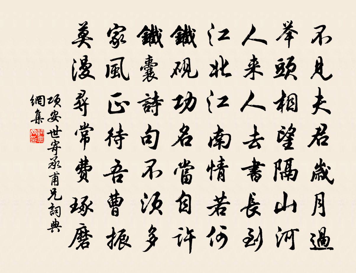 詩詞名句歷史字典書法欣賞書法字典國語詞典說文解字康熙字典古漢語字典標 題 作 者 詩 句 寄承甫兄作者:項安世 朝代:宋代寄承甫兄原文不見夫君歲月過,舉頭相望隔山河。人來人去書長到,江北江南情若何。鐵硯功名當自許,鐵囊詩句不須多。家風正待吾曹振,莫漫尋常費琢磨。詩詞問答問:寄承甫兄的作者是誰?答:項安世問:寄承甫兄寫於哪個朝代?答:宋代項安世寄承甫兄書法欣賞寄承甫兄書法作品詩詞推薦送呂提乾並簡謝泉方岳〔宋代〕山雲一夜雨,稱放過閶船。坑發寧遣壙,民貧不為錢。范碑秋寺古,楚觀暮江前。寄謝東山老,靈砂並欲仙。青州夏竦〔宋代〕日上西山舞鸞鶴,波翻碧海斗蛟龍。直鉤到了成何事,消得君王四履封。滿庭芳 贈周信等王丹桂〔元代〕貴賤由天,榮枯隨分,分明不在強圖。得之本有,失者本來無。謾使機關巧幸,勞神智、疲役形軀。痴迷客,蠅頭賀新郎(端午)詹無咎〔宋代〕梅子黃時雨。對幽窗、依依抱獨,幾多愁緒。潤逼琴絲無雅韻,難續文園舊詣。頭白盡、相如誰顧。燕子樓空塵又太常引 以上二首見詞品卷五陳孚〔元代〕短衣孤劍客乾坤。奈無策,報親恩。三載隔晨昏。更疏雨、寒燈斷魂。赤城霞外,西風鶴髮,猶想倚柴門。蒲醑謾春從天外來王吉昌〔元代〕名利如何。嘆六朝七國,五霸山河。幾多興廢,一夢南柯。光陰暗裡消磨。悟雲山煙水,好歸去、策杖披蓑。任春游真陽石室祖無擇〔宋代〕昔讀到難篇,乃聞真陽室,亦嘗惟斯人,稱道或浮實。邈在數千里,莫覿煙霞質。青山有獨往,吾志久已必。如何謁金門(和陳提乾)辛棄疾〔宋代〕山共水。美滿一千餘里。不避曉行並早起。此情都為你。不怕與人尤殢。只怕被人調戲。因甚無個阿鵲地。沒工夫寄呈漳守李侍郎元善四首王邁〔宋代〕向來大姓虐窮閭,千畝農田浚作渠。點吏鷹豪爭攫肉,驕兒螂怒敢當車。老丞嫉惡無容忍,直禾誅欲剪鋤。解印此杜正獻與歐公書簡帖贊岳珂〔宋代〕厚德如祁公,黃鐘大鏞,和樂且雍。尊賢如六一,朱弦疏越,三漢廟瑟。道比志葉,不膠而漆。雇中外之雖異,猶頌一百則釋重顯〔宋代〕兔馬有角,牛羊無角。絕毫絕厘,如山如岳。黃金靈骨今猶在,白浪滔天何處著。無處著,雙履西歸曾失卻。次韻答丁端州王安石〔宋代〕莫嗟荒僻又離群,且喜風謠嶺北聞。銅柱雖然蠻徼接,竹符還是漢家分。春書來逐衡陽雁,秋騎歸看隴首雲。相見用從軍古雲樂為韻賀楊覺甫乾李曾伯〔宋代〕國有金湯在,鄰修玉帛雲。夷侵由廢雅,苗格自敷文。當寧形宵慮,公車以歲聞。便當從幕府,入校道山芸。寄題魯郎中遂隱堂吳芾〔宋代〕老向江頭強剖符,夢魂長是繞吾廬。正慚我未成歸計,卻羨君先遂隱居。湖上煙雲常縹緲,園中花木總扶疏。他時鷓鴣天姜夔〔宋代〕也。是日即平甫初度,因買酒茅舍,並坐古楓下。古楓,旌陽在時物也。旌陽嘗以草屨懸其上,土人謂屨為屐,因贈川官五星先生王邁〔宋代〕談星這士如星密,得似川官萬之一。雅籌到手疾如飛,口觜翻瀾眼波碧。相逢笑問雌甲辰,掀髯慫惥曲江春。自憐陪王漕右司游東園章甫〔宋代〕晝永花紅困,煙輕草綠齊。緩行金瑣細,爛醉玉東西。棋局觀成敗,河魚入品題。門闌老賓客,勝處謝招攜。游五官谷鄭滋〔宋代〕大廈將顛仆,一木安能支。唐室既頹齧,有才何所施。表聖隱王官,出處適其宜。藩鎮方跋扈,擁兵相雄雌。尾大清心鏡 顯決烈馬鈺〔元代〕出家兒,要決斷。一口咬碎,無明火鑽。道萬事、不系剛腸,堪稱個鐵漢。志無移,心不亂。認正古今,神仙公案偈傾一百三十三首釋法薰〔宋代〕識得心,山嶽沉。握金成土,握土成金。腳後腳前,見成行貨。少室峰前,交點不過。名句推薦桑野就耕父,荷鋤隨牧童。孟浩然《田家元日》 因思杜陵夢,鳧雁滿回塘。溫庭筠《商山早行》 善不積不足以成名,惡不積不足以滅身。佚名《易傳·繫辭傳下·第五章》 鳳簫聲動,玉壺光轉,一夜魚龍舞。辛棄疾《青玉案·元夕》 強國戰兵,霸國戰智,王國戰義,帝國戰德,皇國戰無為。王通《中說·卷五·問易篇》 楚水巴山江雨多,巴人能唱本鄉歌。劉禹錫《竹枝詞二首·其二》 愛而知其惡,憎而知其善。戴聖《禮記·曲禮上》 擁紅妝,翻翠蓋,花影暗南浦。高觀國《祝英台近·荷花》 碧雲天,黃葉地,秋色連波,波上寒煙翠。范仲淹《蘇幕遮·懷舊》 為我引杯添酒飲,與君把箸擊盤歌。白居易《醉贈劉二十八使君》