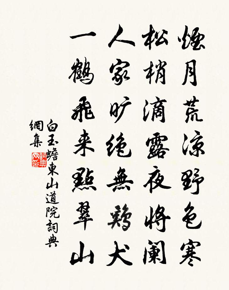 詩詞名句歷史字典書法欣賞書法字典國語詞典說文解字康熙字典古漢語字典標 題 作 者 詩 句 東山道院作者:白玉蟾 朝代:宋代東山道院原文煙月荒涼野色寒,松梢滴露夜將闌。人家曠絕無雞犬,一鶴飛來點翠山。詩詞問答問:東山道院的作者是誰?答:白玉蟾問:東山道院寫於哪個朝代?答:宋代問:東山道院是什麼體裁?答:七絕白玉蟾東山道院書法欣賞東山道院書法作品詩詞推薦贈京尹八首袁燮〔宋代〕儒學當年究指歸,服勞王事不言疲。遙知今日張京尹,不瑕閨房畫婦眉。好事近(十二之九)陸游〔宋代〕小倦帶餘酲,淡淡數欞斜日。驅退睡魔十萬,有雙龍蒼璧。少年莫笑老人衰,風味似平昔。扶杖凍雲深處,探溪梅送柴仲山歸里潘璵〔宋代〕長台在何處,俄聽話歸期。雪霽千山月,梅開一路詩。京塵隨地盡,春色到家知。欲把西湖酒,重來是幾時。梅花二首潘璵〔宋代〕雪中獨愛此花開,莫笑花飛委綠苔。骨里有香吹不散,明年依舊領春回。清泉亨老寄鼓枕二首劉子翬〔宋代〕蘧蘧一覺直千金,雅贈徒知感激深。莫道林間高臥穩,憂時亦有枕戈心。送王梅州二首劉克莊〔宋代〕禍始自三槍,菑猶被一方。帝將安渤海,君肯薄淮陽。老手何憂斬,新眉尚費妝。漢庭褒郡最,蚤晚入為郎。鵲橋仙姬翼〔元代〕依山隱霧。臨池影舞。卻被文皮自誤。豫章楠梓有何辜,受斤斧、傷殘無數。惺惺不悟。還同暮故。身後虛名何處水調歌頭趙雍〔元代〕春色去何急,春去尚微寒。滿地落花芳草,漸覺綠陰圓。馬足車塵情味,暑往寒來歲月,擾擾十餘年。贏得朱顏老次韻蔡君謨侍郎寒食西湖張先〔宋代〕飛飛畫楫繞花洲,霽雨浮花出岸流。誰廣金明為水戰,自來銀漢有霓舟。行從使節春憂盛,住買吳山老未由。人遲舟過青半,望橫山塔二首楊萬里〔宋代〕孤塔分明是故人,一回一見一情親。朝來走上山頭望,報導蘭溪酒恰新。次韻朱秀才二首陳造〔宋代〕蕭齋愁興倩誰寬,寵鶴昂霄顧羽翰。自昔詩深知武諤,肯辭雨濕過蘇端。心期落落空軒豁,世事悠悠拙控摶。正枕判府曹宣徽生日朱長文〔唐代〕盛世高門福兩全,星辰粹氣萃為賢。釣璜韜略傳三葉,齋鉞風棱積十年。陰德在人宜壽考,清才脫俗恐神仙。寒儒如夢令(飲婦人酒)史浩〔宋代〕摘索衣裳宮樣。生得臉兒福相。容止忒精神,一似觀音形像。歸向。歸向。見者擎拳合掌。題包虎張榘〔宋代〕正眎眈眈怒作威,西風搖毒上牙須。山翁祗作丹青看,馮婦從教自下車。送龐佑甫五首韓元吉〔宋代〕濯濯機中絲,粲粲綿繡段。自非同心人,千金孰肯換。一字至九字詩聯句嚴維〔唐代〕 東,西, 搗衣詩呈水雲王清惠〔宋代〕妾命薄如葉,流離萬里行。燕塵燕塞外,愁坐聽衣聲。讀素問十六首方回〔宋代〕三品別貴賤,四制寄奇偶。主病則用之,上藥或弗取。得士寒畯可,量才世胄否。豕苓雞壅言,吾亦聞莊叟。過漢州留房公湖一日戲和少陵韻二首李壁〔宋代〕西湖天下勝,賢相古來稀。汛掃邀明月,徜徉逗落暉。蒲深鸂鶒響,林靜鷓鴣飛。腳力應難遍,雕欄幸可依。東林寺張至龍〔宋代〕滿院香風乍熟楂,猴孫抱子坐枯槎。頭陀不慣迎賓客,自折芙蓉供釋迦。名句推薦擊楫中流,曾記淚沾裳李好古《江城子·平沙淺草接天長》 前年伐月支,城上沒全師。張籍《沒蕃故人》 八年十二月,五日雪紛紛。白居易《村居苦寒》 淮南皓月冷千山,冥冥歸去無人管。姜夔《踏莎行·自沔東來》 用功於內者,必於外無所求王永彬《圍爐夜話·第一八八則》 兒童見說深驚訝,卻問何方是故鄉。殷堯藩《同州端午》 生則盡力,死則死耳!張廷玉《明史·列傳·卷二十》 天涯也有江南信。梅破知春近。黃庭堅《虞美人·宜州見梅作》 粉墮百花洲,香殘燕子樓。曹雪芹《唐多令·柳絮》 兩刃相割,利鈍乃知;二論相訂,是非乃見。王充《論衡·卷二十九·案書篇》