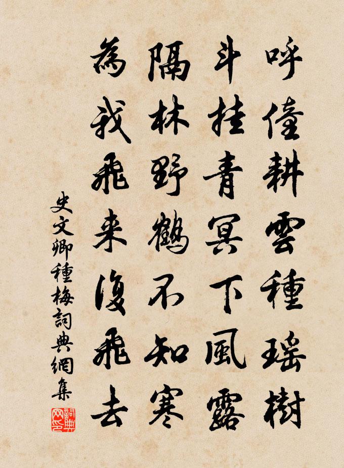 詩詞名句歷史字典書法欣賞書法字典國語詞典說文解字康熙字典古漢語字典標 題 作 者 詩 句 種梅作者:史文卿 朝代:宋代種梅原文呼僮耕雲種瑤樹,斗掛青冥下風露。隔林野鶴不知寒,為我飛來復飛去。詩詞問答問:種梅的作者是誰?答:史文卿問:種梅寫於哪個朝代?答:宋代史文卿種梅書法欣賞種梅書法作品詩詞推薦迎月陳起〔宋代〕尊酒貪迎月,人生醉後嘉。夜來窗不掩,吹落一瓶花。題順寧窗王遂〔宋代〕雲從西去又還東,不逐天回卻逐風。春日豈無晴晝永,掃除陰翳出長空。偈頌一百一十七首釋紹曇〔宋代〕獨坐大雄峰,臨機多弄險。遭虎口殺活不分,脫狐身真假難辨。那堪創立清規,平地深深坑壍。繩索成不共戴天讎寄南劍詹野渡先生丘葵〔宋代〕賢聖已往古,吾儕空自今。六經尋斷脈,千里遇知音。莫笑因緣淺,相期造道深。可憐山海隔,無路盍朋簪。看梅徐集孫〔宋代〕歲寒氣味少人知,一度相逢一度奇。不受陽和私點化,慣經風雪冷禁持。影橫坡老數枝畫,香沁逋仙兩句詩。相對程帥以詩見慰用韻謝之陳造〔宋代〕平時聯輝星,轉首食既月。誰能玄覽空,影事睨盈缺。老了一掬淚,未憗謝天合。生世岐高下,末路各一穴。莊生禁菸前一日招幕屬小集林提乾有詩和韻李曾伯〔宋代〕草草登樓適,英流邁昔賢。詩篇長慶集,人物永和年。訪古宜聯社,傷春又禁菸。青簾家酒賤,剩飲莫論錢。緣識宋太宗〔宋代〕心如明鑑照織微,大道之中沒是非。拂拭塵埃高掛閣,天邊日月有光輝。贈僧韓偓〔唐代〕盡說歸山避戰塵,幾人終肯別囂氛。瓶添澗水盛將月,衲掛松枝惹得雲。三接舊承前席遇,一靈今用戒香熏。相逢雙調 大司命阿魯威〔元代〕令飄風凍雨清塵,開閶闔天門,假道天津。千乘迴翔,龍旗冉冉,鸞駕轔轔。結桂椒兮乘雲並迎,問人間兮壽夭莫詠黃鶯(一作鄭愔詩,又作鄭縉)孫處玄〔唐代〕欲囀聲猶澀,將飛羽未調。高風不借便,何處得遷喬。盧循河南故城方信孺〔宋代〕蛙據方州妄自尊,沈郎百萬若雲屯。歸舟無路尋巢穴,空有盧亭舊子孫。北山會飲鄭剛中〔宋代〕四圍明窗香霧塞,酒射玻璃成琥珀。無多酌我先有言,須識次公為惡客。長鯨豈問湖海寬,偃鼠定知胸次窄。後園雪樓程御史次方山房韻見寄用韻答賦三首何夢桂〔宋代〕青樓有蛾眉,翳袖渺獨處。日暮賦摽梅,愧我求彼士。誰家操孤鸞,感此中夜起。明河落天西,玉繩低欲輊。結言已亥雜詩 157龔自珍〔清代〕問我清游何日最,木樨風外等秋潮。忽有故人心上過,乃是虹生與子瀟。如夢令佚名〔宋代〕竹上一樓嵐翠。竹下一渠春水。中有隱人居,破屋數間而已。無事。無事。靜夜月明千里。同舍置酒孫園招熊莘老項安世〔宋代〕千年故國陽春地,今日王孫尚姓熊。坐上堂堂皆此客,雲間袞袞看諸公。題詩小苑春風裡,把酒夕陽煙雨中。莫恨浣溪沙·紅藕花香到檻頻李珣〔唐代〕紅藕花香到檻頻,可堪閒憶似花人,舊歡如夢絕音塵。翠疊畫屏山隱隱,冷鋪文簟水潾潾,斷魂何處一蟬新?殘句:春殘葉密花枝少王禹偁〔宋代〕春殘葉密花枝少,睡起茶親酒盞疏。燕歸梁(送別)王質〔宋代〕拂拂春風入馬蹄。□駐綠楊堤。綠楊堤上乳鶯啼。聲聲怨、怨春歸。而今一似花流水,蹤跡任東西。利成名遂在何名句推薦春已歸來,看美人頭上,裊裊春幡。辛棄疾《漢宮春·立春日》 今年游寓獨游秦,愁思看春不當春。杜審言《春日京中有懷》 勝法之務莫急於去奸,去奸之本莫深於嚴刑。商鞅《商君書·開塞》 是故置本不安者,無務豐末。墨子《墨子·02章 修身》 野竹分青靄,飛泉掛碧峰。李白《訪戴天山道士不遇》 智足以拒諫,言足以飾非司馬遷《史記·汲鄭列傳》 君子敬其在己者,而不慕其在天者,是以日進也。荀子《荀子·天論》 漠漠秋雲起,稍稍夜寒生。白居易《微雨夜行》 彭蠡湖天晚,桃花水氣春。白居易《彭蠡湖晚歸》 為淵驅魚者,獺也;為叢驅爵者,鸇也孟子《孟子·離婁章句上·第九節》