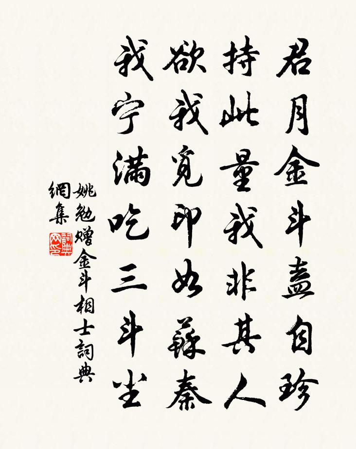 詩詞名句歷史字典書法欣賞書法字典國語詞典說文解字康熙字典古漢語字典標 題 作 者 詩 句 贈金斗相士作者:姚勉 朝代:宋代贈金斗相士原文君月金斗盍自珍,持此量我非其人。欲我覓印如蘇秦,我寧滿吃三斗塵。詩詞問答問:贈金斗相士的作者是誰?答:姚勉問:贈金斗相士寫於哪個朝代?答:宋代姚勉贈金斗相士書法欣賞贈金斗相士書法作品詩詞推薦鷓鴣天·彩袖殷勤捧玉鍾晏幾道〔宋代〕彩袖殷勤捧玉鍾,當年拚卻醉顏紅。舞低楊柳樓心月,歌盡桃花扇底風。從別後,憶相逢,幾回魂夢與君同。今宵余為建陽令遣小吏王堪為西山翁之役翁留之仙劉克莊〔宋代〕或盤碧漢唳清宵,幾載山中伴寂寥。今日鶴來翁已出,他年卻恐費翁招。武陵春晏幾道〔宋代〕九日黃花如有意,依舊滿珍叢。誰似龍山秋興濃,吹帽落西風。年年歲歲登高節,歡事旋成空。幾處佳人此會同,淳化中朝會二十三首佚名〔宋代〕芃芃嘉麥,擢秀分岐。甘露夕灑,惠風晨吹。良農告瑞,循吏稱奇。歸美英主,折而貢之。菊史彌寧〔宋代〕癖好秋光勸不回,揮金一{左麥右山}買詩材。寒花也自矜前輩,曾與柴桑保社來。題落星寺四首黃庭堅〔宋代〕星官游空何時落,著地亦化為寶坊。詩人晝吟山入座,醉客夜愕江撼床。蜜房各自開牖戶,蟻穴或夢封侯王。不知再用出郊韻似延慶老三首吳潛〔宋代〕菩提只在攝心官,日觀元同月觀看。萬種因緣都是結,一花根蒂幾曾殘。祖師曾誓瘡膿壞,講主能參屎橛乾。石碩河傳·花落孫光憲〔五代〕花落,煙薄,謝家池閣,寂寞春深。翠蛾輕斂意沉吟,沾襟,無人知此心。玉爐香斷霜灰冷,簾鋪影,梁燕歸紅杏和祝季通韻王炎〔宋代〕踏破蒼苔馬有聲,百金一諾不寒盟。揮犀議論高流輩,落筆典刑追老成。犯雪方知松節直,截河不變濟流清。論交再韻賀可山新生彌月葉茵〔宋代〕人夸旌表舊門閭,梅長新枝鶴長雛。八葉可提和靖印,十箱須讀阿宜書。誕彌厥月生無害,積善之家慶有餘。準擬八月十王日夜寄友人司馬光〔宋代〕故人音信絕,對月動相思。清露滴紅葉,此懷當告誰。秋風廣陵郭,正是望濤時。秀亭秋懷十五首方回〔宋代〕一針落大海,萬古無還期。纖纖刺繡女,斷腸終爾思。物重干將去,心愿精衛為。鄰嫗適有此,殷勤來獻之。銛鋒次韻子瞻記歲莫鄉俗三首其一饋歲蘇轍〔宋代〕周公制鄉禮,無有相通佐。鼎肉送子思,烝豚出陽貨。交親隨高低,豈問小與大。自從此禮衰,伏臘有飢臥。鄉人答玄士卓英英〔唐代〕數載幽欄種牡丹,裹香包艷待神仙。神仙既有丹青術,攜取何妨入洞天。調笑/調笑令洪适〔宋代〕漁父飲時花作蔭。羹魚煮蟹無它品。世代太平除酒禁。漁父飲。綠蓑藉地勝如錦。漁父醉時收釣餌。魚梁曬翅閒烏雨後吳芾〔宋代〕朝來一雨灑炎光,陡覺園林處處涼。煙柳數行縈翠帶,風荷十里擁紅妝。莫憂鏡里朱顏改,且喜壺中白晝長。只恐江館秋思因成自勉李中〔唐代〕江邊候館幽,汀鳥暝煙收。客思雖悲月,詩魔又愛秋。聲名都是幻,窮達未能憂。散逸憐漁父,波中漾小舟。九日侍宴樂游苑詩為西封侯作何遜〔南北朝〕皇德無餘讓。重規襲帝勛。垂衣化比屋。睠顧慎為君。翾飛悅有道。卉木荷平分。宸襟動時豫。歲序屬涼氛。城霞別黃蓉石比部玉階龔自珍〔清代〕不是逢人苦譽君,亦狂亦俠亦溫文 。照人膽似秦時月,送我情如嶺上雲 。青白堂趙子岩〔宋代〕北庵竹玉青,南階梅雪白。吏散隱几坐,觀化聊自適。竹青表勁節,梅白留佳實。太守謝二友,粗官謾陳力。取名名句推薦來日綺窗前,寒梅著花未。王維《雜詩三首 / 雜詠三首》 小軒獨坐相思處,情緒好無聊。石孝友《眼兒媚·愁雲淡淡雨瀟瀟》 無為在歧路,兒女共沾巾。王勃《送杜少府之任蜀州 / 送杜少府之任蜀川》 窮不失義,達不離道。孟子《孟子·盡心章句上·第九節》 鷹擊長空,魚翔淺底,萬類霜天競自由。 * 《沁園春·長沙》 皎皎窗中月,照我室南端。潘安《悼亡詩三首》 一年三百六十日,多是橫戈馬上行。戚繼光《馬上作》 諂諛在側,善議障塞,則國危矣。墨子《墨子·01章 親士》 怕歌愁舞懶逢迎。妝晚托春酲。陸游《朝中措·代譚德稱作》 西北望長安,可憐無數山辛棄疾《菩薩蠻·書江西造口壁》