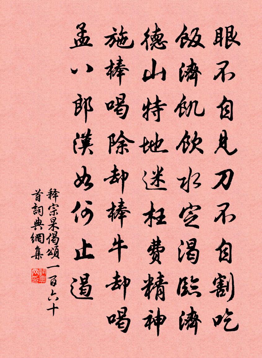 詩詞名句歷史字典書法欣賞書法字典國語詞典說文解字康熙字典古漢語字典標 題 作 者 詩 句 偈頌一百六十首作者:釋宗杲 朝代:宋代偈頌一百六十首原文眼不自見,刀不自割。吃飯濟飢,飲水定渴。臨濟德山特地迷,枉費精神施棒喝。除卻棒,牛卻喝,孟八郎漢,如何止遏。詩詞問答問:偈頌一百六十首的作者是誰?答:釋宗杲問:偈頌一百六十首寫於哪個朝代?答:宋代釋宗杲偈頌一百六十首書法欣賞偈頌一百六十首書法作品詩詞推薦潭上作張喬〔唐代〕竹島殘陽映翠微,雪翎禽過碧潭飛。人間未有關身事,每到漁家不欲歸。偈頌一百五十首釋心月〔宋代〕空手把鋤頭,步行騎水牛。人從橋上過,橋流水不流,動地清風來未休。咄,下座佛殿,別聽因由。月五日亦初五和吳沖卿鴉鳴樹石屏王安石〔宋代〕寒林昏鴉相與還,下有跂石蒼孱顏。曾於古圖見彷佛,已怪刀筆非人間。君家石屏誰為寫,古圖所傳無似者。鴉飛送蕭穎士赴東府,得淺字劉太沖〔唐代〕吾師繼微言,贊述在墳典。寸祿聊自資,平生宦情鮮。逶遲東州路,春草深復淺。日遠夫子門,中心曷由展。譙國嘲提壺晁補之〔宋代〕何處提壺鳥,荒園自 * 。夕陽深樾里,持此勸何人。清平樂晏幾道〔宋代〕波紋碧皺,曲水清明後。折得疏梅香滿袖,暗喜春紅依舊。歸來紫陌東頭,金釵換酒消愁。柳影深深細路,花梢小憶秦娥汪元量〔宋代〕水悠悠。長江望斷無歸舟。無歸舟。欲攜斗酒,怕上高樓。當年出塞擁貂裘。更聽馬上彈箜篌。彈箜篌。萬般哀怨題廣州光孝寺林衢〔宋代〕開池曾記虞翻苑,列樹今存建德門。無客不觀丞相硯,有人曾悟祖師幡。舊煎訶子泉猶冽,新種菩提葉又繁。無奈送陸侍御歸越盧方春〔宋代〕喈喈風雨余,出晝意何如。鏡里無慚色,囊中有諫書。寒崖立松柏,清廟失璠璵。海內看霜月,光明只似初。歇後宰相金朋說〔宋代〕歇後詩人何志誠,自量心跡甚詳明。世多覬竇穿窬者,對爾寧無愧赧情。探芳訊(湖上春遊,繼草窗韻)李彭老〔宋代〕對芳晝。甚怕冷添衣,傷春疏酒。正緋桃如火,相看自依舊。閒簾深掩梨花雨,誰問東陽瘦。幾多時,漲綠鶯枝,宴桃源/如夢令王之道〔宋代〕水外漫山桃李。那得箇中風味。一種最憐渠,酒著佳人半醉。還似。還似。驚起午窗春睡。簫丁謂〔宋代〕莊籟知天理,虞韶見帝心。輕清楊柳曲,和樂鳳凰音。翼展編筠密,中虛鏤玉深。吳門休鼓腹,仙侶好追尋。滿庭芳 贈張小仙馬鈺〔元代〕松峰之下,閒飲刀圭。薦杯火棗交梨。撫動心琴,鸞鶴上下爭飛。虎龍一齊哮吼,便唬回、六賊三屍。陰魔散,覺胡文昌和東坡子由彭城月詩並綠澹庵新州以所陳元晉〔宋代〕澹庵眼似坡仙高,眇視軒冕如秋毫。忠臣要作社稷計,那知平陸生風濤。當時蓋亦輕餘子,富貴轉頭真逝水。汗青寒食雨中用李希膺韻胡仲弓〔宋代〕平明風雨釀春寒,試把餳和杏酪餐。野祭人來悲冷節,郊行誰肯共吟鞍。煮茶有約泉堪品,禁火無條燧莫鑽。一百同微之贈別郭虛舟鍊師五十韻白居易〔唐代〕我為江司馬,君為荊判司。俱當愁悴日,始識虛舟師。師年三十餘,白皙好容儀。專心在鉛汞,餘力工琴棋。靜彈種木芙蓉張嵲〔宋代〕去歲經冬百卉空,今年多種木芙蓉。未如蜀國城邊望,疑是秋江渡口逢。定乏雄蜂來慰藉,應與進菊伴丰容。敢同感懷陸游〔宋代〕半年建安城,士友闕還往。出門每太息,還舍猶惝怳。有酒誰與傾,得句空自賞。疏直觸人情,低回泚吾顙。豈無山中雜興 其五王冕〔元代〕散處身如寄,幽棲屋似船。江鳴風落雨,山暗樹生煙。架有催詩簡,囊無貰酒錢。東鄰吳季子,瀟灑亦堪憐。名句推薦種田人,改習塵市生涯,定為敗路;讀書人,乾與衙門詞訟,便入下流。王永彬《圍爐夜話·第六十則》 東風吹水日銜山,春來長是閒。李煜《阮郎歸·呈鄭王十二弟》 金風細細。葉葉梧桐墜。晏殊《清平樂·金風細細》 日射人間五色芝,鴛鴦宮瓦碧參差。元好問《浣溪沙·日射人間五色芝》 梅花大庾嶺頭髮,柳絮章台街里飛。李商隱《對雪二首》 落葉他鄉樹,寒燈獨夜人。馬戴《灞上秋居》 政者正也。君為正,則百姓從政矣。戴聖《禮記·哀公問》 明月黃河夜,寒沙似戰場。李流芳《黃河夜泊》 俯皇都之宏麗兮,瞰雲霞之浮動。曹植《銅雀台賦》 是非只為多開口,煩惱皆因強出頭。佚名《增廣賢文·上集》