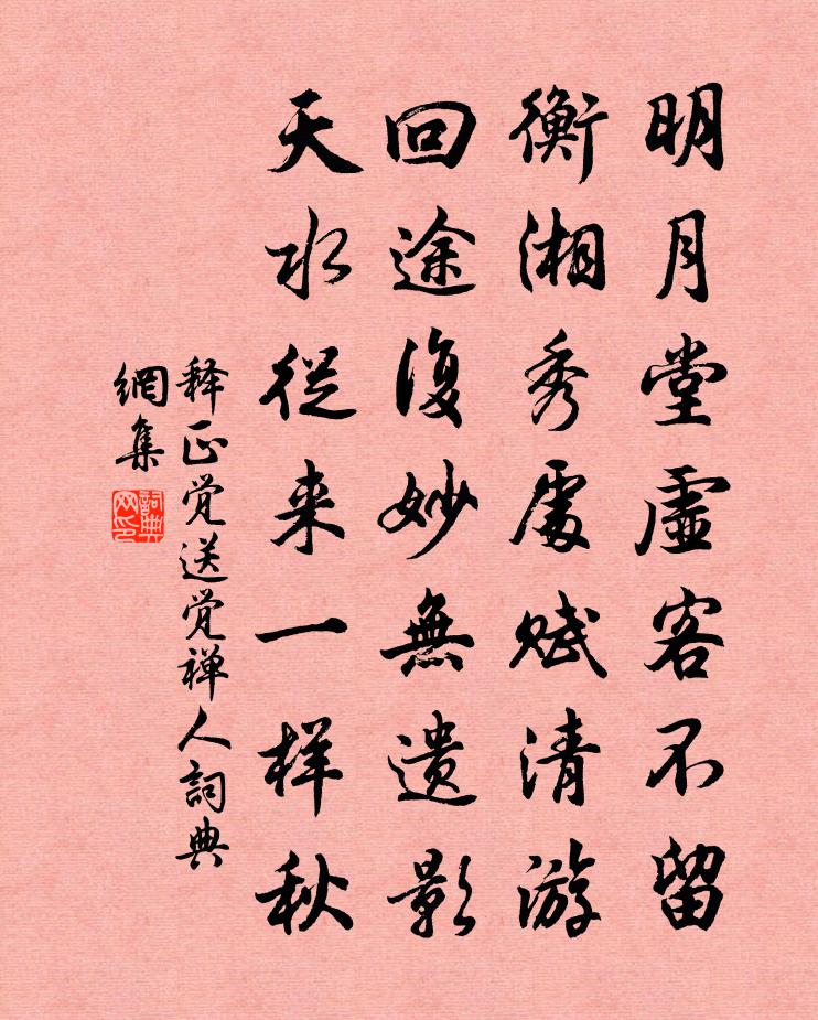 詩詞名句歷史字典書法欣賞書法字典國語詞典說文解字康熙字典古漢語字典標 題 作 者 詩 句 送覺禪人作者:釋正覺 朝代:宋代送覺禪人原文明月堂虛客不留,衡湘秀處賦清游。回途復妙無遺影,天水從來一樣秋。詩詞問答問:送覺禪人的作者是誰?答:釋正覺問:送覺禪人寫於哪個朝代?答:宋代釋正覺送覺禪人書法欣賞送覺禪人書法作品詩詞推薦過虎頭磯楊萬里〔宋代〕虎臥中流扼兩涯,目光須怒首仍回。真陽峽袖君須記,個是瞿塘灩澦堆。寄題真愛堂三首裘萬頃〔宋代〕築堂誰不要看山,往往襟期了不關。欲識此翁高絕處,一心長在白雲間。昨以拙詩十首寄西川杜相公,相公亦以新作十白居易〔唐代〕詩家律手在成都,權與尋常將相殊。剪截五言兼用鉞,陶鈞六義別開爐。驚人捲軸須知有,隨事文章不道無。篇數憑欄陸游〔宋代〕蟬嘒晚尤壯,鴉棲久未安。不成浮舴艋,故作憑闌乾。露重傾荷蓋,風尖蹙芡盤。新秋動歸思,更覺五湖寬。岩叟用前韻相留踐雲岩之約和韻以謝陳文蔚〔宋代〕屢陪軒騎過橫溪,每想雲岩望眼西。酬約再尋山下路,賦詩留與石間題。吟風弄月計為上,競利爭名著總低。明日登三山詩范雲〔南北朝〕仄徑崩且危。叢岩聳復垂。石藤多卷節。水樹繞蟠枝。海中昔自重。江上今如斯。宮詞宋白〔宋代〕御府書蹤字字奇,散教宮女倣來時。研精筆法難停穩,並恨義之與獻之。送李騎曹之靈武寧侍郎士元〔唐代〕一歲一歸寧,涼天數騎行。河來當塞曲,山遠與沙平。縱獵旗風卷,聽笳帳月生。新鴻引寒色,回日滿京城。甲辰仲冬八日元衡攜兩詩過訪及歸次韻酬送後張鎡〔宋代〕每針幽事當功名,唯欠能詩竹里僧。逕寫此篇為疏引,庵成來往豈無憑。和元遺山太山古句王奕〔宋代〕我來拜爭魯,舟過歌鳳台。登嶧仰東蒙,自謂高矣哉。及登東山頂,天級真難階。河瀆走罅漏,嵪陵塌埏垓。己大司戶朱君邂逅真州獨為予乾舳艫之具甚勤偶得晁說之〔宋代〕白眼波濤爭反覆,波心孤棹更誰看。夫君念此客逢鬢,不共青松共歲寒。實之有詩複次其韻黃公度〔宋代〕鞅掌從王事,招邀愧主人。彈琴秋葉落,聽雨夜床親。歲月何妨紀,詩篇莫厭頻。要令千載下,不但數姜秦。觀吳正獻真李廌〔宋代〕次公不許畫麒麟,孝宣妙選知名臣。拜公之像想風度,乃是雲台子顏之文孫。元豐天子建原廟,王宇萬棟臨端門。觀藏珠夏竦〔宋代〕敏手機心頗自安,遮藏有路巧千般。主公當面無因見,只怕旁人冷眼看。禪人寫真求贊釋正覺〔宋代〕眉低不愁,眼深非惡。鼻孔累垂,口唇齷齪。月明破夜兮野水懷秋,霽色摩霜閒雲投壑。能錯落縱橫十字兮,妙提元德皇后升袝一首真宗〔宋代〕協矣皇妣,德侔柔祗。升袝太室,協同之宜。耀彼寮冊,列之尊線。惟誠是厚,永佑慶基。上明達皇后冊寶五首真宗〔宋代〕秉翟竣事,萬舞摐金。總乾揮戚,節以鼓音。禮容有婁,肸鄉來歆。淑靈是聽,雅奏愔愔。諸葛公則延登書閣出示焦丈通直洎諸公所贈詩郭印〔宋代〕落泊粗官冷,婆娑小閣深。身勞常簿領,興在即山林。幽砌封苔暈,虛欞過竹陰。眼前無限意,清賞得知心。上侍御七兄王昌齡〔唐代〕天人俟明路,益稷分堯心。利器必先舉,非賢安可任。吾兄執嚴憲,時佐能釣深。春溪惡寄孫常川戴表元〔宋代〕春溪惡,日日春風吹過客。千車萬轍不相嫌,一客歌來吹倒卻。旁人借問客為誰,鹹淳朝士今布衣,聲名欲隱人自名句推薦一朵芙蕖,開過尚盈盈。蘇軾《江神子·江景》 木與木相摩則然,金與火相守則流莊子《莊子·雜篇·外物》 故人宿茅宇,夕鳥栖楊園。李白《之廣陵宿常二南郭幽居》 十五入漢宮,花顏笑春紅。李白《怨歌行》 殘燈明滅枕頭欹,諳盡孤眠滋味。范仲淹《御街行·秋日懷舊》 香幃風動花入樓,高調鳴箏緩夜愁。王昌齡《青樓怨》 手如柔荑,膚如凝脂佚名《碩人》 萋萋芳草憶王孫。柳外樓高空斷魂。李重元《憶王孫·春詞》 獨樹沙邊人跡稀,欲行愁遠暮鍾時韋應物《賦得沙際路送從叔象》 暖風熏得遊人醉,直把杭州作汴州。林升《題臨安邸》