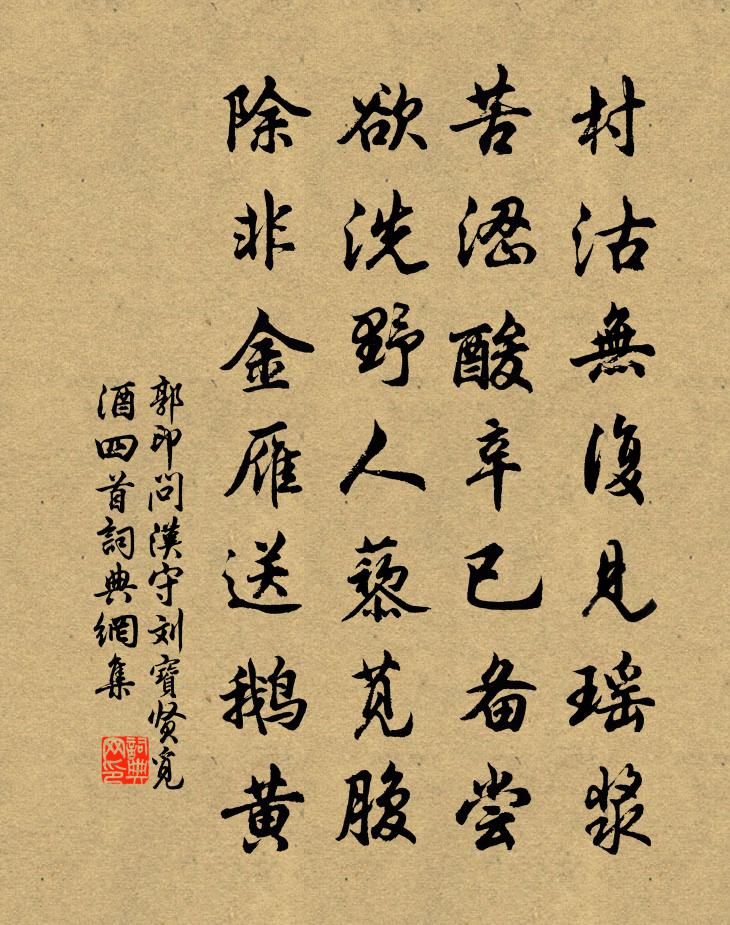 詩詞名句歷史字典書法欣賞書法字典國語詞典說文解字康熙字典古漢語字典標 題 作 者 詩 句 問漢守劉寶賢覓酒四首作者:郭印 朝代:宋代問漢守劉寶賢覓酒四首原文村沽無復見瑤漿,苦澀酸辛已備嘗。欲洗野人藜莧腹,除非金雁送鵝黃。詩詞問答問:問漢守劉寶賢覓酒四首的作者是誰?答:郭印問:問漢守劉寶賢覓酒四首寫於哪個朝代?答:宋代郭印問漢守劉寶賢覓酒四首書法欣賞問漢守劉寶賢覓酒四首書法作品詩詞推薦石仙觀張漢彥〔宋代〕蒼崖如壁立,神仙好岩居。杖藜往佳招,還與勝境俱。尋幽憩真館,訪古得遺書。傍有千尋木,中藏蟬蛻軀。終然蹋蹴篇楊維楨〔元代〕金鞭齊停馬上郎,落花旋風打毬場,繡輪擲過東家牆。東家牆,嗓雙燕;平頭奴,搖便面。偈頌一百三十六首釋惟一〔宋代〕今朝臘月二十五,明朝臘月二十六。風前唱起仰山歌,人皆道是雲門曲。宮詞張公庠〔宋代〕共惜流芳甚擲梭,初移夏琯已清和,百花飛盡酴醾發,留得春光數日多。上呂相公劉昌言〔宋代〕重名清望遍華夷,恐是神仙不可知。一舉首登龍虎榜,十年身到鳳凰池。廟堂只是無言者,門館長如未貴時。除卻八聲甘州元好問〔元代〕半仙亭籃輿雪中回,黃綢日高眠。兒婚女嫁,奴耕婢織,共有住山緣。夢裡松腴釀熟,竹港咽冰泉。萬古霜空月,次袁尚書巫山十二峰二十五韻錢鍪〔宋代〕文昌仙伯天人姿,愛山尋勝如書痴。忽摩台符歷參井,麾幢泝峽春遲遲。山林川後總效職,萬壑千岩俱獻奇。就中有感連文鳳〔宋代〕年來懶作少年狂,一枕功名屬夢鄉。舉世相夸唐字學,幾人曾識漢文章。自鄰晚歲桑榆景,敢入春風桃李場。到此尋橦歌王建〔唐代〕人間百戲皆可學,尋橦不比諸餘樂。重梳短髻下金鈿,紅帽青巾各一邊。身輕足捷勝男子,繞竿四面爭先緣。習多頌古十六首釋明辯〔宋代〕社舞村歌笑 * ,騎牛挑鴨走成群。三杯酒罷歸家去,留得豬頭礙塞人。過安吉城衛宗武〔宋代〕一年兩到吳興郡,夢想往時雲錦鄉。敗堞頹垣尚圍繞,雕梁畫楝總淒涼。蕭蕭適際風寒候,黯黯全無山水光。日暮文宣王及其弟子贊宋高宗〔宋代〕惟子有道,天與異容。狀雖雲惡,德則其豐。南止江沱,學者雲從。取士自茲,貌或非公。偈傾一百三十三首釋法薰〔宋代〕肥儱俑,無腹孔。不識字,有錢用。冬夜聞雁有感陸游〔宋代〕從軍昔戍南山邊,傳烽直照東駱谷。軍中罷戰壯士閒,細草平郊恣馳逐。洮州駿馬金絡頭,梁州球場日打球。玉杯宿前崗鋪楊冠卿〔宋代〕老去心猶壯,天邊歲欲除。喜行新過路,如讀未看書。溪水縈迴淨,人家遠近居。梅花正愁絕,薄暮雨疏疏。詠懷(一作詠情,一作感寓)孟郊〔唐代〕濁水心易傾,明波興初發。思逢海底人,乞取蚌中月。此興若未諧,此心終不歇。戲作舒岳祥〔宋代〕莫笑山居僻,山居號令明。芭蕉工報雨,鴝鵒解知更。樵長專封拜,詩壇擁甲兵。開窗一壺酒,新句賞新晴。和東林湛堂禪師喜雪韻五首袁燮〔宋代〕寂寞東林一老禪,殷勤念我惠佳篇。敢煩見在慈悲佛,為我投誠過去仟。田舍二首劉克莊〔宋代〕源里人家太古時,爭為雞黍款漁師。下山莫向城中說,第一休教太守知。寄題潭帥王樞使佚老堂范成大〔宋代〕孺子滄浪濯纓處,千載新堂來卜鄰。潦收無波徹底靜,東湖之水堂中人。蒙陽花譜勝洛下,竹西藥闌來海瀕。新篁名句推薦誰問旗亭,美酒斗十千。賀鑄《行路難·縛虎手》 碧野朱橋當日事,人不見,水空流。秦觀《江城子·西城楊柳弄春柔》 三春白雪歸青冢,萬里黃河繞黑山。柳中庸《征人怨 / 征怨》 靜女其姝,俟我於城隅。佚名《靜女》 形影忽不見,翩翩傷我心。曹植《雜詩六首·其一》 三更月。中庭恰照梨花雪。賀鑄《子夜歌·三更月》 天長路遠魂飛苦,夢魂不到關山難。李白《長相思·其一》 三千年事殘鴉外,無言倦憑秋樹。吳文英《齊天樂·與馮深居登禹陵》 曲屏先暖鴛衾慣,夜寒深、都是思量。吳文英《風入松·為友人放琴客賦》 我歌君起舞,潦倒略相同。陳師道《除夜對酒贈少章》