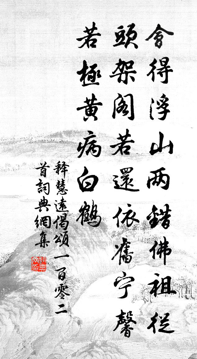 詩詞名句歷史字典書法欣賞書法字典國語詞典說文解字康熙字典古漢語字典標 題 作 者 詩 句 偈頌一百零二首作者:釋慧遠 朝代:宋代偈頌一百零二首原文會得浮山兩錯,佛祖從頭架閣。若還依舊寧馨,若極黃病白鶴。詩詞問答問:偈頌一百零二首的作者是誰?答:釋慧遠問:偈頌一百零二首寫於哪個朝代?答:宋代釋慧遠偈頌一百零二首書法欣賞偈頌一百零二首書法作品詩詞推薦八聲甘州(丙寅中秋對月)向子諲〔宋代〕掃長空、萬里靜無雲,飛鏡上天東。欲騎鯨與問,一株丹桂,幾度秋風。取水珠宮貝闕,聊為洗塵容。莫放素娥去真宗奉聖祖玉清昭應宮十一首真宗〔宋代〕芳氣上浹,飈馭下臨。紹承丕緒,永勱精明。氤氳成霧,蔥在垂陰。虔恭對越,介祉攸欽。次韻趙仲績久雨夜坐有感二首韓元吉〔宋代〕十日風斜雨更橫,一春能得幾新晴。便須蠟屐穿花去,葛惜障泥傍水行。酒興未妨隨處發,詩狂賸判隔年程。醉來【般涉調】哨遍_張五牛、商楊立齋〔元代〕張五牛、商正叔編《雙漸小卿》,趙真卿善歌,立齋見楊玉娥唱其曲,因作〔鷓鴣天〕及〔哨遍〕以詠之。 【元日次良翰韻黃公度〔宋代〕老去低徊強北游,春來訊息望南州。別離況復年華換,富貴難令少壯留。行李未知何處定,屠蘇還解憶人不。可堪青雲乾呂令狐楚〔唐代〕鬱郁復紛紛,青霄乾呂雲。色令天下見,候向管中分。遠覆無人境,遙彰有德君。瑞容驚不散,冥感信稀聞。湛露送沙彌長文游京皎然〔唐代〕白版年猶小,黃花褐已通。若為詩思逸,早欲似休公。邁俗多真氣,傳家有素風。應須學心地,宗旨在關東。初八日早出洪澤閘泛淮虞儔〔宋代〕乾道年中再講和,當時議者厭干戈。長淮不管蛟龍怒,巨艦寧容鵝鸛過。歲晚民方愁道路,天寒我亦困風波。中流李允成次彥博韻見示仍用韻答之三首李流謙〔宋代〕挽眉聊卓魯,高步故夔龍。倦翮閒霜鶚,蒼棱老澗松。只應安小試,正自恥先容。泚筆書三異,他山玉可攻。山居陳必復〔宋代〕接砌斜通徑,緣籬矮結牆。地卑蝸篆壁,山暖蜜分房。過雨林亭靜,落花春晝長。幽居差省事,猶有課詩忙。南歌子(王清叔會同舍賞蓮花,席間命官奴索詞)姚述堯〔宋代〕羅蓋輕翻翠,冰姿巧弄紅。晚來習習度香風。疑是華山仙子、下珠宮。柳外神仙侶,花間錦繡叢。競將玉質比芳容獻曹南院曹瑕幕客〔宋代〕賢守新成蓋代功,臨危方始見英雄。三都谷路全師入,十萬胡塵一戰空。殺氣尚疑橫塞外,捷音相繼彷環中。君王偈頌一百零四首釋紹曇〔宋代〕鐵團欒,無縫罅。上下三指,彼此七馬。德山臨濟,眼見如盲,雲門趙州,口說如啞。拄杖子,忍俊不禁,等閒捉金陵雜興二百首蘇泂〔宋代〕壓架荼醾百萬枝,月邊花下更漣漪。三更比屋皆高枕,如此清涼棄不知。梨花晁說之〔宋代〕春到梨花意更長,好將素質殿紅芳。若為寄與江南客,枉是楊梅憶庚郎。郊廟歌辭。武后大享拜洛樂章。歸和佚名〔唐代〕言旋雲洞兮躡煙途,永寧中宇兮安下都。包涵動植兮順榮枯,長貽寶貺兮贊璇圖。送孫公素機宜書記赴太原劉龍圖之辟強至〔宋代〕夕樓清嘯卻妖氛,越石并州晉史雲。威望裔孫行破敵,美名才子去從軍。關榆礙馬陰初合,塞草迎人綠自薰。幕下水調歌頭(餞吳漕)趙善括〔宋代〕浩嘆對青史,循吏久無聞。二年江右,賴公華節布陽春。才自搴帷問俗,無復埋輪當道,一路盡澄清。多少攀轅意燈下讀書陸游〔宋代〕少年喜書策,白首意未足。幽窗燈一點,樂處超五欲。而況黃州路,小雨漁村宿。蕭蕭蒹葭聲,為我洗暑毒。琅然錢倅生日林宗放〔宋代〕煌煌我宋開鰲極,坐攬輿圖朝列避。玉帛爭先萬國趨,吳越歸心天下一。聖神論報天與同,富貴不獨昌其躬。建隆名句推薦近寒食人家,相思未忘苹藻香。史達祖《壽樓春·尋春服感念》 相思不管年華,喚酒吳娃市。吳文英《荔枝香近·送人游南徐》 芳草無情,更在斜陽外范仲淹《蘇幕遮·懷舊》 凝恨對殘暉,憶君君不知。韋莊《菩薩蠻》 千里萬里,二月三月,行色苦愁人。歐陽修《少年游·欄乾十二獨憑春》 秋風蕭瑟天氣涼,草木搖落露為霜,群燕辭歸鵠南翔。曹丕《燕歌行二首·其一》 江上晚來堪畫處,釣魚人一蓑歸去。馬致遠《壽陽曲·江天暮雪》 昨夜西風凋碧樹,獨上高樓,望盡天涯路。晏殊《蝶戀花·檻菊愁煙蘭泣露》 喃喃教言語,一一刷毛衣。白居易《燕詩示劉叟》 得成比目何辭死,願作鴛鴦不羨仙。盧照鄰《長安古意》