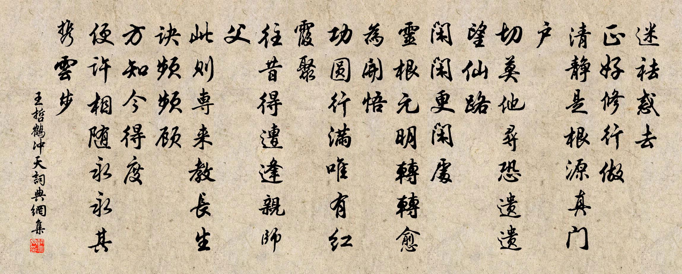 詩詞名句歷史字典書法欣賞書法字典國語詞典說文解字康熙字典古漢語字典標 題 作 者 詩 句 鶴沖天作者:王哲 朝代:元代鶴沖天原文迷祛惑去。正好修行做。清靜是根源,真門戶。切莫他尋,恐遺遺望仙路。閒閒更閒處。靈根元明,轉轉愈為開悟。功圓行滿,唯有紅霞聚。往昔得遭逢,親師父。此則專來教長生訣,頻頻顧。方知今得度。便許相隨,永永其攜雲步。詩詞問答問:鶴沖天的作者是誰?答:王哲問:鶴沖天寫於哪個朝代?答:元代問:鶴沖天是什麼體裁?答:詞王哲鶴沖天書法欣賞鶴沖天書法作品詩詞推薦雜詠二首羅公升〔宋代〕胡羯寧知分,中原欲並驅。設兵生建武,堪與赤眉俱。偈頌二百零五首釋正覺〔宋代〕一人之父,百王之師。道機有餘兮,動若四時。壽域無疆兮,量同二儀。大功不宰,至化無為。妙兮雖喻,智也不訪明公大德韓偓〔唐代〕寸發如霜袒右肩,倚肩筇竹貌怡然。懸燈深屋夜分坐,移榻向陽齋後眠。刮膜且揚三毒論,攝心徐指二宗禪。清涼偈頌七十一首釋了惠〔宋代〕舉步生荊棘,翻身墮嶮崖。一毫不動著,當處自沉埋。回雁峰齊己〔唐代〕瘴雨過孱顏,危邊有徑盤。壯堪扶壽岳,靈合置仙壇。影北鴻聲亂,青南客道難。他年思隱遁,何處憑闌乾。建溪十詠其七大中塔楊億〔宋代〕雞園開淨土,雁塔倚寒空。風鐸和清梵,晴幡映彩虹。香花傾海國,金碧擬天宮。絕頂登臨處,谿山一掌中。春晚雨中廖行之〔宋代〕綠楊庭院雨如絲,已是梅林欲熟時。慚愧春工起歸興,向來節物彼何知。春日雜興胡仲弓〔宋代〕淨掃山房不似貧,旋炊野飯喚比鄰。子規啼處一村雨,芍藥開時三逕春。丘壑自成安樂國,漁樵尚有老成人。茅檐二月社日到都門見花卉初發宋庠〔宋代〕走馬東來冒驛塵,今年重識帝城春。自憐已作衰瓮熊,苑樹宮花笑 * 。八月十二夜至十六夜皆無月賦詩三首趙蕃〔宋代〕月向中秋俟,陰從一夕愆。望中孤老眼,暗裡聳吟肩。燈婢深留照,桃笙冷廢眠。思兮在何許,有夢隔山川。山中三首劉應時〔宋代〕伏櫪已無千里志,臥雲聊作一枝棲。田翁笑喜桑麻長,山北山南雨意低。輓歌詩陸機〔魏晉〕卜擇考休貞。嘉命鹹在茲。夙駕警徒御。結轡頓重基。龍(左巾右荒)被廣柳。前驅矯輕旗。殯宮何嘈嘈。哀響沸菩薩蠻王之望〔宋代〕華燈的皪明金碧。玳筵劇飲杯餘濕。珠翠隔房櫳。微聞笑語通。蓬瀛知已近。青鳥仍傳信。應為整雲鬟。教儂倒玉河朔吟范仲淹〔宋代〕太平燕趙許閒遊,三十從知壯士羞。敢話詩書為上將,猶憐仁義對諸侯。子房帷幄方無事,李牧耕桑合有秋。民得春秋戰國門楚懷王周曇〔唐代〕不聽陳軫信張儀,六里商於果見欺。既舍黔中西換得,又令生去益堪悲。上平江徐侍郎十絕句曾協〔宋代〕露華先遣麴塵收,要產英豪奠九州。織女槎回逢八月,老人星見恰中秋。祀雨師樂章。送神包佶〔唐代〕整駕升車望寥廓,垂陰薦祉盪昏氛。饗時靈貺僾如在。樂罷餘聲遙可聞。飲福陳誠禮容備,撤俎終獻曙光分。跪拜旅懷釋文珦〔宋代〕客路何當極,家林久未還。只今明鏡里,又覺鬢毛斑。夜雨添春水,寒雲沒曉山。強吟無好思,佳句也應慳。夜雨陸游〔宋代〕寒雨連三夕,幽居只數椽。家貧輕過節,身老怯增年。日月悲歌里,關山淚眼邊。梅花自開落,嘆息為誰妍?蘇才翁輓辭二首王安石〔宋代〕空餘一丹旐,無復兩朱轓。寂寞蒜山渡,陂陀京口原。音容歸繪畫,才業付兒孫。尚有故人淚,滄江相與翻。名句推薦阿婆還似初笄女,頭未梳成不許看。袁枚《遣興》 每圓處即良宵,甚此夕偏饒,對歌臨怨。吳文英《玉漏遲·瓜涇度中秋夕賦》 問姓驚初見,稱名憶舊容。李益《喜見外弟又言別》 雨歇梧桐淚乍收,遣懷翻自憶從頭。納蘭性德《浣溪沙·雨歇梧桐淚乍收》 星月皎潔,明河在天,四無人聲,聲在樹間。歐陽修《秋聲賦》 常將有日思無日,莫待無時思有時。馮夢龍《警世通言·卷二十五》 人之生不能無群荀子《荀子·富國》 佇倚危樓風細細。望極春愁,黯黯生天際。柳永《蝶戀花·佇倚危樓風細細》 殘雪庭陰,輕寒簾影,霏霏玉管春葭。王沂孫《高陽台·和周草窗寄越中諸友韻》 花落花開自有時,總賴東君主。嚴蕊《卜運算元·不是愛風塵》