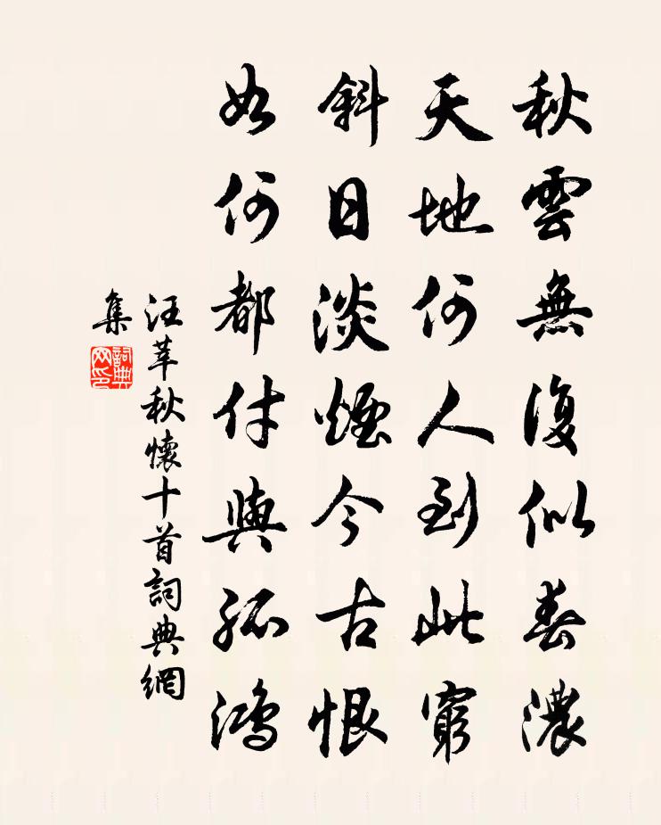 詩詞名句歷史字典書法欣賞書法字典國語詞典說文解字康熙字典古漢語字典標 題 作 者 詩 句 秋懷十首作者:汪莘 朝代:宋代秋懷十首原文秋雲無復似春濃,天地何人到此窮。斜日淡煙今古恨,如何都付與孤鴻。詩詞問答問:秋懷十首的作者是誰?答:汪莘問:秋懷十首寫於哪個朝代?答:宋代汪莘秋懷十首書法欣賞秋懷十首書法作品詩詞推薦下第別郜扶馬戴〔唐代〕窮途別故人,京洛泣風塵。在世即應老,他鄉又欲春。平生空志學,晚歲拙謀身。靜話歸休計,唯將海上親。秋曉周端臣〔宋代〕一抹涼煙曉未收,露籬疏雨濕牽牛。不知天上秋多少,昨夜西風到小樓。生查子 獨游西岩辛棄疾〔宋代〕青山招不來,偃蹇誰憐汝。歲晚太寒生,喚我溪邊住。山頭明月來,本在高高處。夜夜入清溪,聽讀離騷去。謝公擇舅分賜茶三首黃庭堅〔宋代〕細題葉字包青箬,割取丘郎春信來。拚洗一春湯餅睡,亦知清夜有蚊雷。詩品二十四則。縝密司空圖〔唐代〕是有真跡,如不可知。意象欲生,造化已奇。水流花開,清露未晞。要路愈遠,幽行為遲。語不欲犯,思不欲痴。和王種高遺丁求安二詩王洋〔宋代〕光祿文章寄小詩,愛閒不是傲當時。扁舟時過西溪曲,端為平居有所思。明堂慶成恭進詩文天祥〔宋代〕於皇藝祖德乘乾,聖主宣光奕葉前。運再庚申皇建極,祀同癸亥數參天。中嚴外辦三千禮,累洽重熙四十年。願贊憶江南劉辰翁〔宋代〕花幾許,已報八分催。卻問主人何處去,且容老子箇中來。花外主人回。年時客,如今安在哉。正喜錦宮城爛漫,小池宋祁〔宋代〕細溜沙渠逗曲池,碧潯餘潤漬蚌衣。風休浪靜如圓鑒,時有文禽照影飛。菩薩蠻(般涉調)張先〔宋代〕藕絲衫翦猩紅窄。衫輕不礙瓊膚白。縵鬢小橫波。花樓東是家。上湖閒蕩槳。粉艷芙蓉樣。湖水亦多情。照妝天底靜女春曙曲李賀〔唐代〕嫩蝶憐芳抱新蕊,泣露枝枝滴夭淚。粉窗香咽頹曉雲,錦堆花密藏春睡。戀屏孔雀搖金尾,鶯舌分明呼婢子。冰洞建康懷古金朋說〔宋代〕石頭城下炬燒寒,司馬東來骨肉殘。可惜六朝花粉地,年年風雨草漫漫。答貢甫酌騏驥池上見詒韓維〔宋代〕金行戰陽暑未北,炎郁填胸汗流液。空堂大祖不可度,欲取清風自湔滌。耽耽華廄列官守,對起二亭嚴案席。天渠夏日飲山亭劉因〔元代〕借住郊園舊有緣,綠陰清晝靜中便。空鉤意釣魚亦樂,高枕臥遊山自前。露引松香來酒盞,雨催花氣潤吟箋。人來讀眉山集次韻雪詩五首王安石〔宋代〕戲搖微縞女鬟鴉,試咀流酥已頰車。歷亂稍埋冰揉粟,消沉時點水圓花。豈能舴艋真尋我,且與蝸牛獨臥家。欲挑春日次韻張叔元王之道〔宋代〕遲日輕風過雨天,草青南陌欲生煙。江湖節物登王鮪,村落歸心起杜鵑。已辦尋芳游野寺,何當修禊泛溪船。路逢遣興陸游〔宋代〕平生與俗馬牛風,落魄人間亦未窮。綠綺奏終香縷碧,烏絲書罷燭花紅。夢中吳蜀山川近,醉後周秦戰伐空。投老淳祐祭海神十六首佚名〔宋代〕祝融之位,貴乎三神。吞納江漢,廣大無垠。長安委輪,祐我黎民。敬陳明享,允鑒恭勤。獨坐郡圃北齊宋庠〔宋代〕宿雨催秋物,清風卷歲華。殘蜩初去柳,寒蝶尚尋花。密篠留蒼霧,紅梨染落霞。城頭 * 子,日昃亂啼鴉。送明甫赴銅鉛場六言七首劉克莊〔宋代〕化蝶但貪睡美,舐犢尚為愛牽。三年不見心痗,十日無書眼穿。名句推薦日暮長江里,相邀歸渡頭。儲光羲《江南曲四首》 蕃甲鎖蛇鱗,馬嘶青冢白。李賀《塞下曲》 萬里不惜死,一朝得成功。高適《塞下曲》 樓倚霜樹外,鏡天無一毫。杜牧《長安秋望》 白頭空負雪邊春,著意問春春不語。劉鎮《玉樓春·東山探梅》 愁因薄暮起,興是清秋發。孟浩然《秋登蘭山寄張五》 淮水東邊舊時月,夜深還過女牆來。劉禹錫《金陵五題·石頭城》 握手一長嘆,淚為生別滋蘇武《留別妻》 儻寄相思字,愁人定解顏。錢起《送夏侯審校書東歸》 四海十年兵不解,胡塵直到江城。陳克《臨江仙·四海十年兵不解》